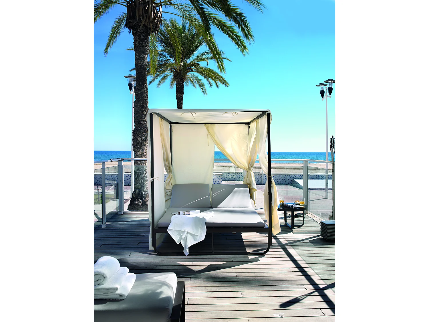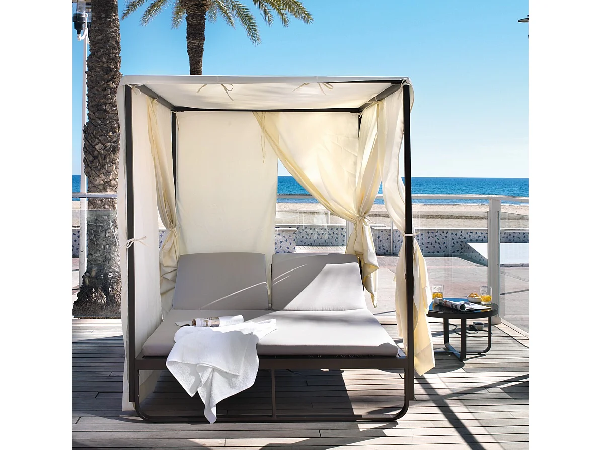 Chaise longue double marron, rideaux écru et coussin couleur lin