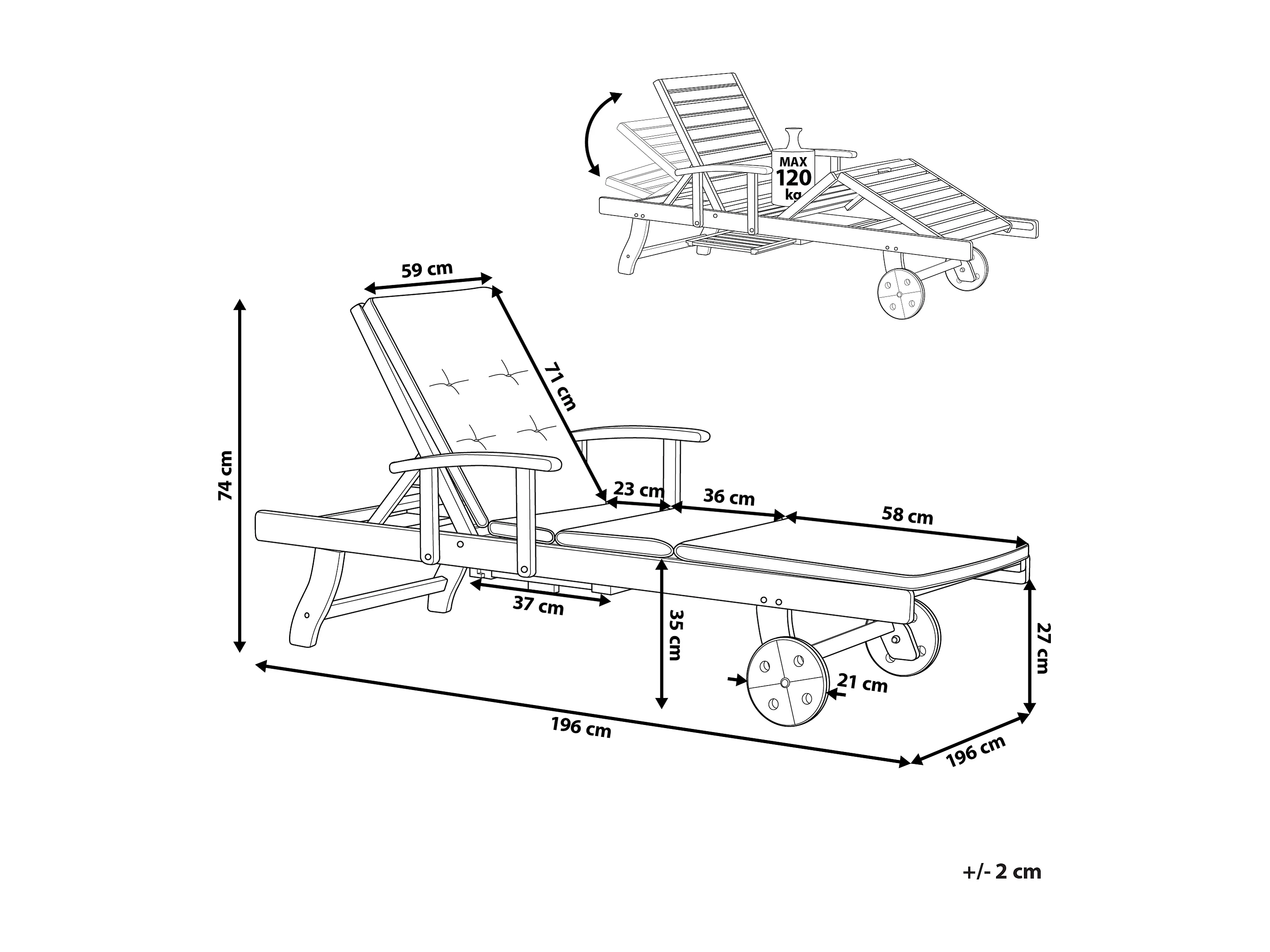 Chaise longue inclinable en bois d'acacia et coussin taupe AMANTEA