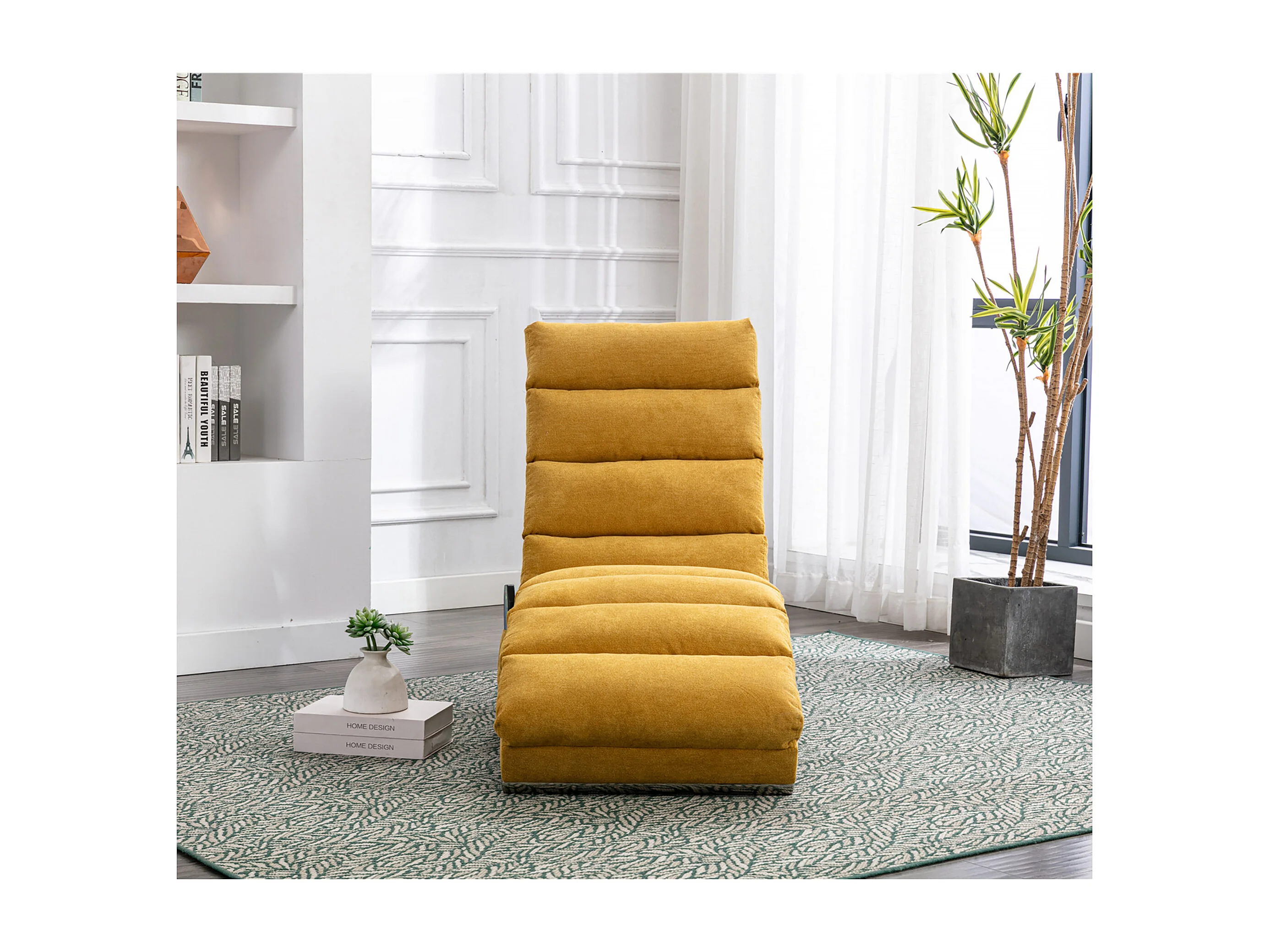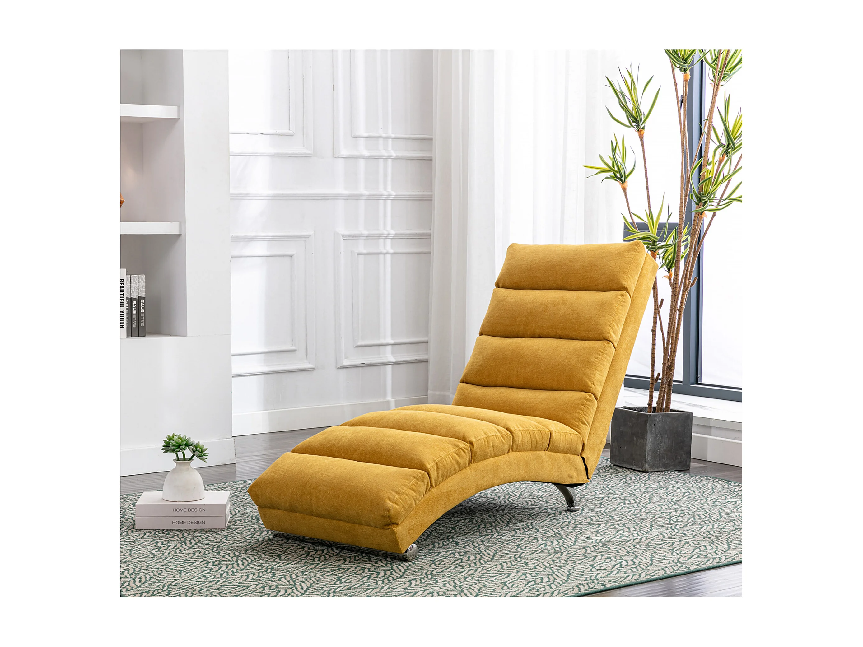 Chaise longue massante avec télécommande, tissu en lin, 5 modes de massage, couleur jaune moutarde (148x55x87 cm)