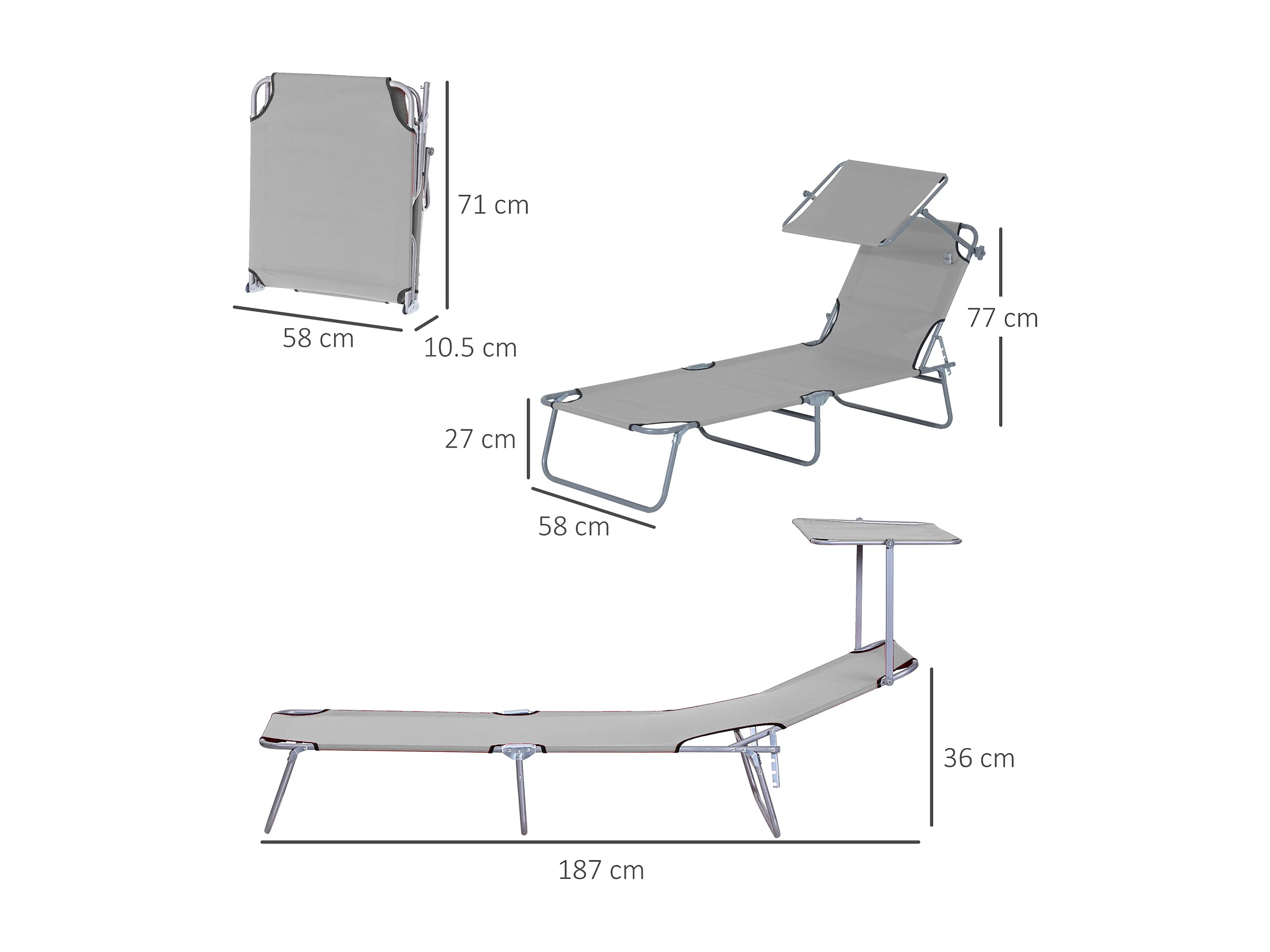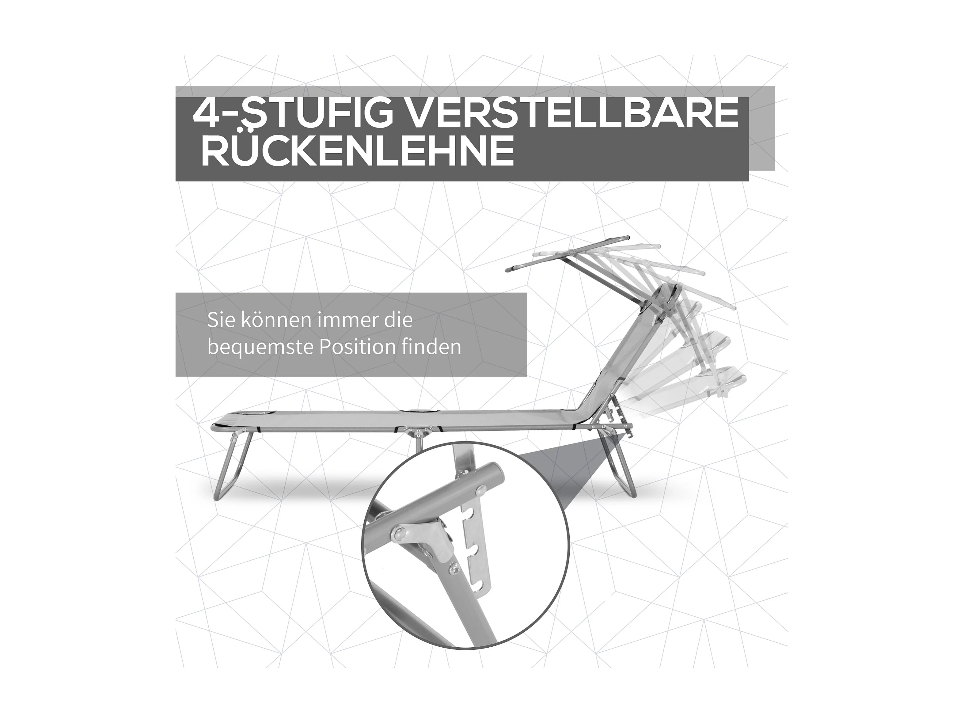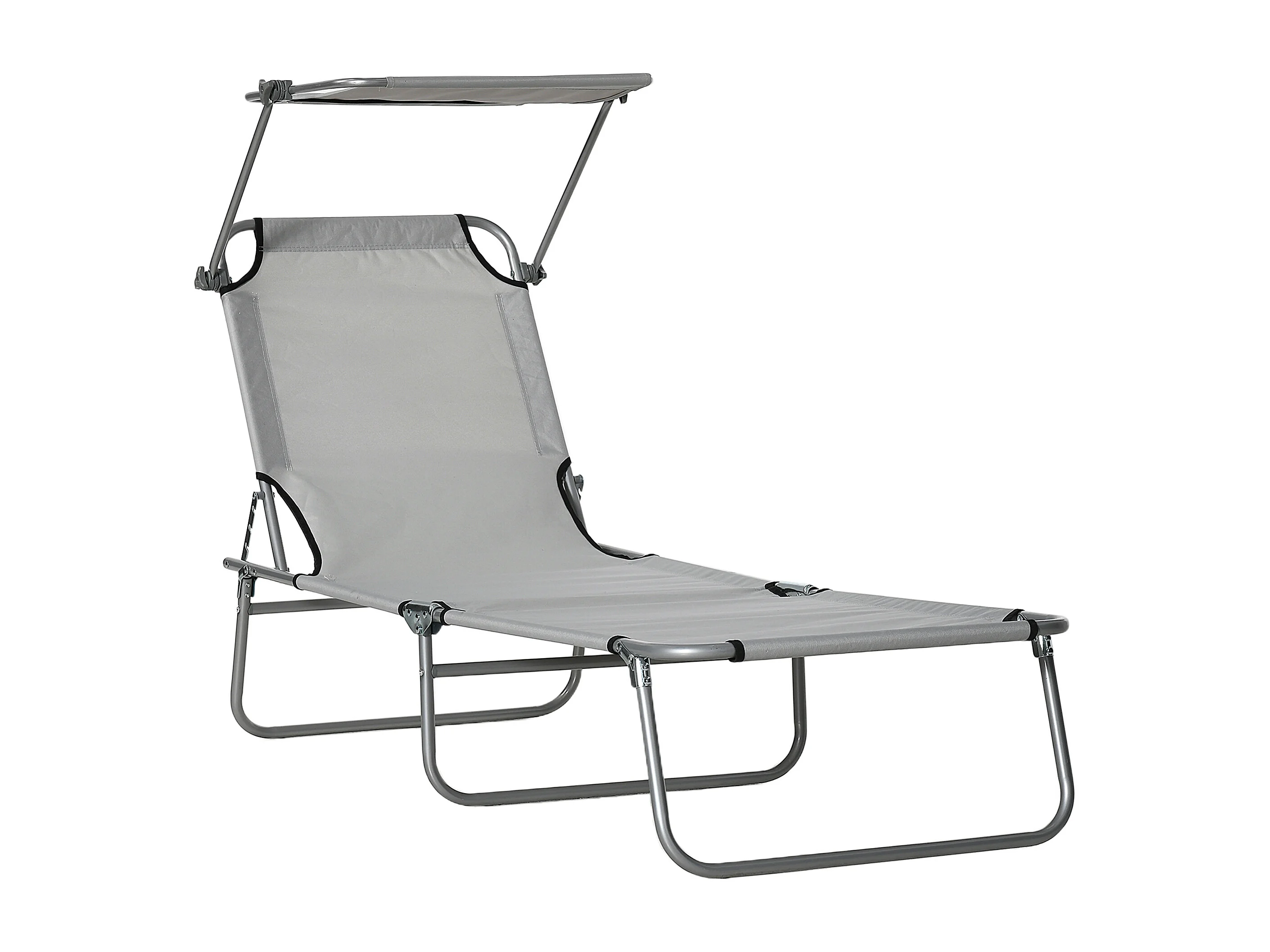 Chaise longue pliante avec toit, métal, gris clair, dossier réglable en 4 positions (187x58x36 cm)