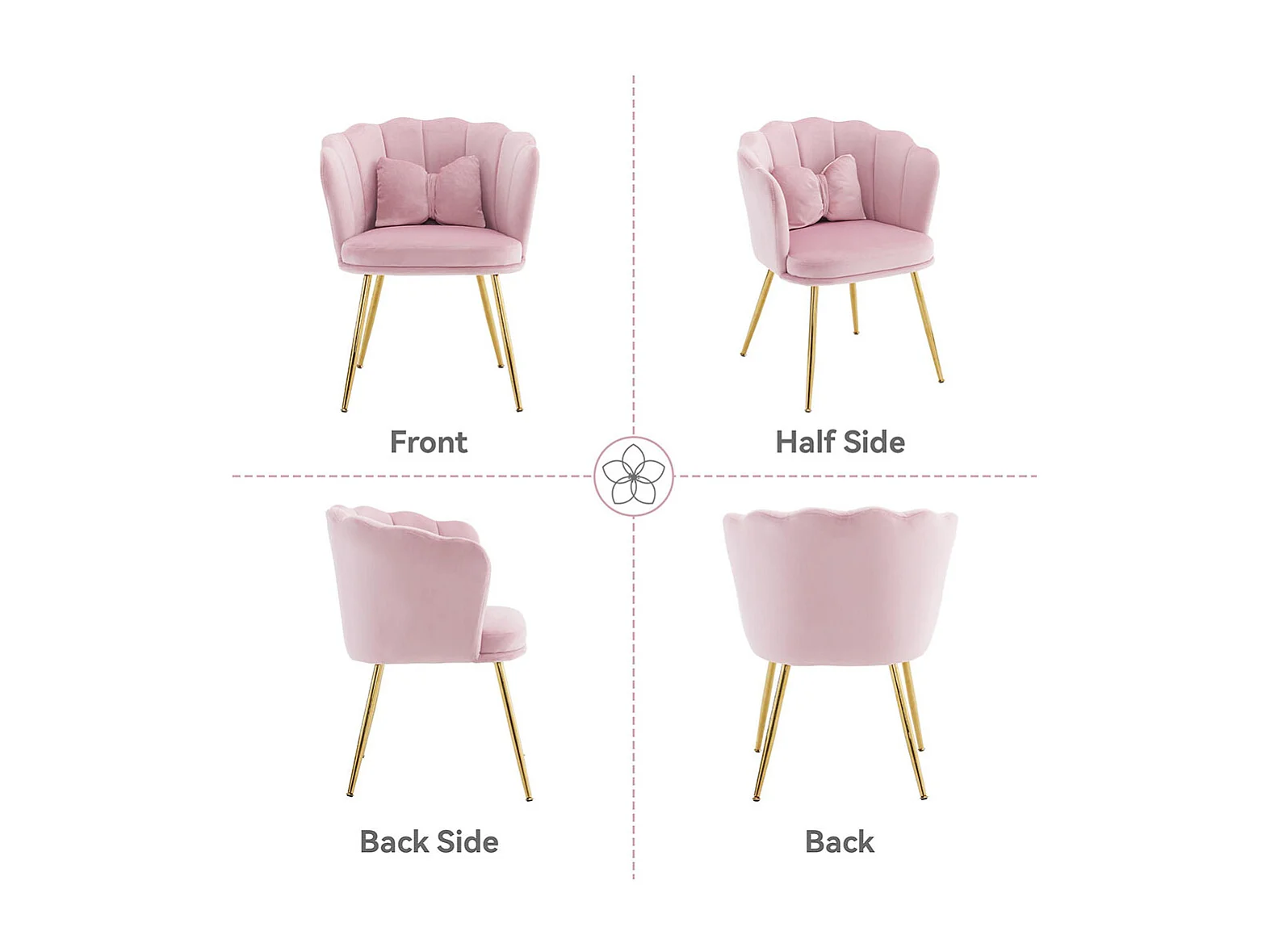 Chaise Lot de 6 rembourrées avec dossier en forme de pétale de pieds en métal doré et de coussins en forme de papillon Rose