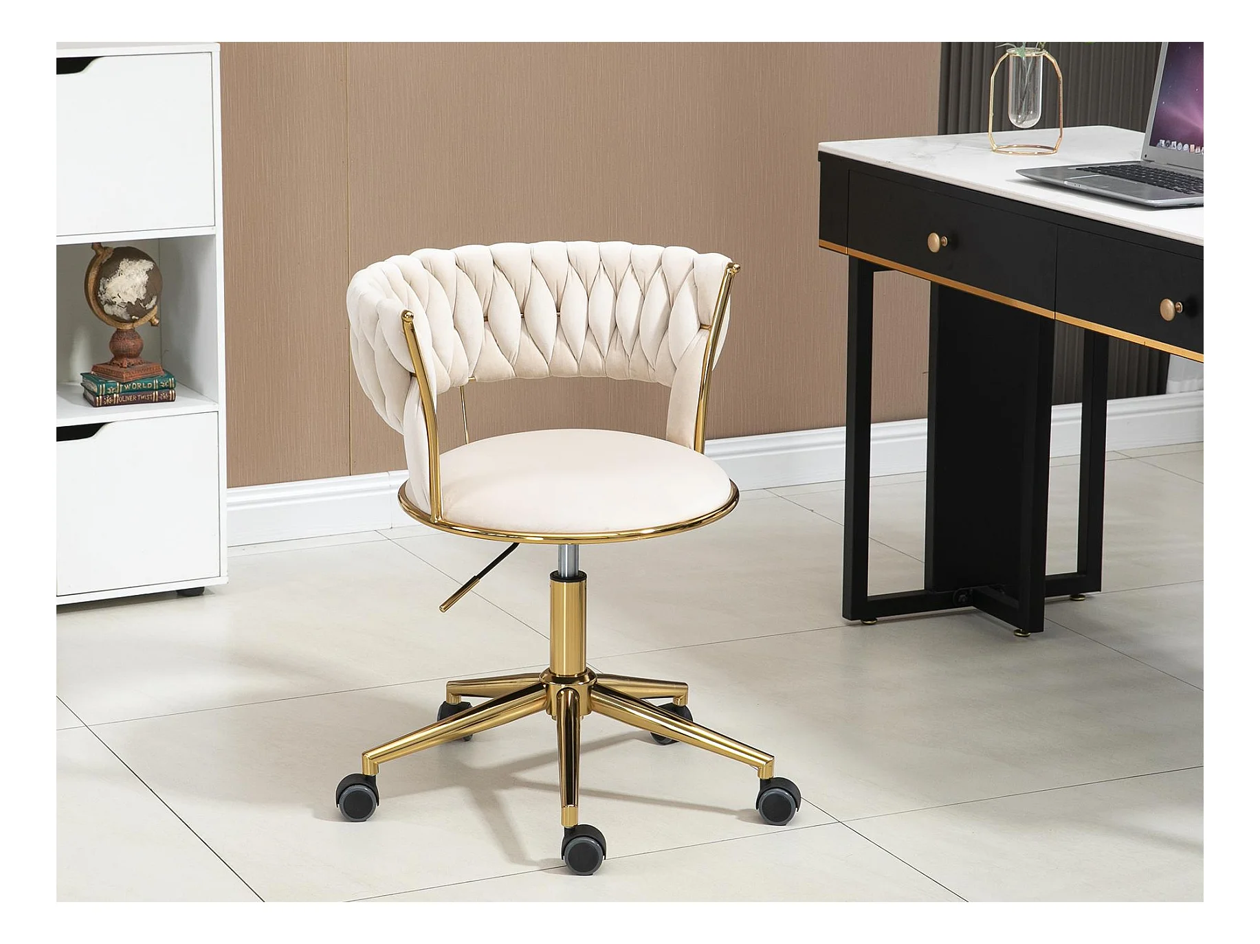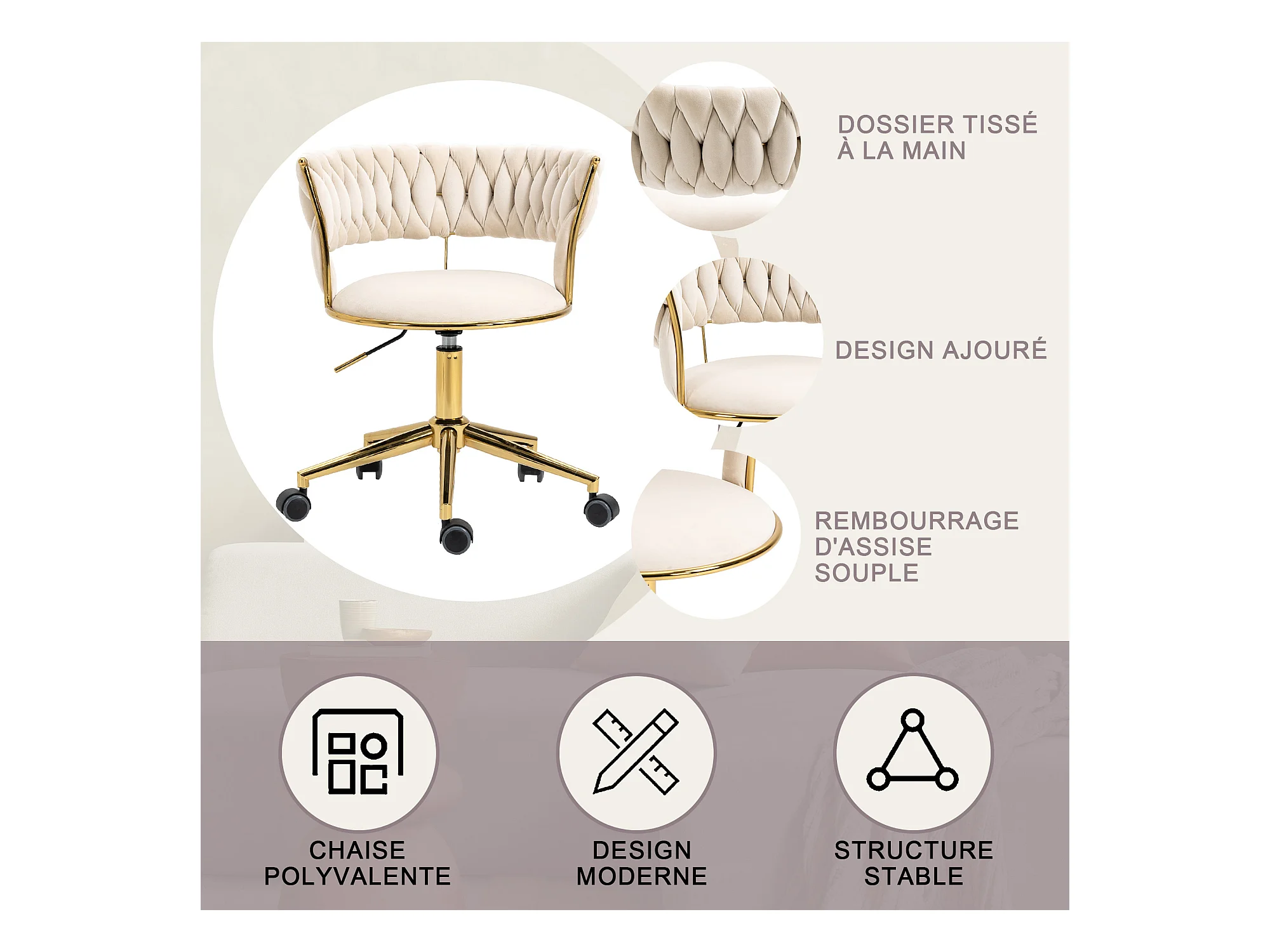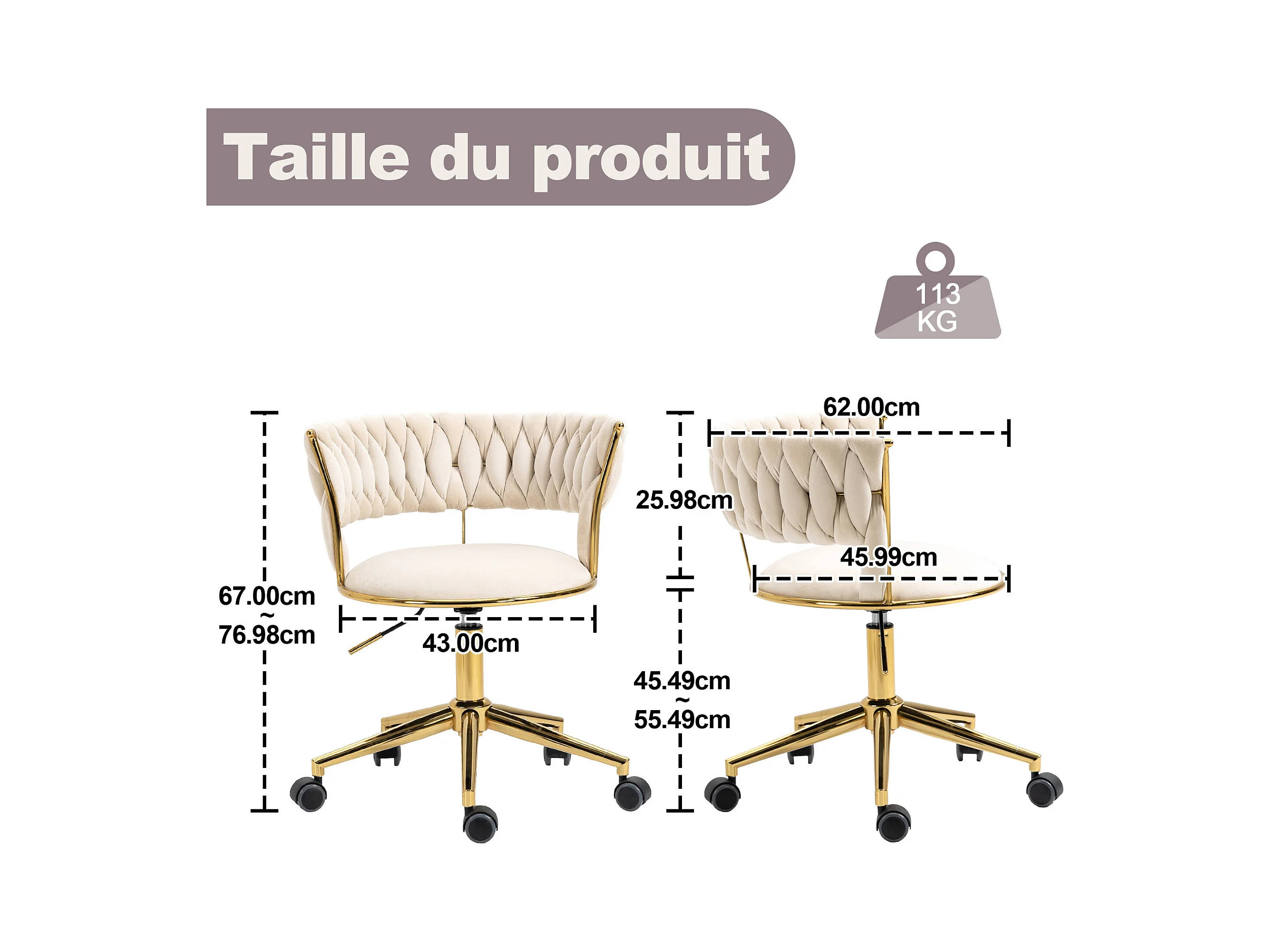 Chaise pivotant — tressage beige — structure métallique dorée — découpe taille ajourée — réglable en hauteur — multi‑usage