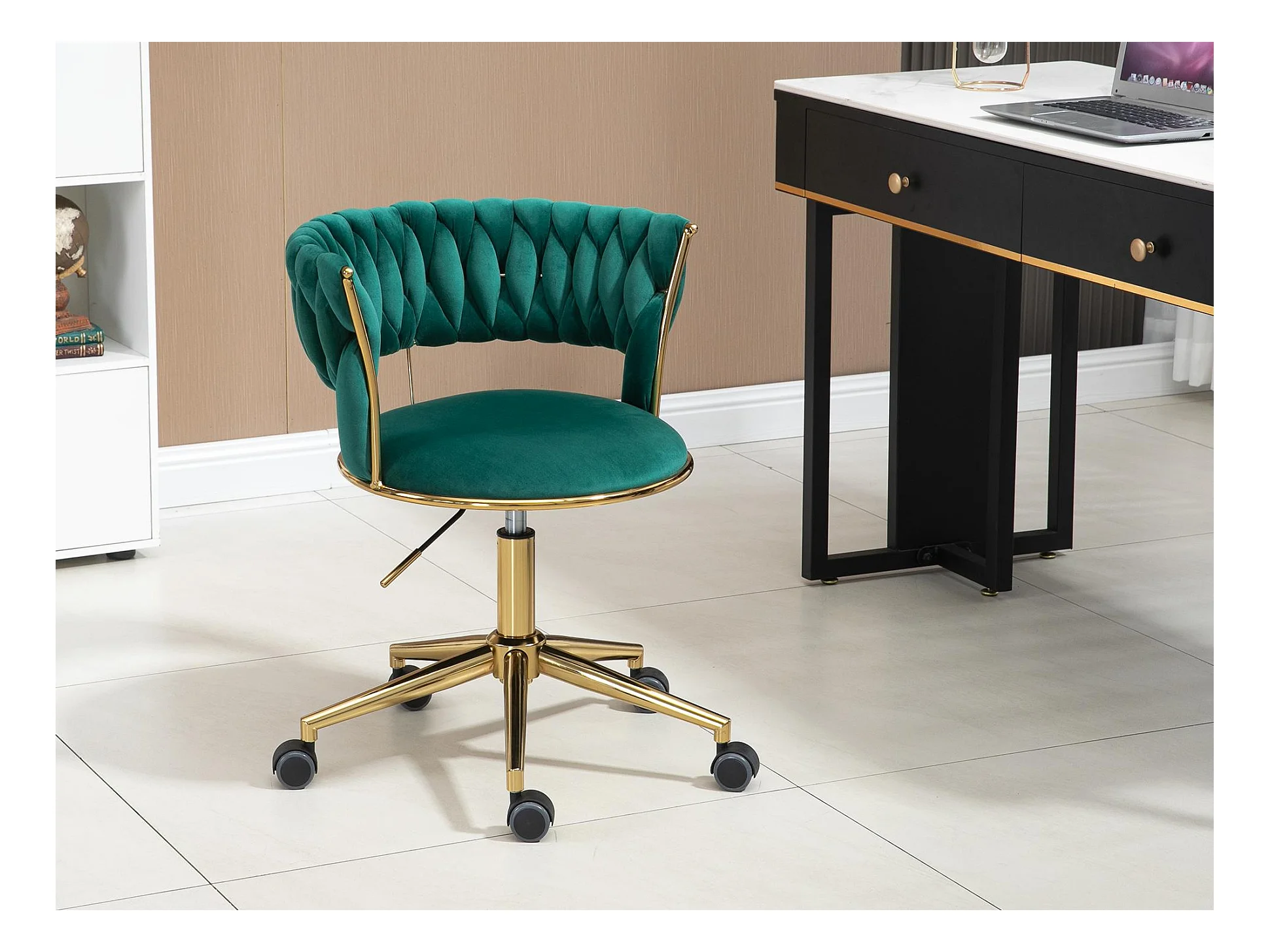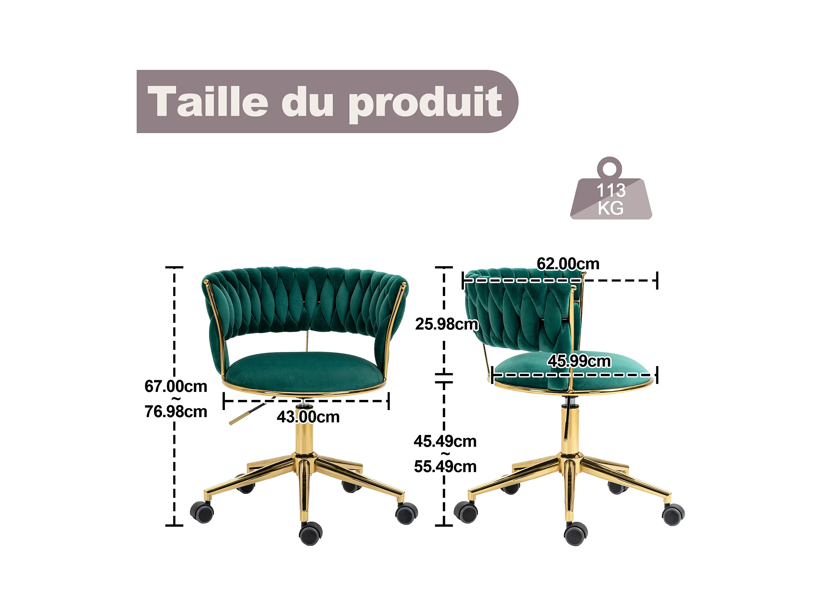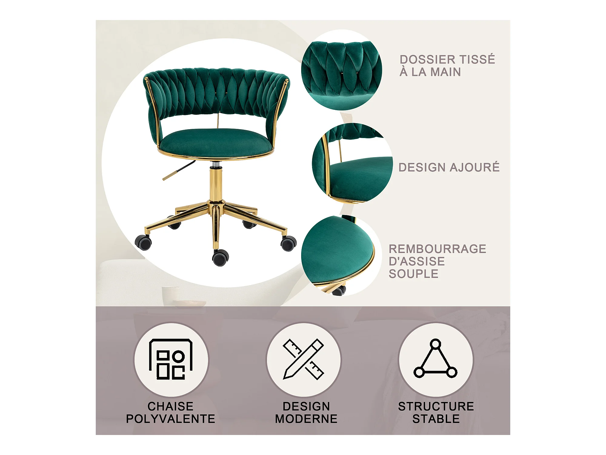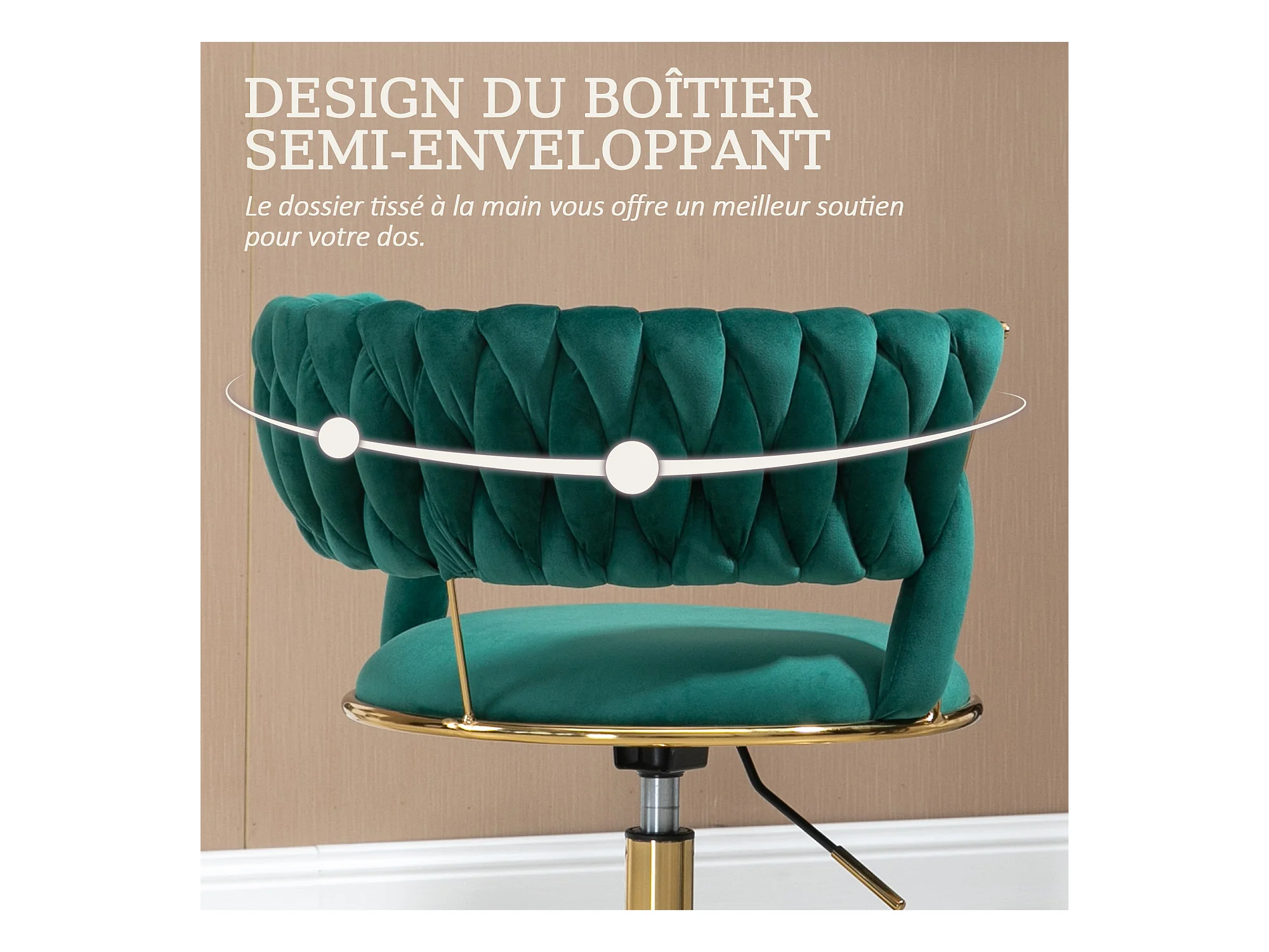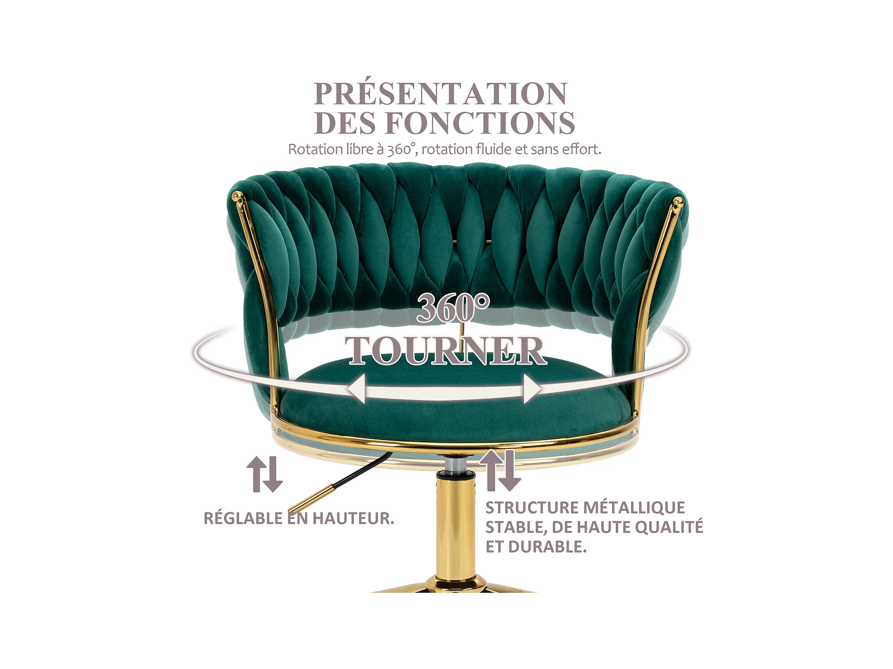 Chaise pivotant — tressage vert — structure métallique dorée — découpe taille ajourée — réglable en hauteur — multi‑usage