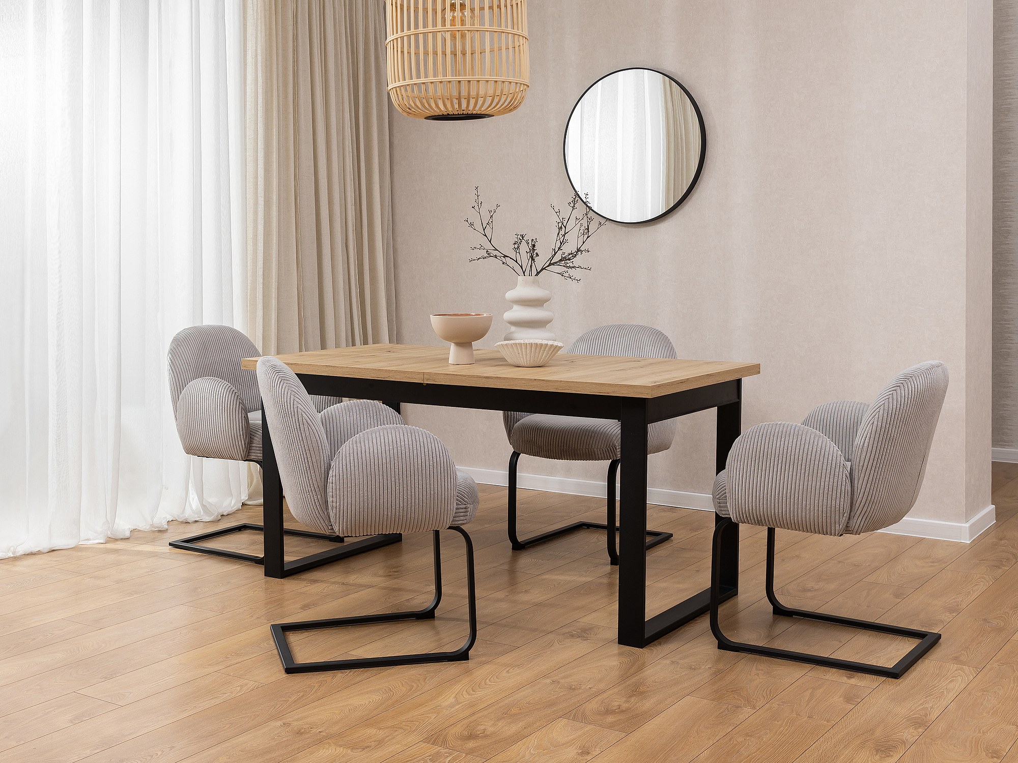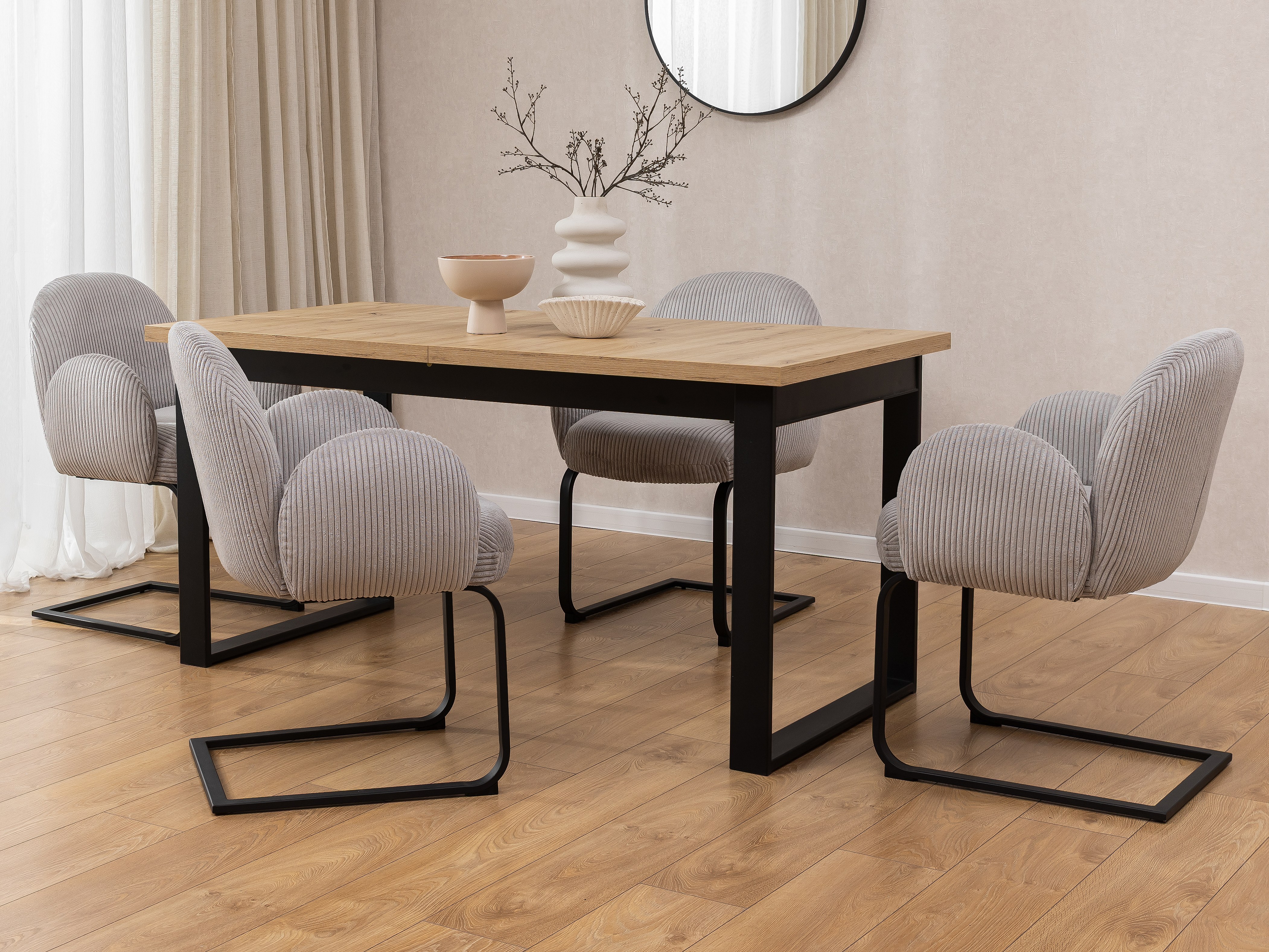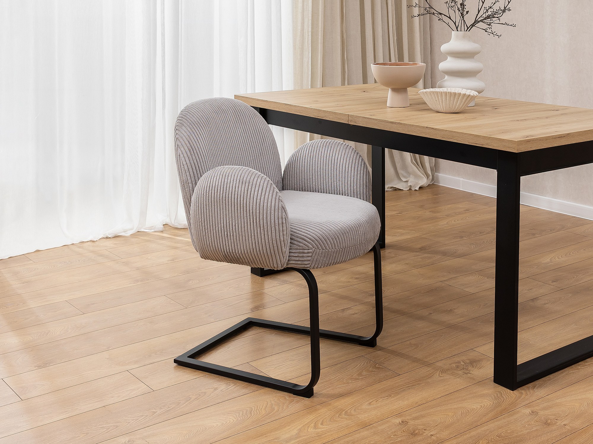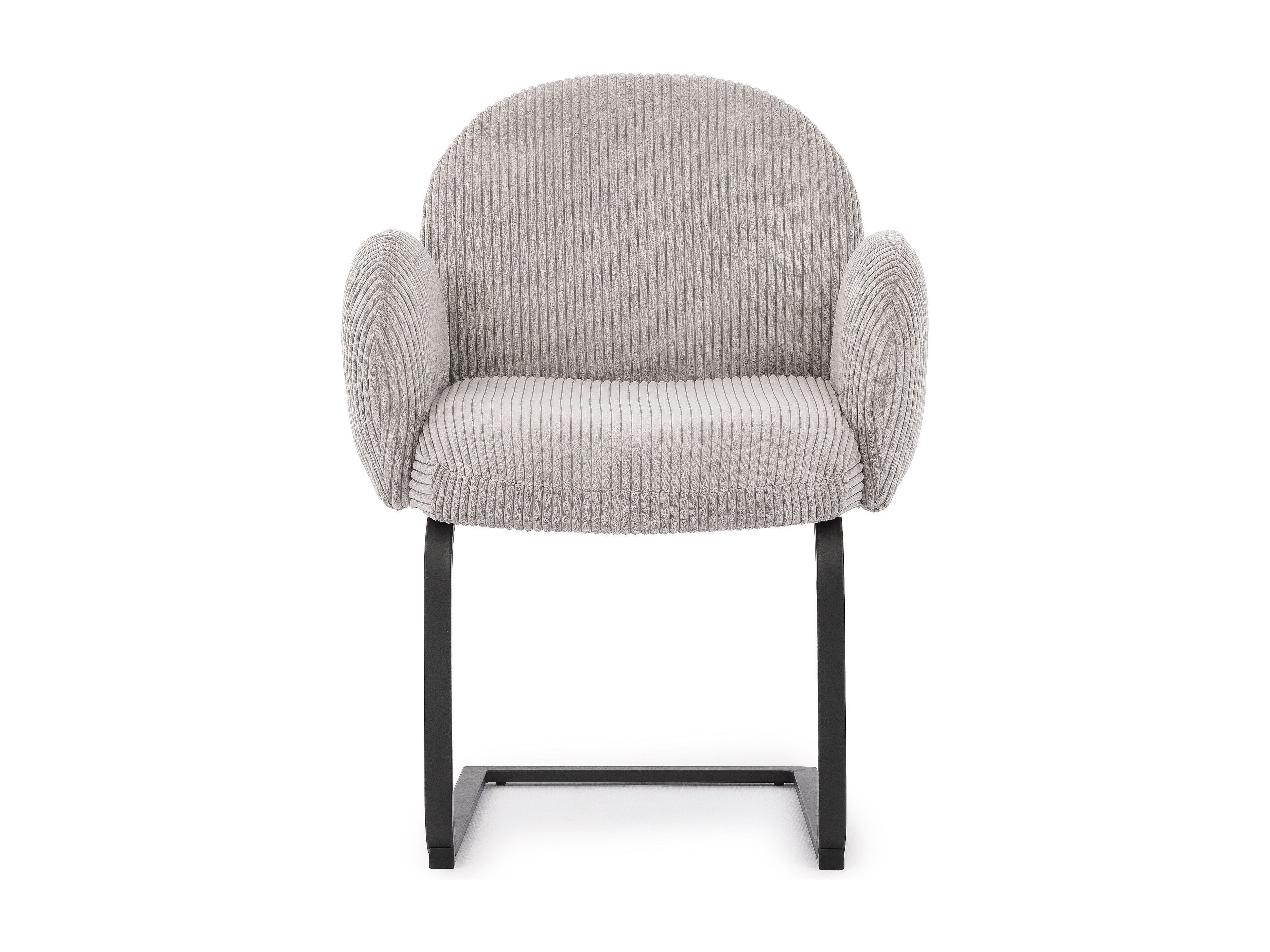 Chaise rembourrée de style Japandi au design arrondi, en velours côtelé gris avec une structure en métal noir - Vela