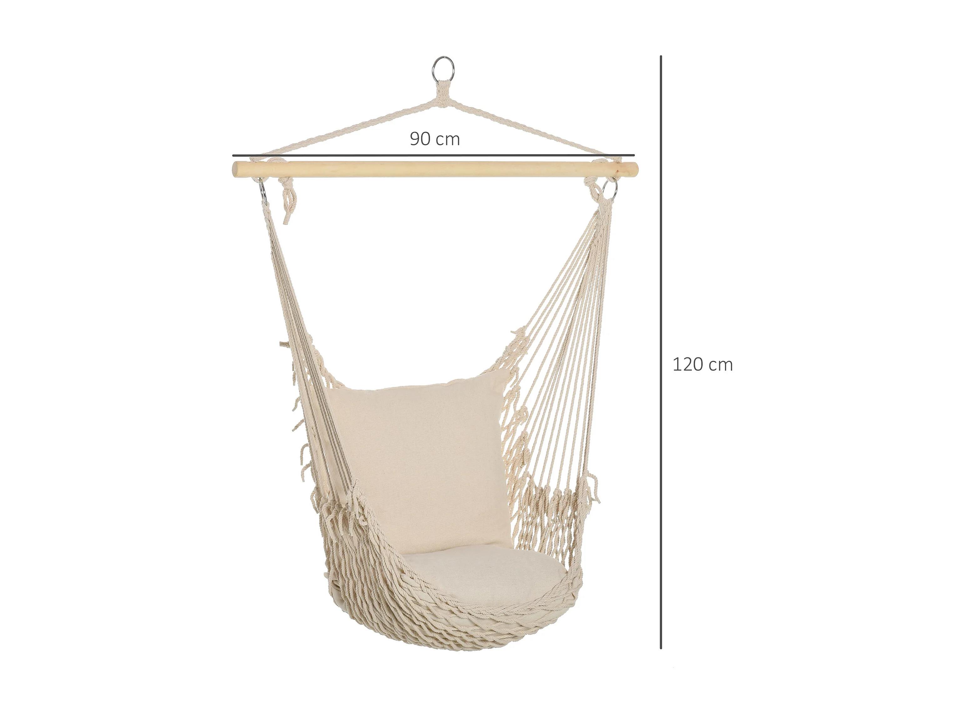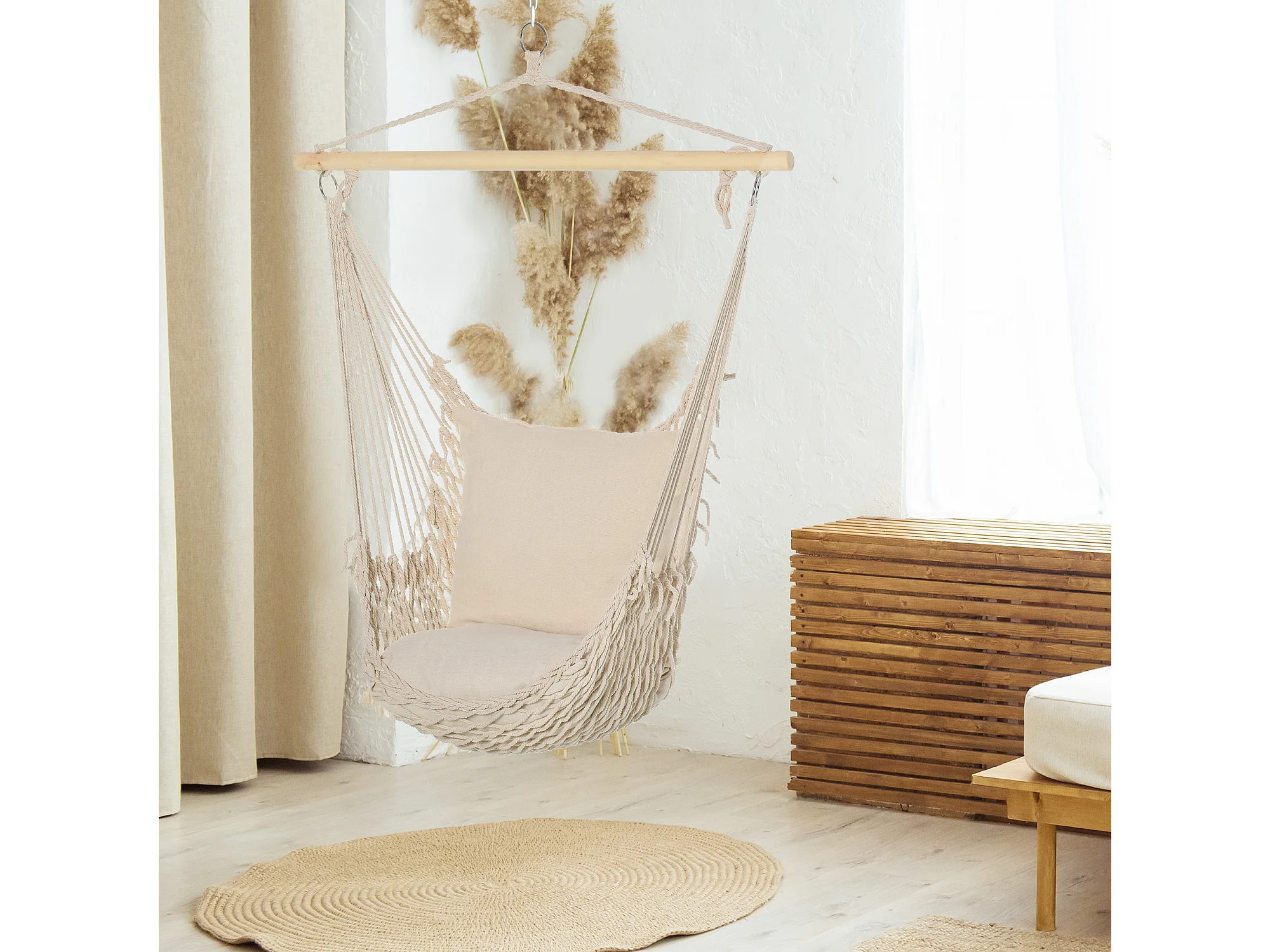 Chaise suspendue - fauteuil suspendu - assise dossier rembourrés - bois macramé tissu beige