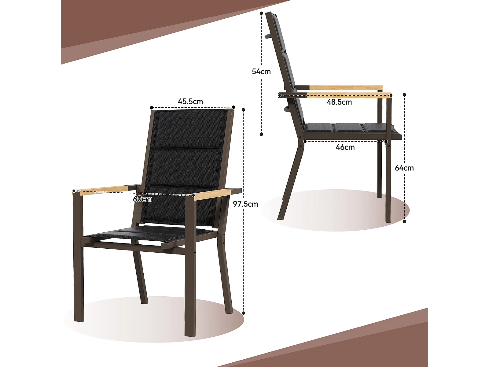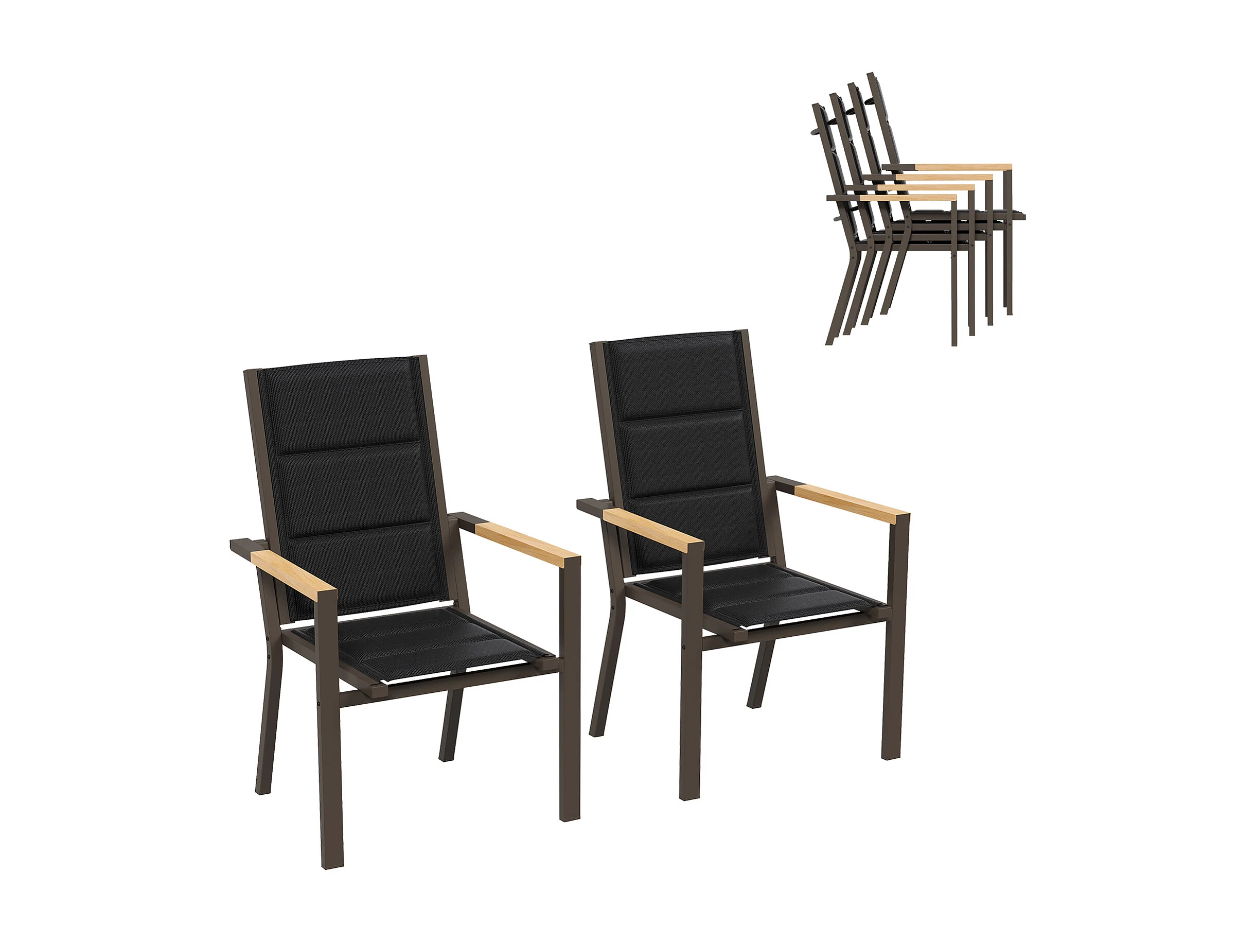 Chaises de Jardin - Lot de 2 Empilables en Aluminium, Dossier Haut avec Accoudoirs Imitation Bois, Tissu Tessilium Confortable, Marron