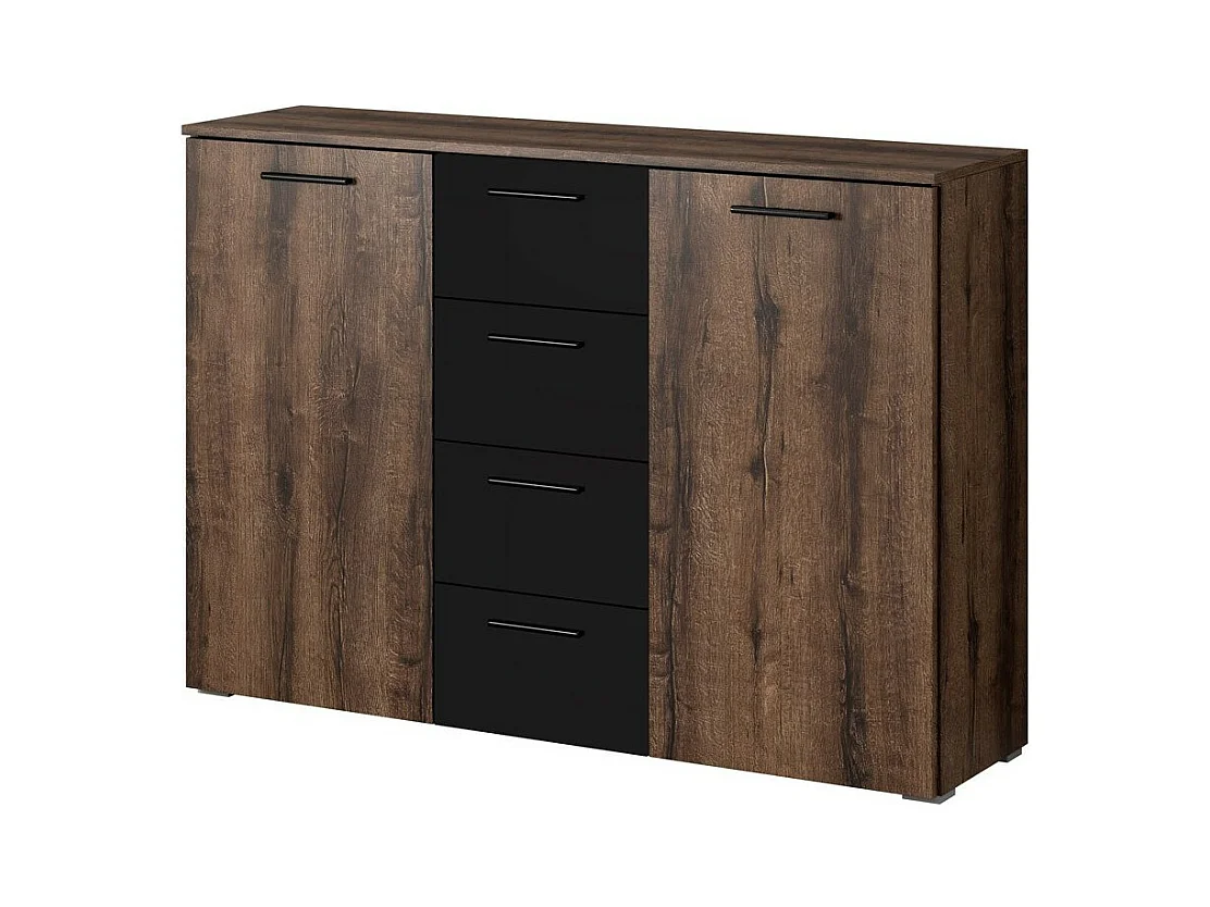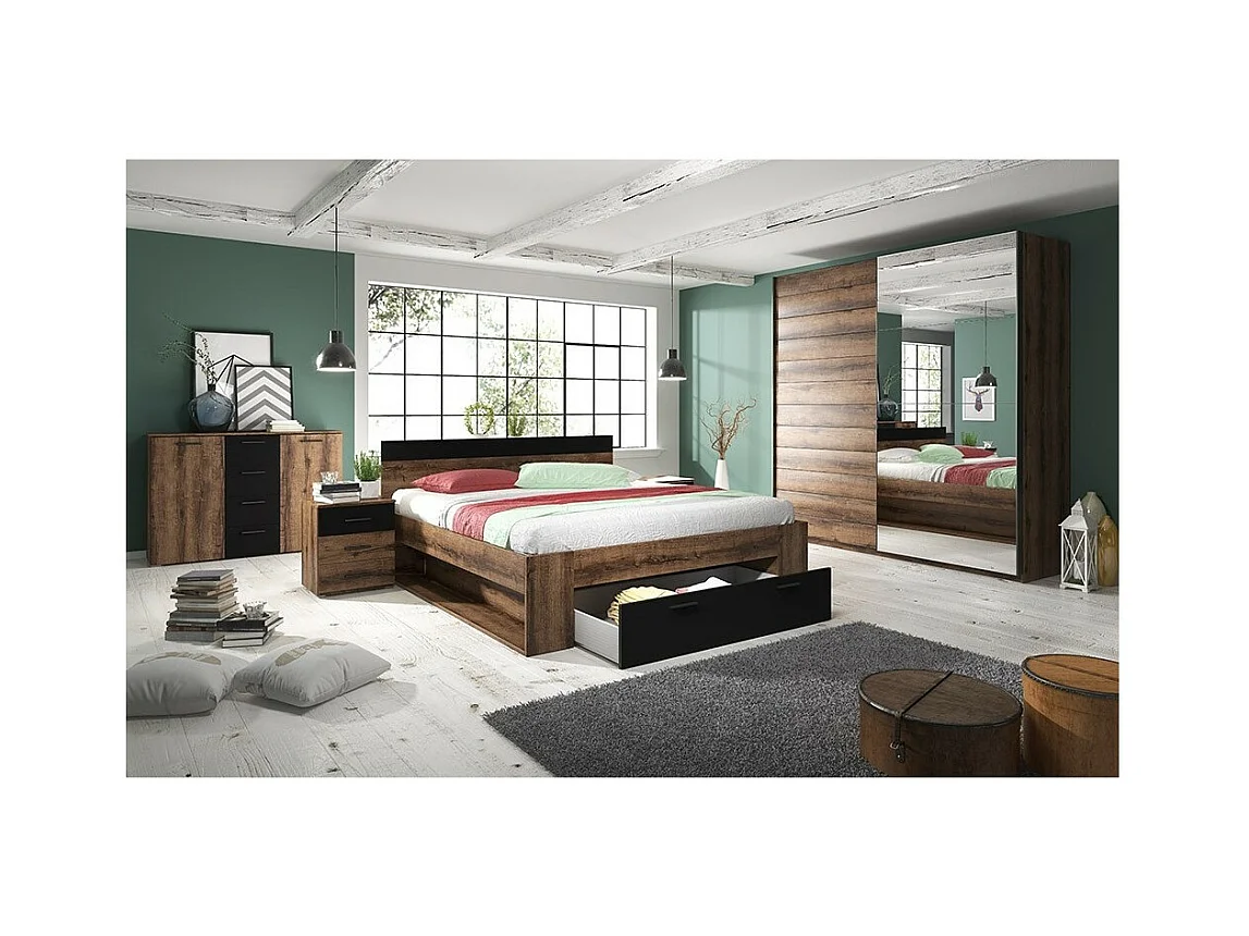 Chambre à coucher EOS : Armoire, Lit 160x200, commode, chevets. Couleur chêne foncé et noir