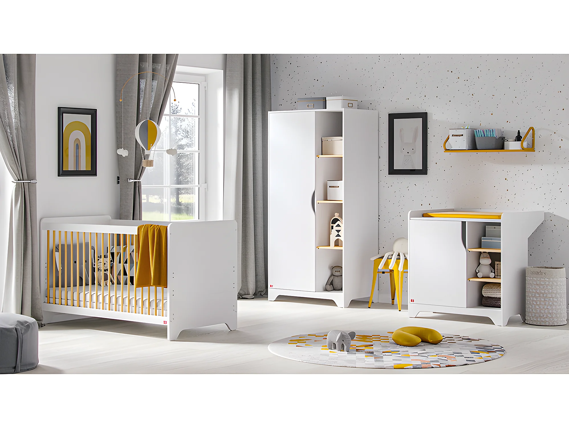 Chambre complète lit bébé - commode à langer - armoire 1 porte Leaf Blanc et bois