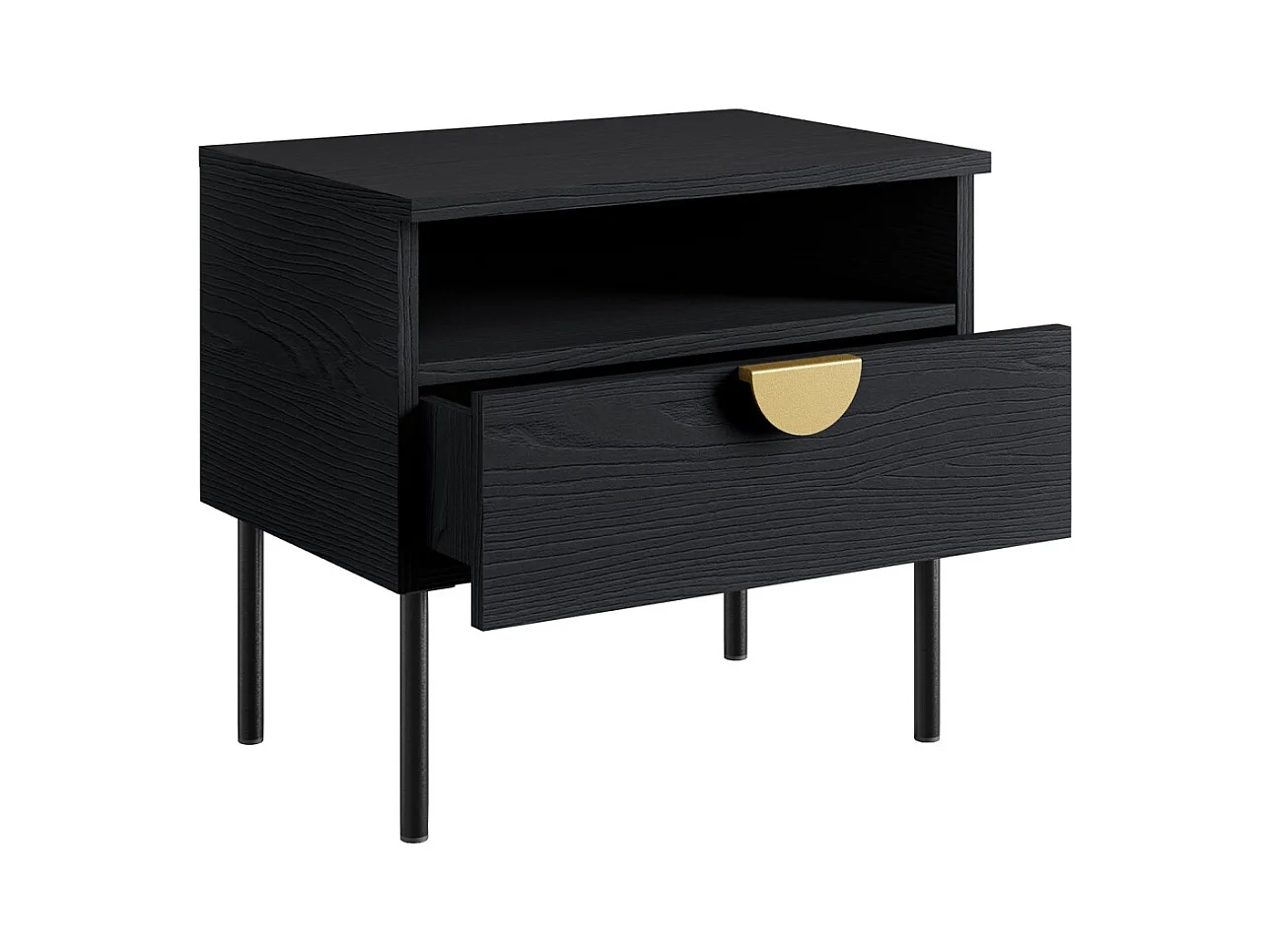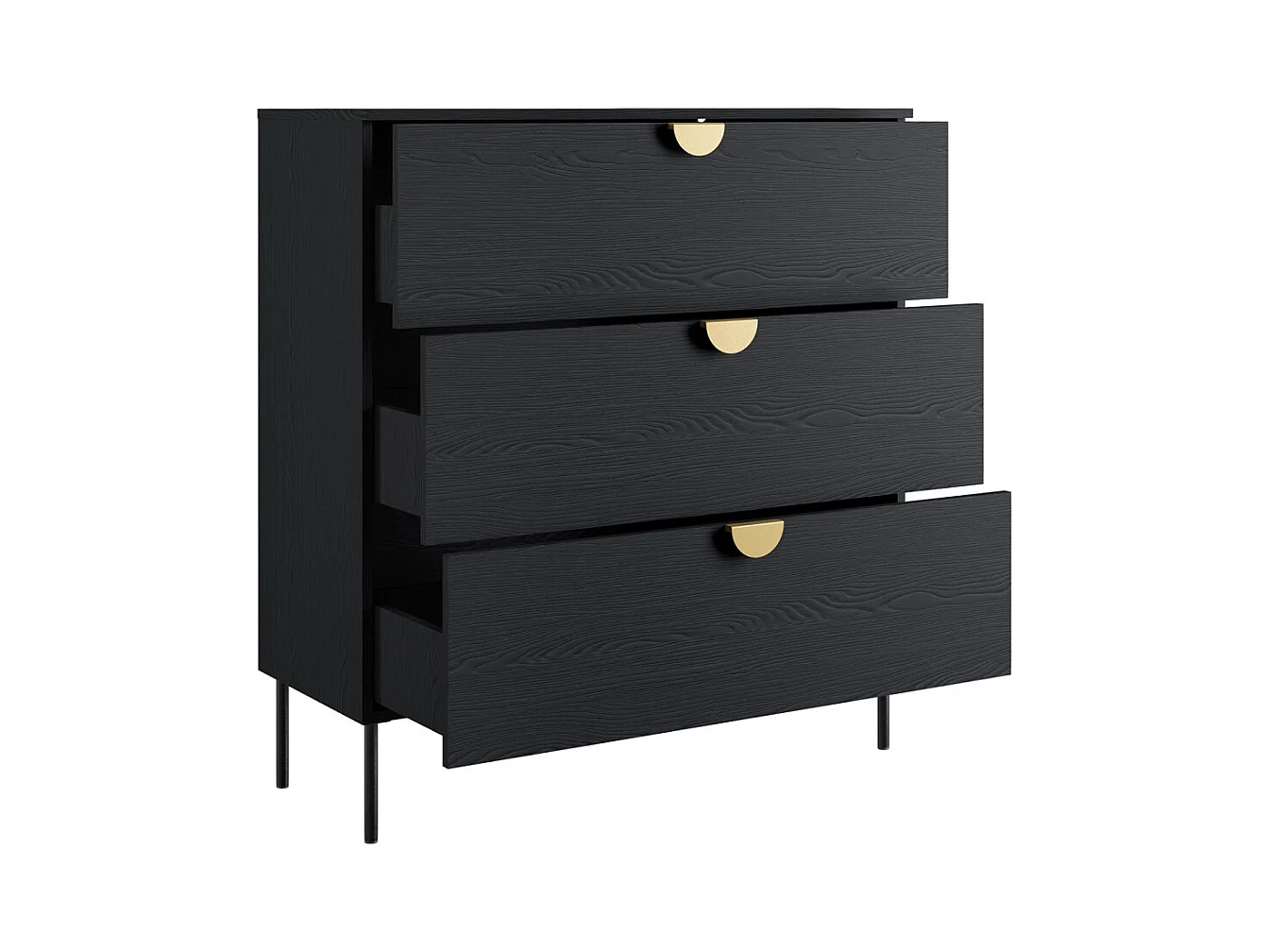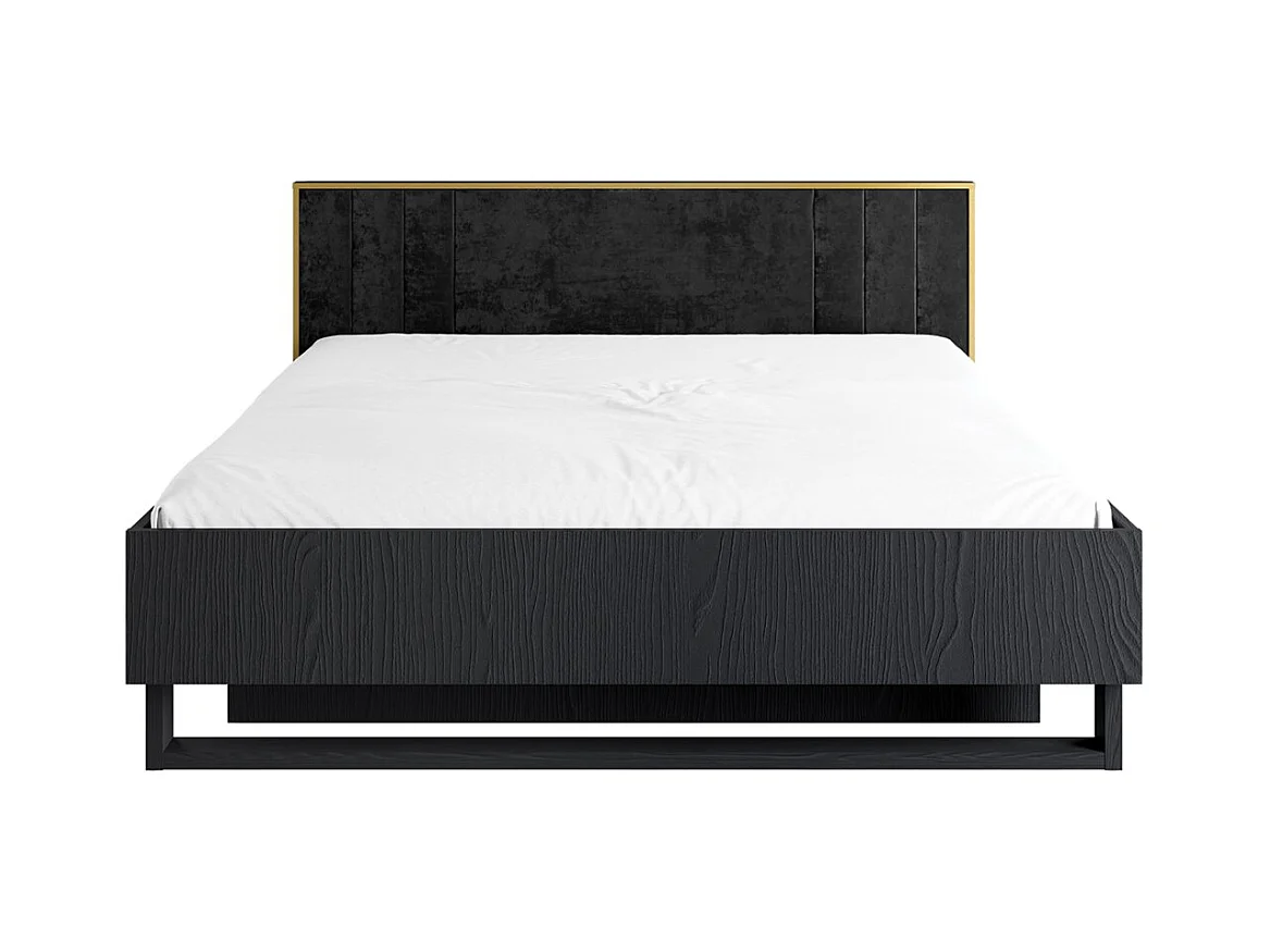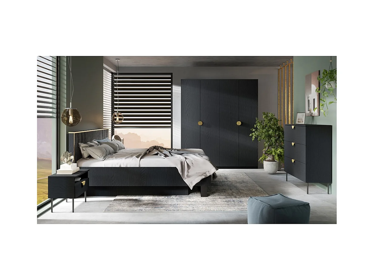 Chambre complète MONDO – Noir structuré et doré – Lit coffre 160x200 avec sommier + Armoire + Commode + 2 chevets