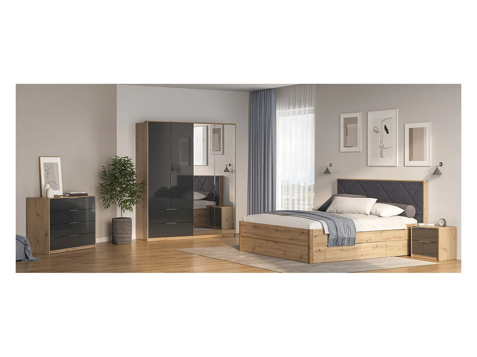Chambre RAY anthracite et chêne - SANS ARMOIRE