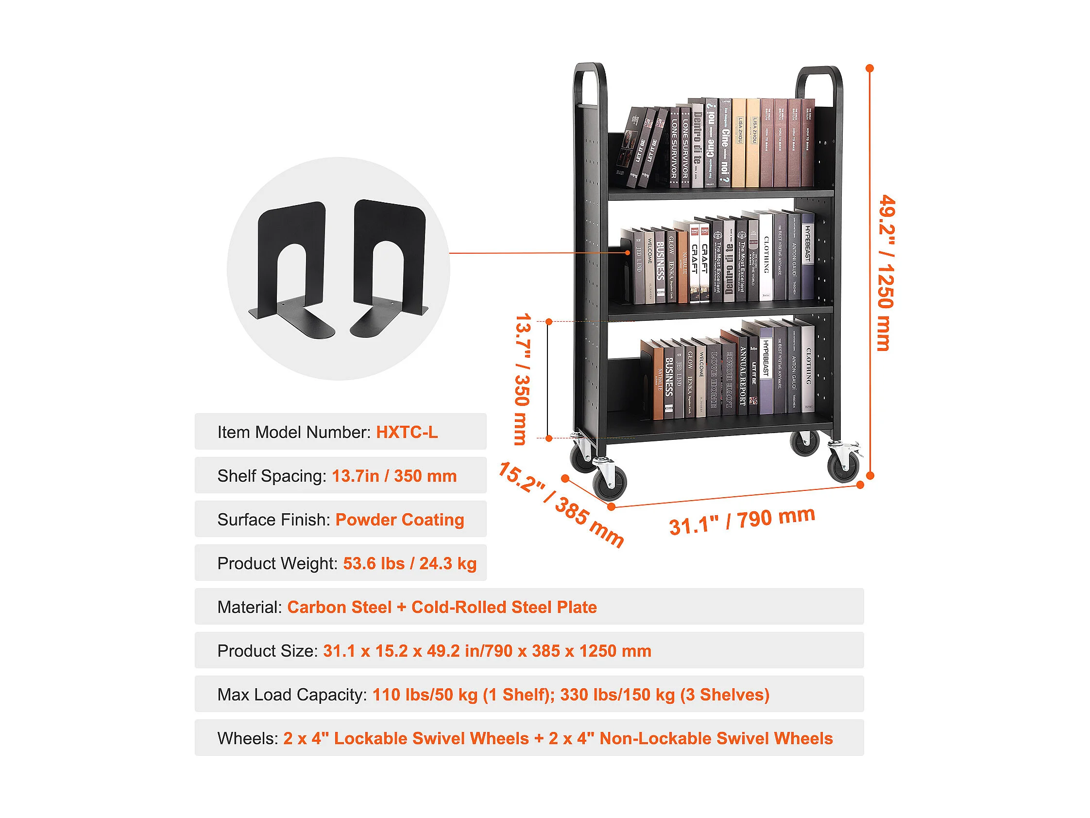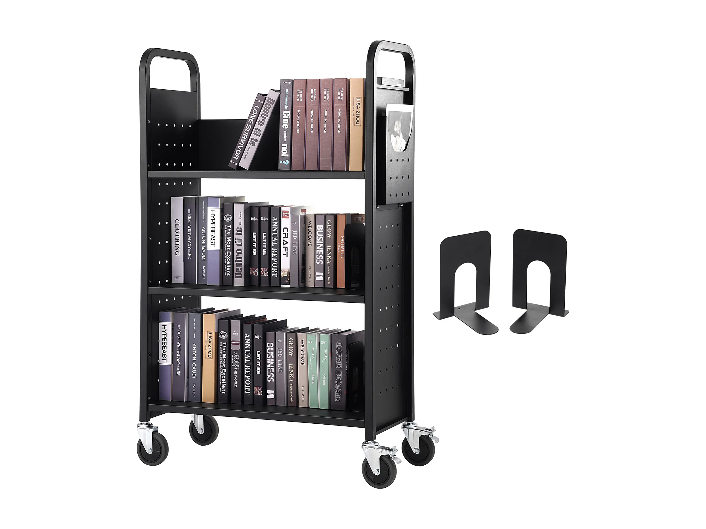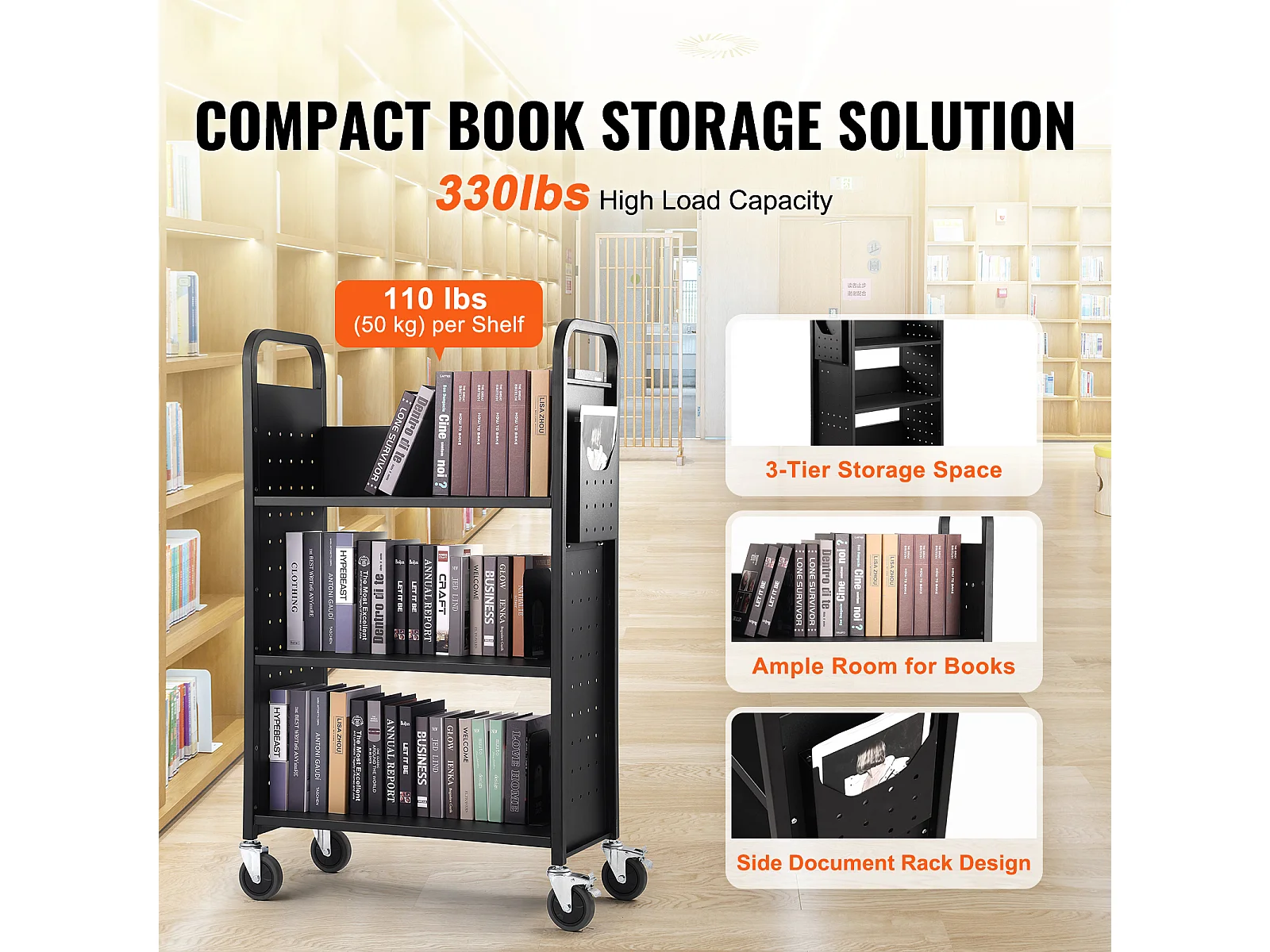 Chariot à Livres SucceBuy, Capacité de 150kg, Étagères en L à Un Seul Côté, Roues Verrouillables de 10cm, Idéal pour la Maison, le Bureau et l'École, Noir