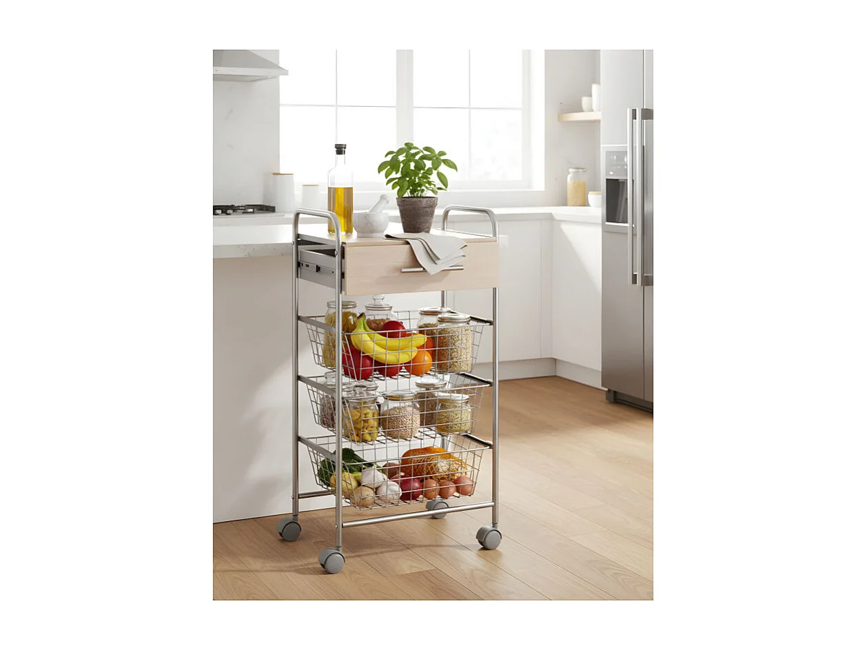 Chariot de cuisine, Desserte à roulettes, 1 tiroir et 3 paniers - Couleur Aluminium, Hêtre - 86*44*30 cm - ALESIA