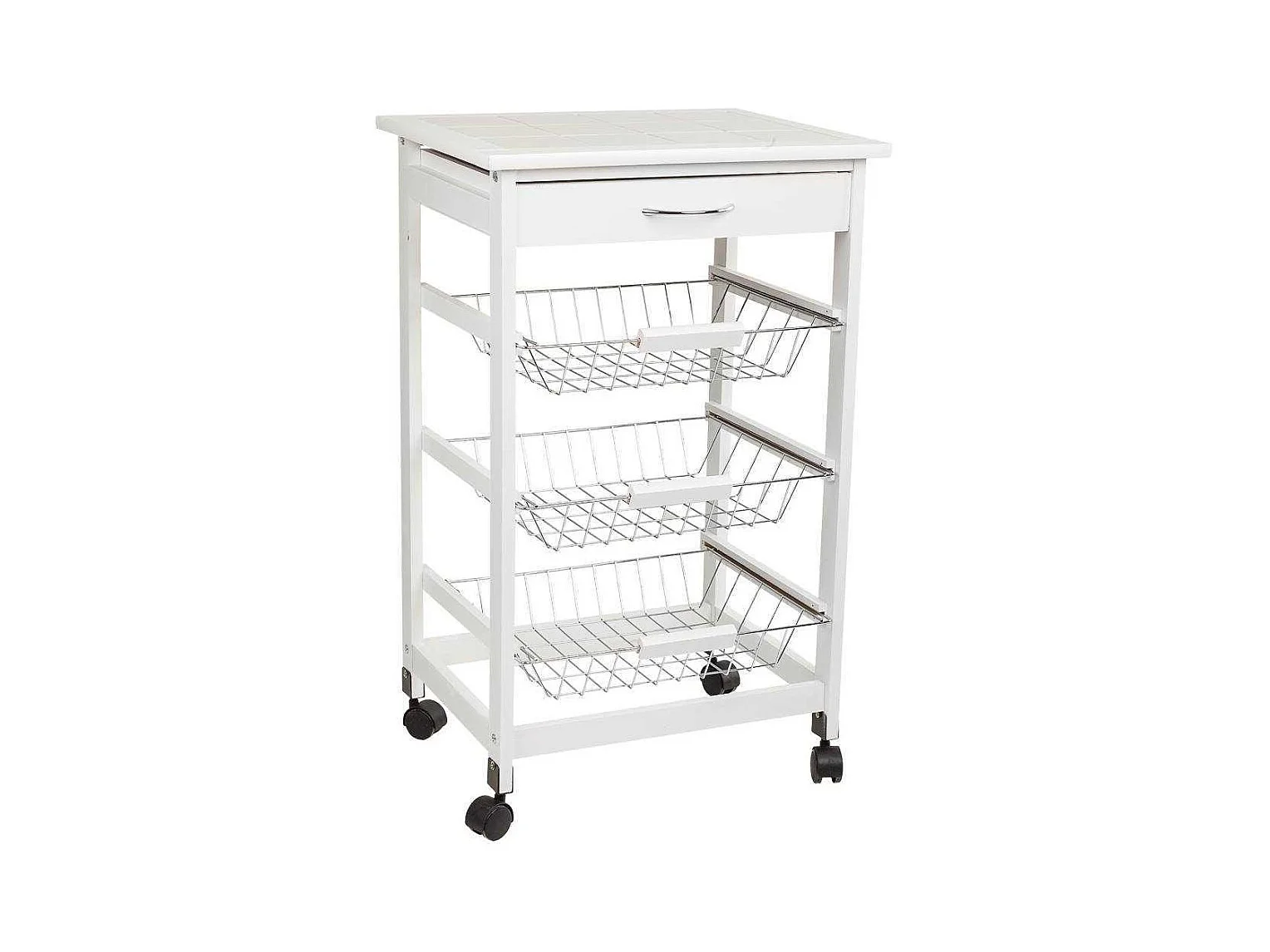 Chariot de service desserte de cuisine à roulettes multi-rangements 3 paniers métal tiroir + 2 range-bouteilles bois pin blanc