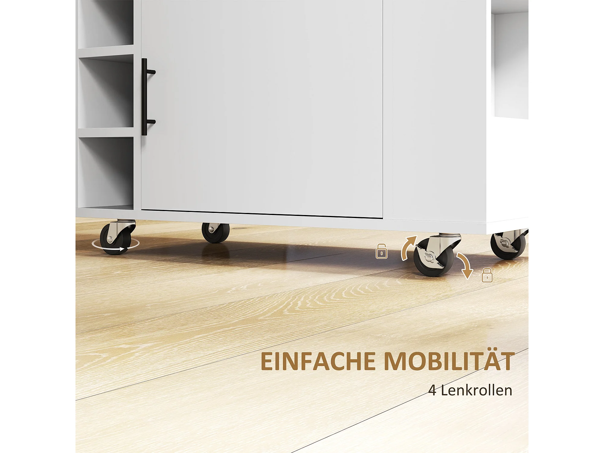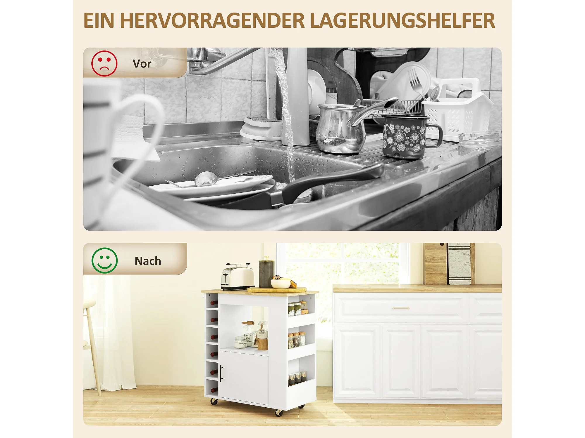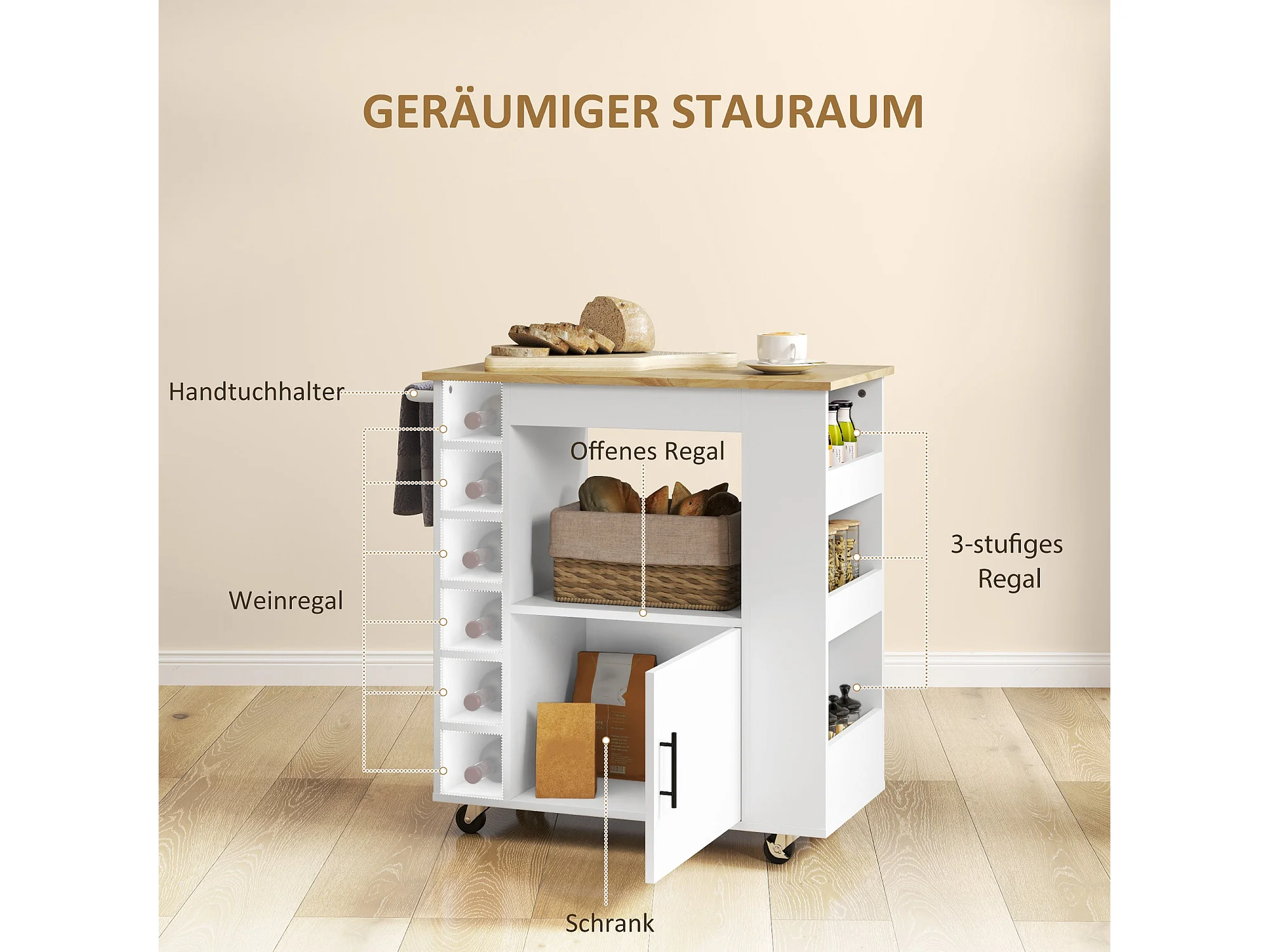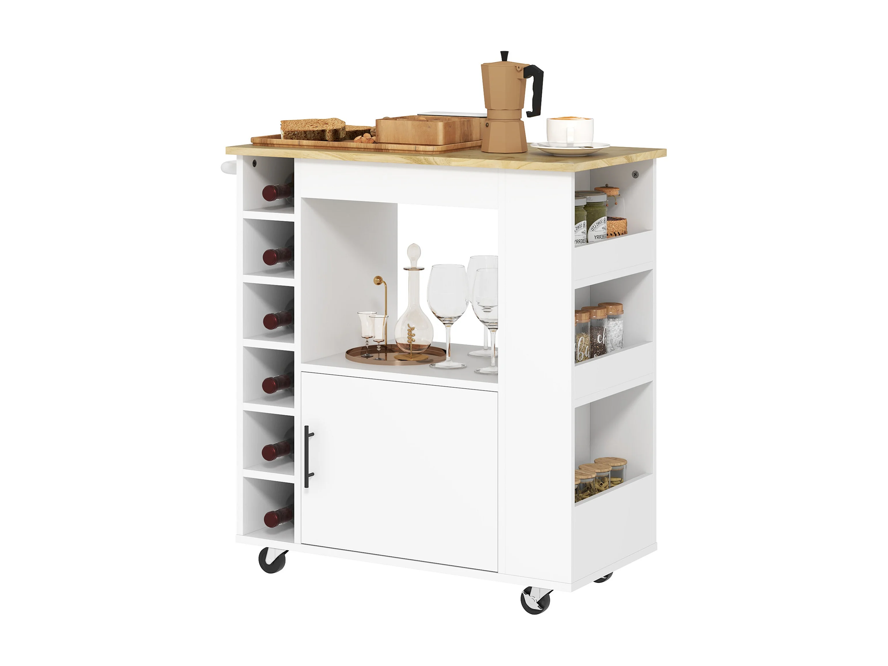 Chariot de cuisine, îlot de cuisine sur roulettes, chariot avec compartiments, rangements à bouteilles, placard et plan de travail – Blanc