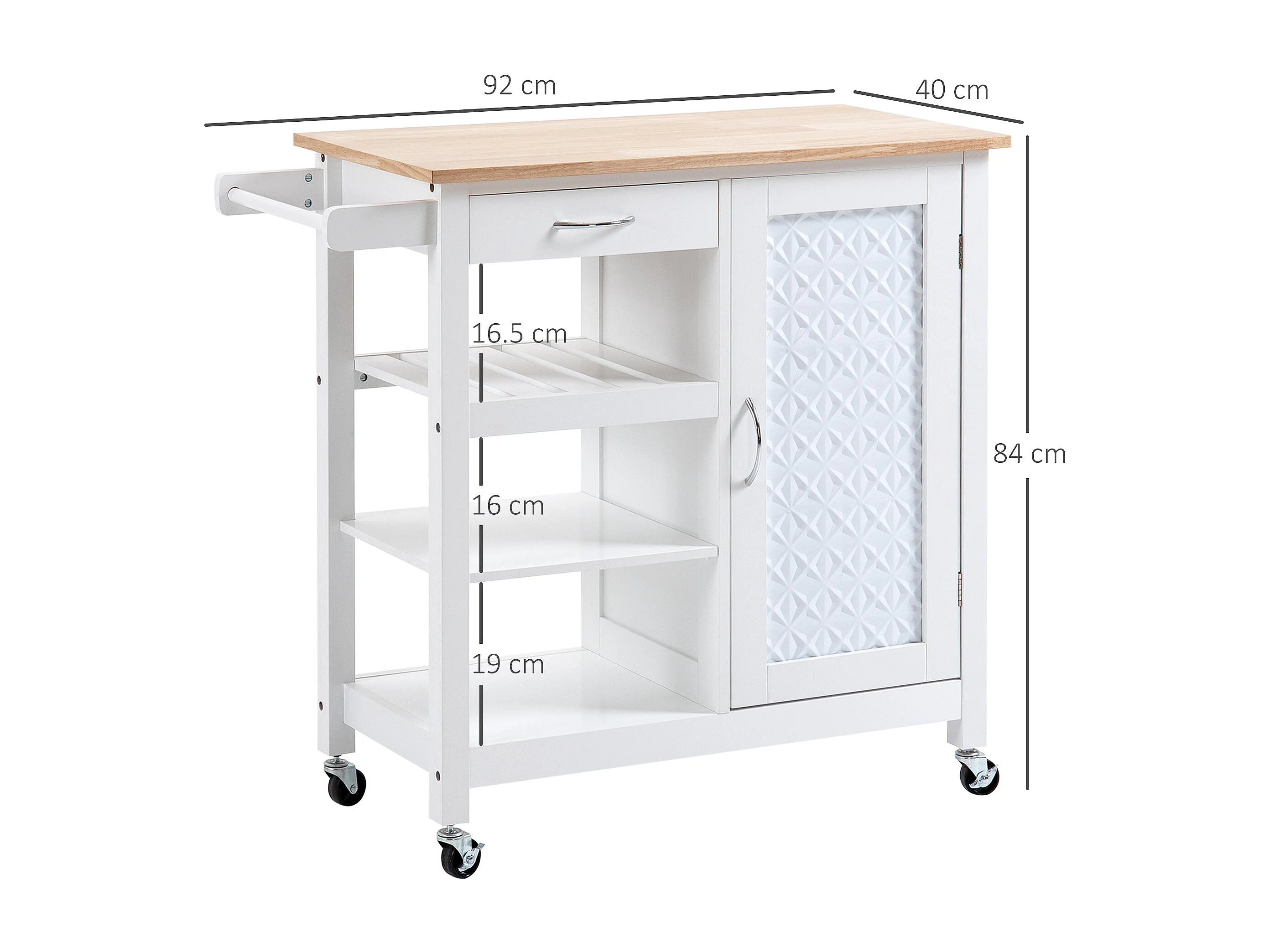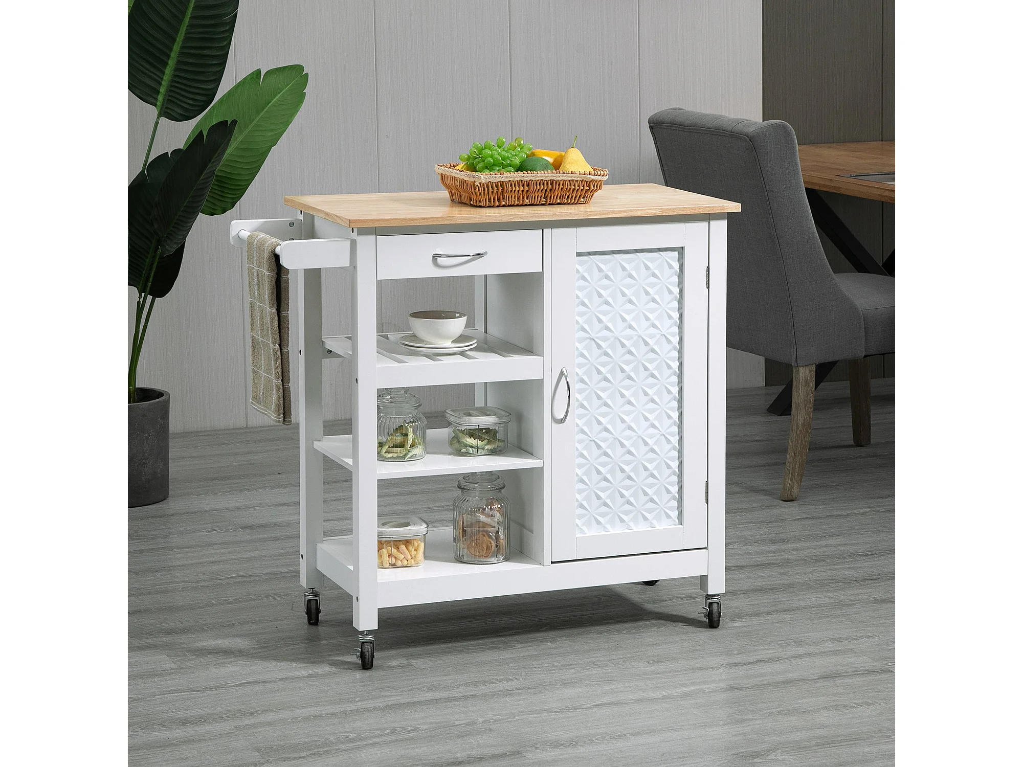 Chariot de cuisine, îlot sur roulettes avec panneau de porte à motif gaufré, chariot de rangement avec 3 étagères de stockage – Blanc