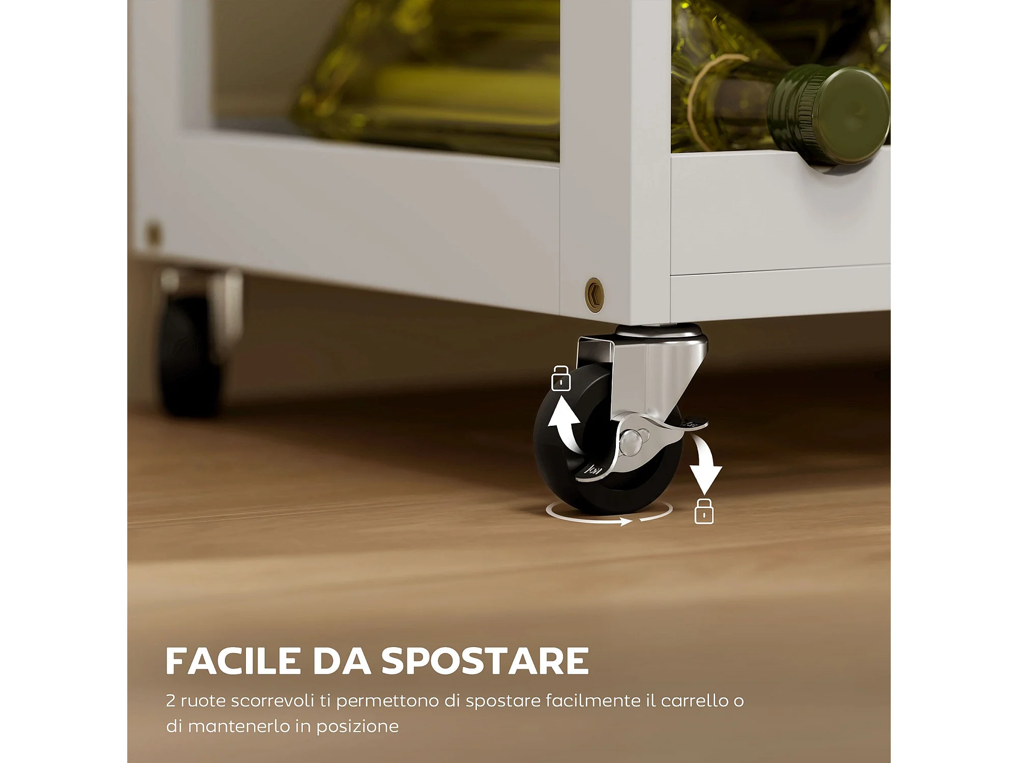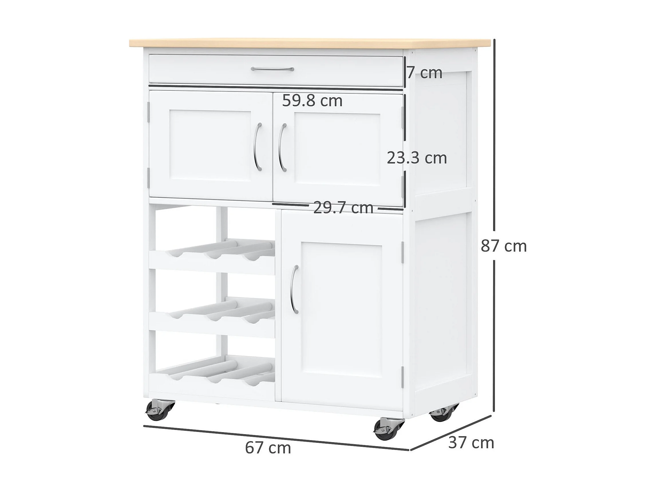 Chariot de cuisine moderne, îlot de rangement sur roulettes avec tiroir, rangement pour 9 bouteilles, placards, plan de travail en bois – Blanc