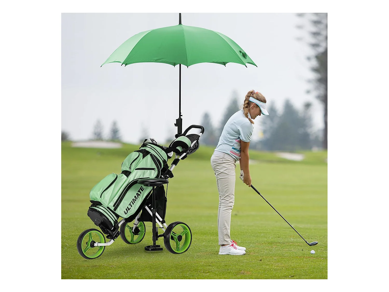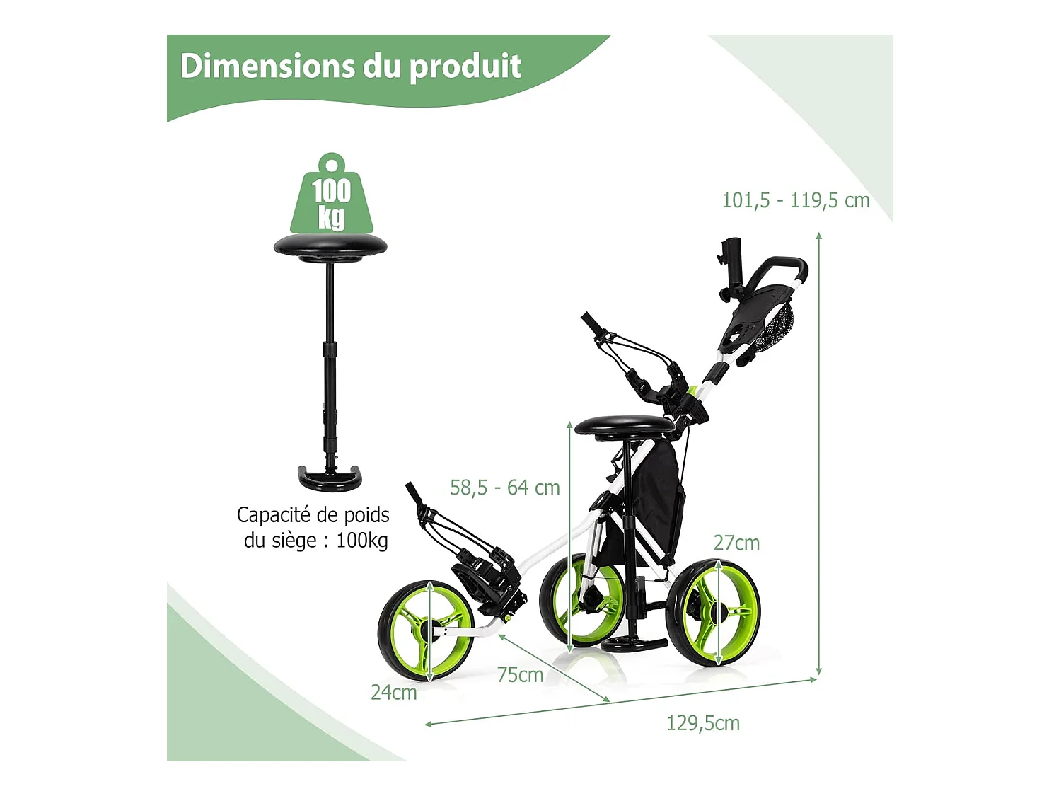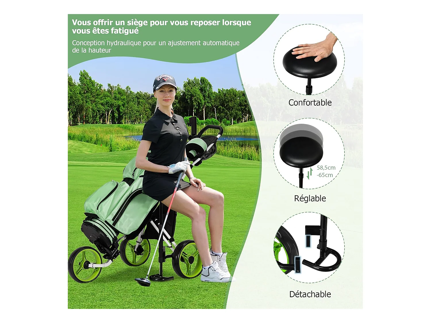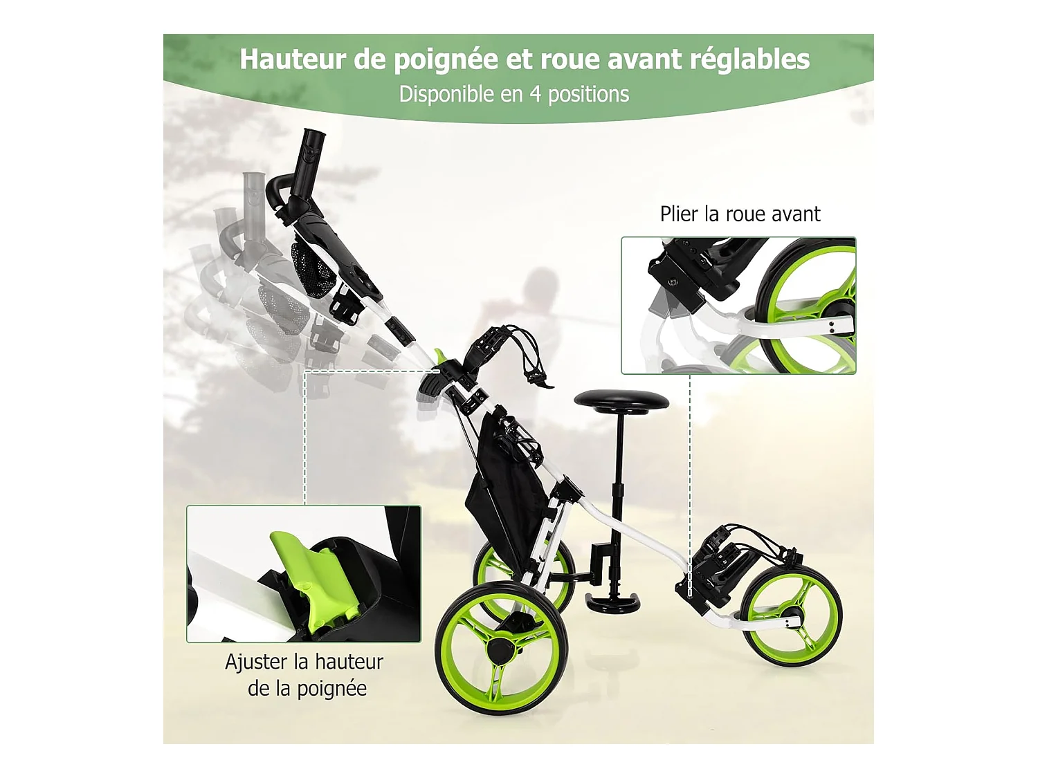 Chariot de Golf à 3 Roues Pliable, avec Porte-gobelet, Frein à Pied, Tableau de Score, Sac de Rangement, Poignée Réglable sur 4 Positions, Porte-Parapluie et Siège Réglables(Vert + Noir)