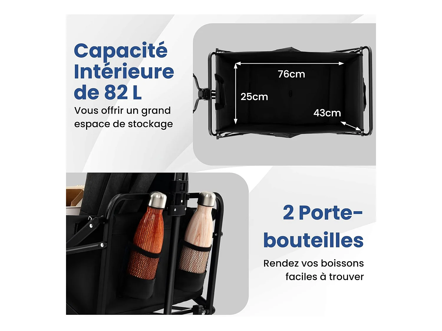 Chariot de Plage Pliable 82 L, Chariot de Transport avec Poignée Réglable et Porte-Boissons Charge 68 kg, Chariot Utilitaire Extérieur pour Jardin Camping Pêche (Noir)