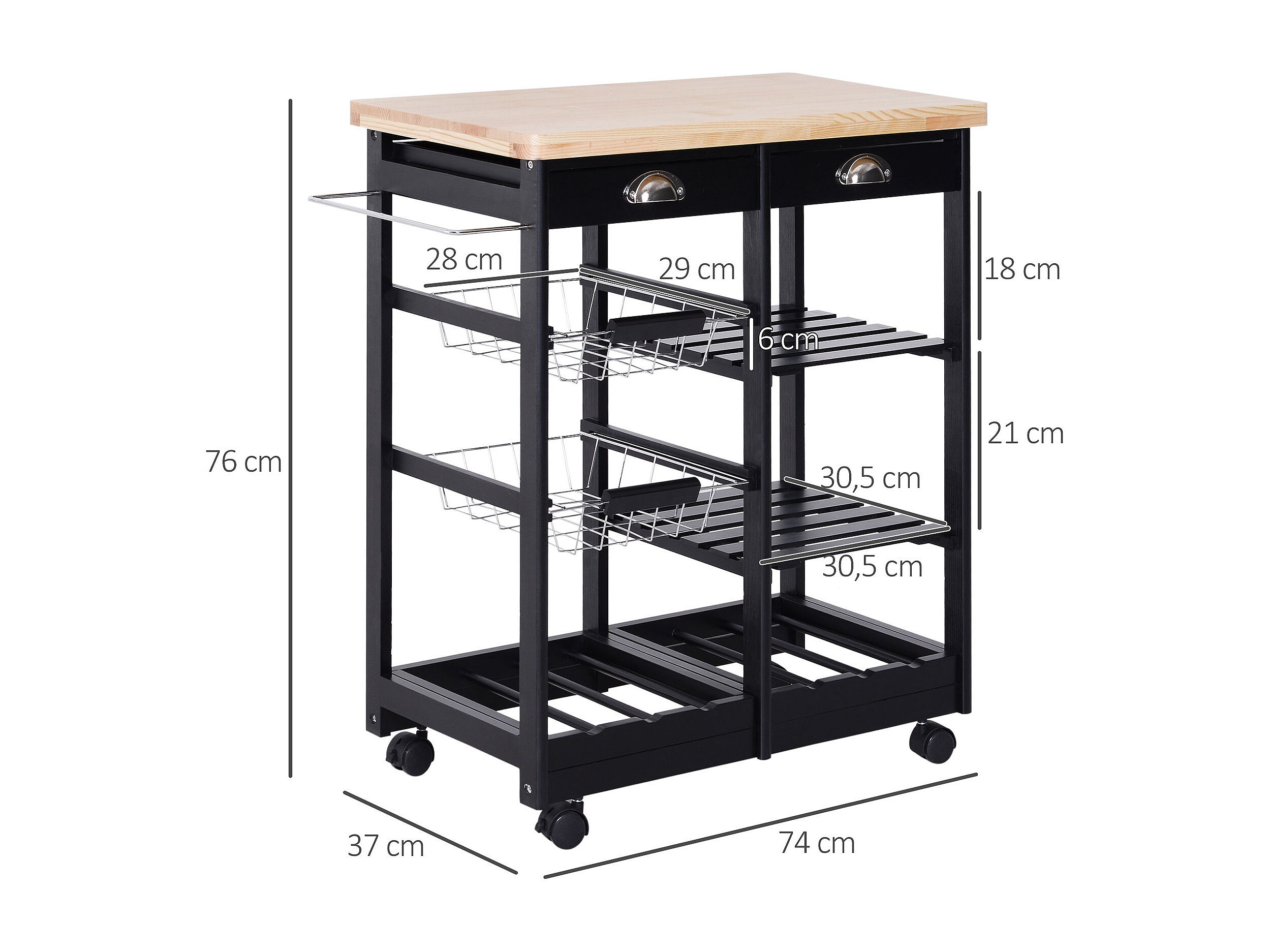 Chariot de service desserte de cuisine à roulettes multi-rangements 74L x 37l x 76H cm plateau bois massif pin châssis MDF noir