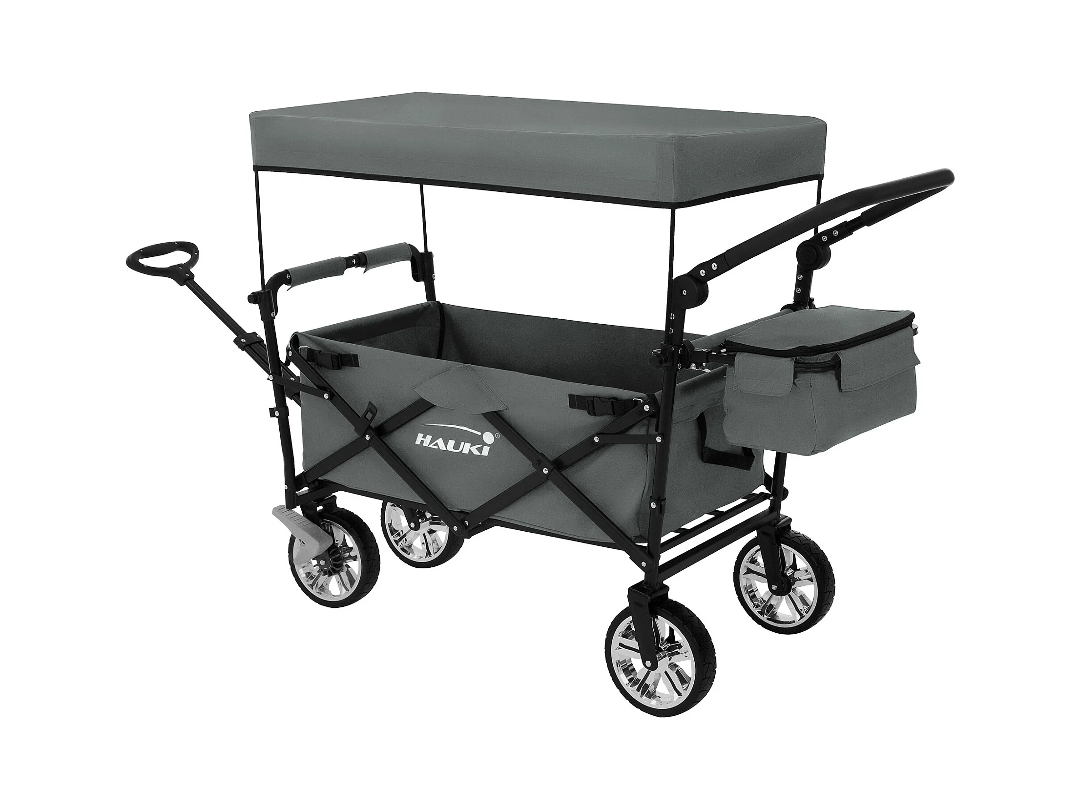 Chariot de transport pliable avec toit et sac gris pour enfants charge 120 kg