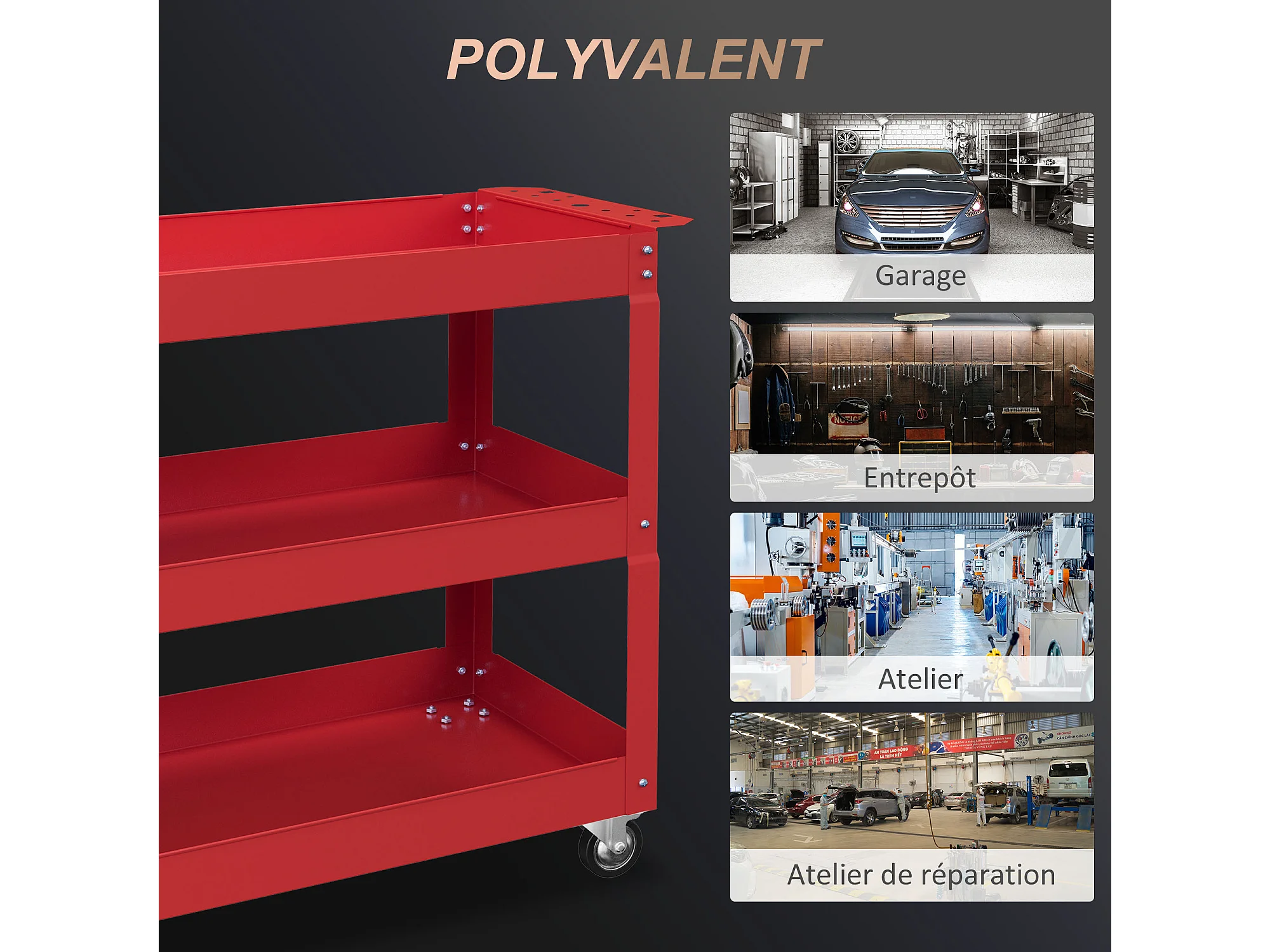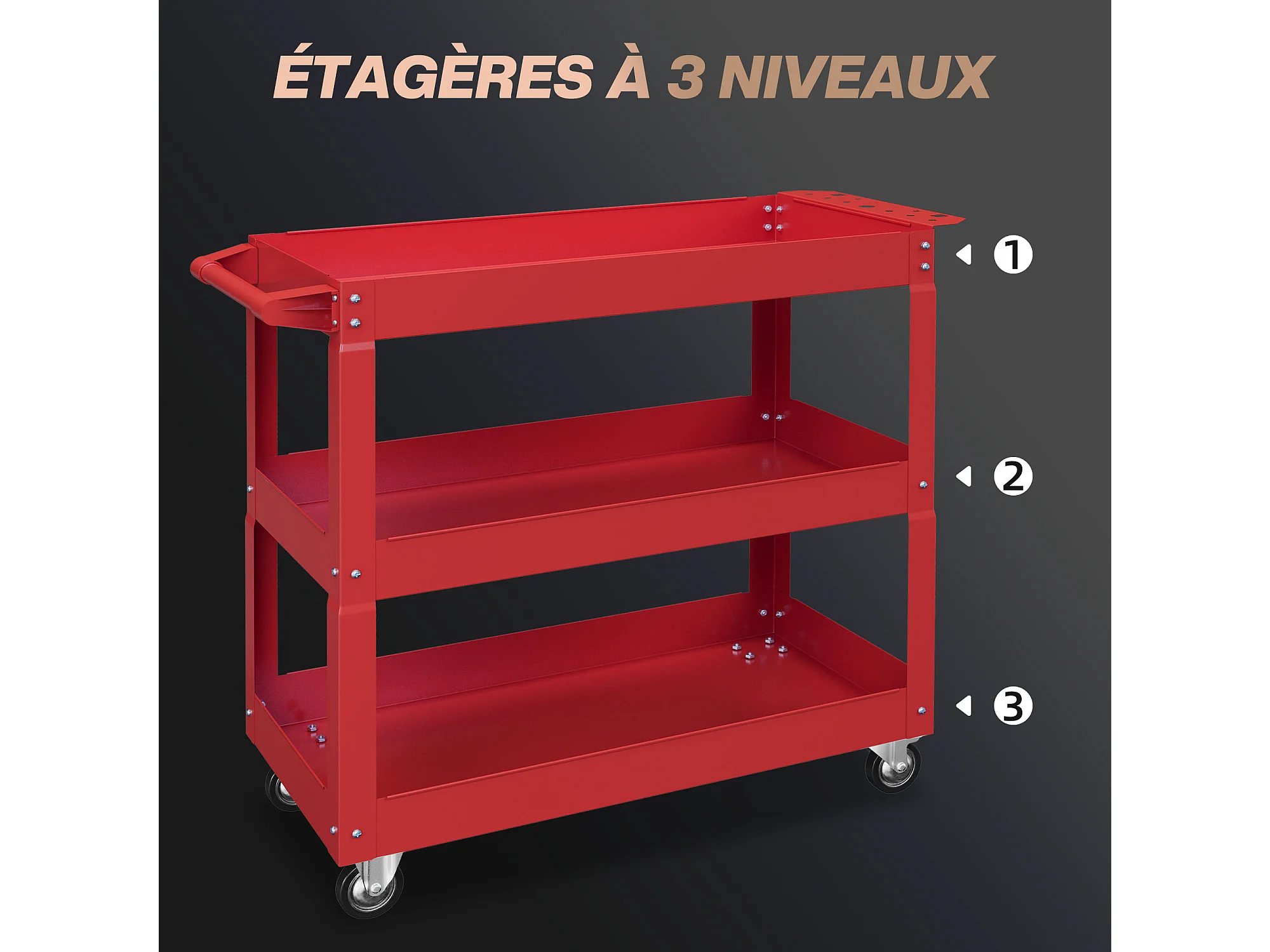 Chariot desserte d'atelier acier 3 plateaux sur roulettes avec poignée - charge max. 150 kg - 83 x 35,3 x 76 cm rouge
