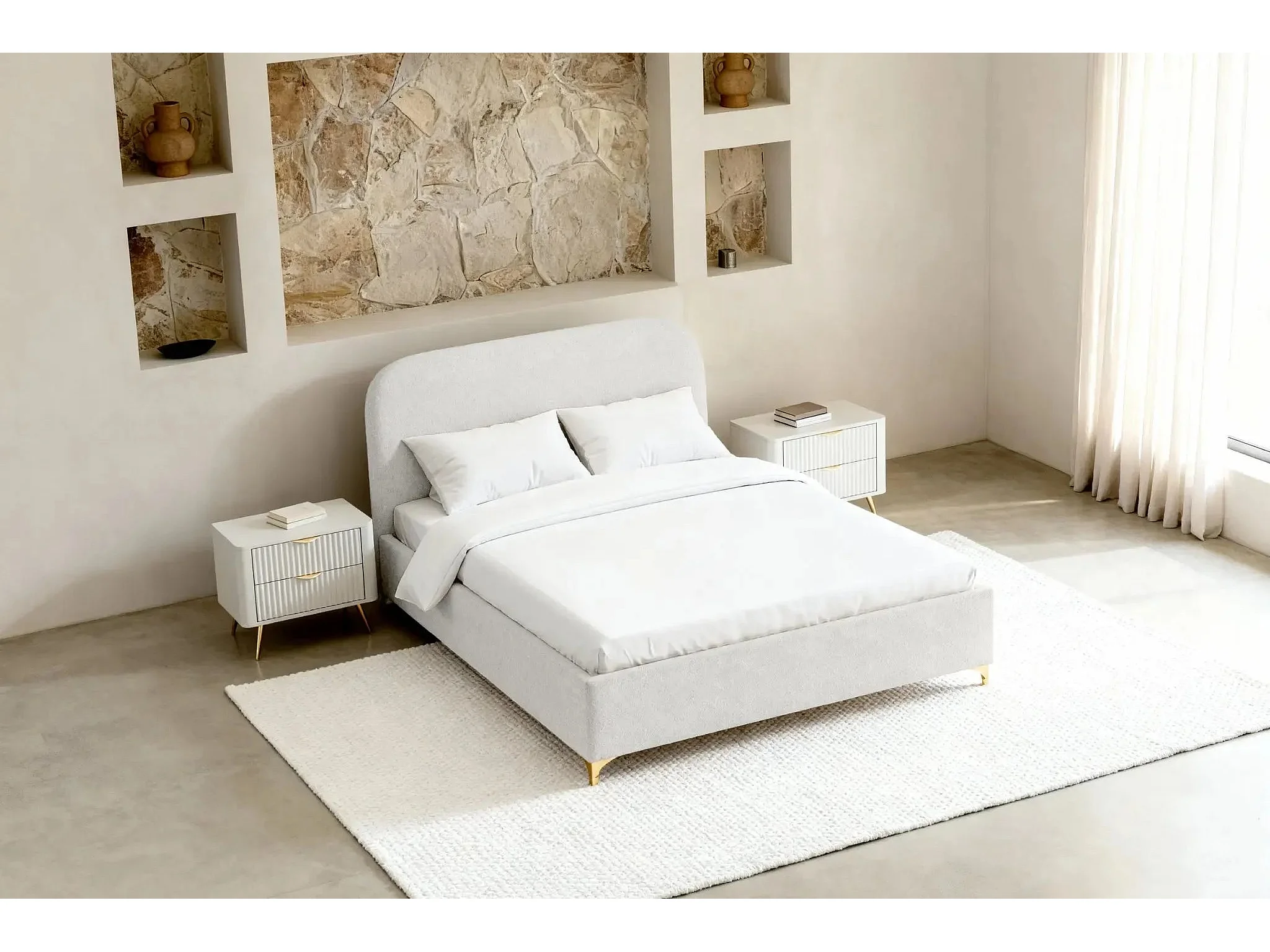 CHARLOTTE - Lit coffre tissu chenille 140x200cm - Blanc
