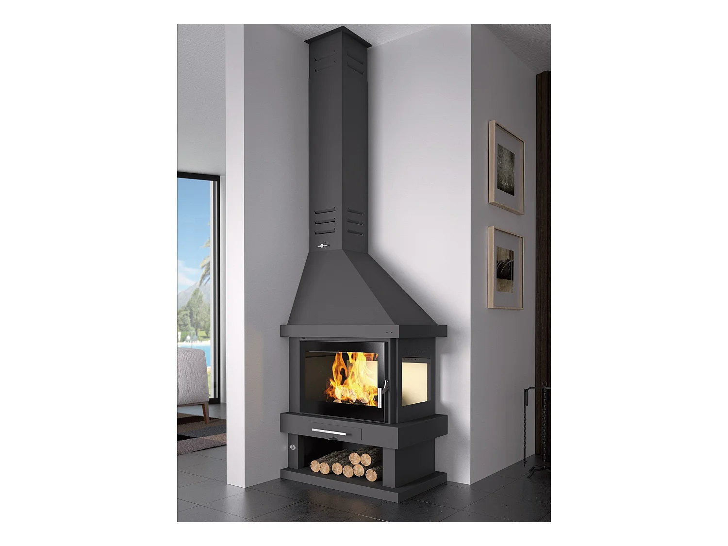 Cheminée à bois de coin droit en acier avec bûcher inférieur - IntimiFeu - Intérieur en vermiculite + verre sérigraphié sur la porte uniquement