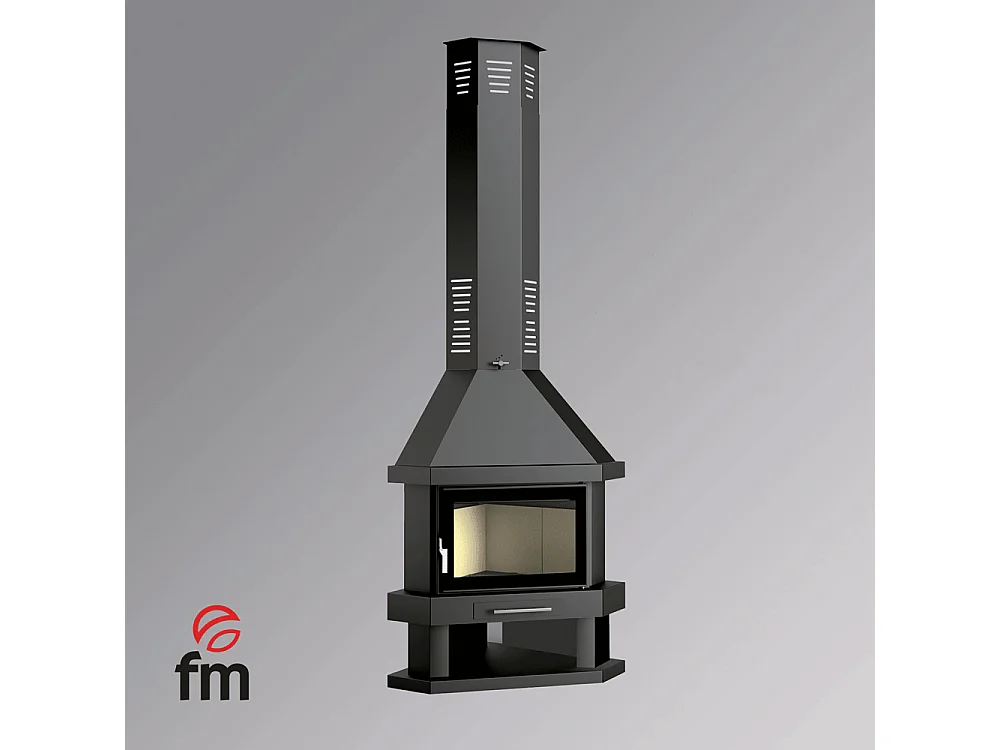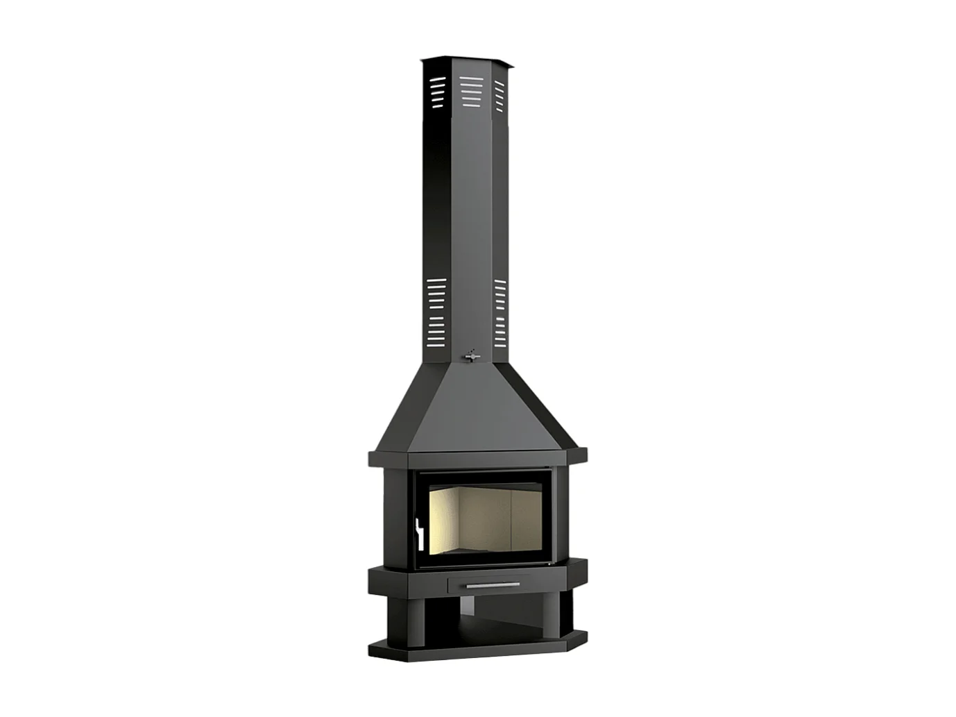 Cheminée à bois de coin en acier, bûcher inférieur - Ambiança - intérieur en vermiculite + verre sérigraphié