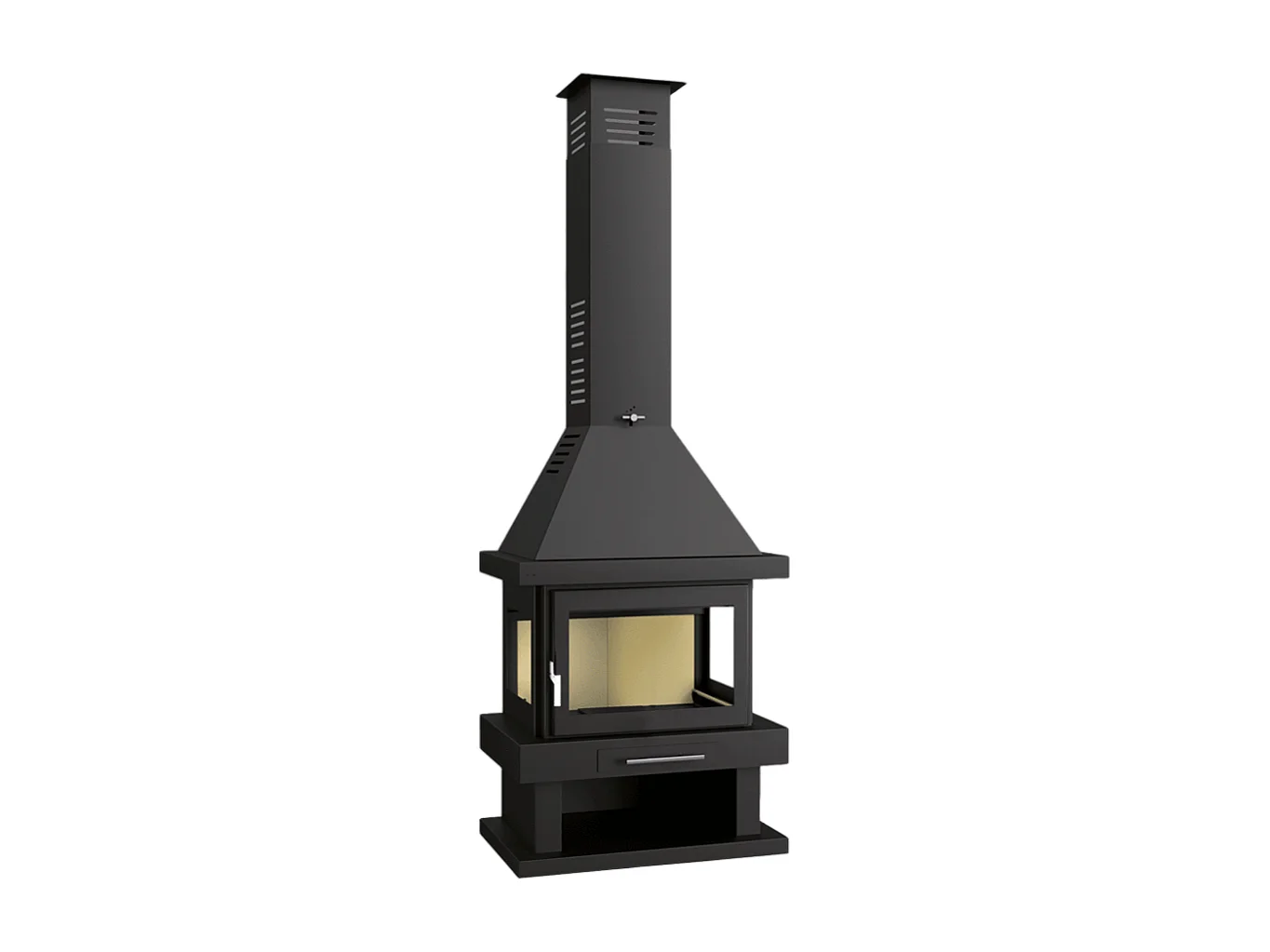 Cheminée à bois en acier, 3 cotés vitrés, bûcher inférieur - FeuVif - intérieur en vermiculite