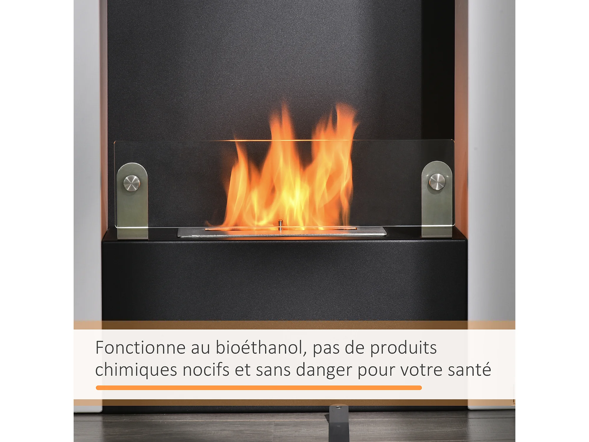 Cheminée bioéthanol design contemporain - étagère, pare-feu verre trempé 6 mm - brûleur 0,9 L - contrôle de flamme et manche inclus - acier noir blanc