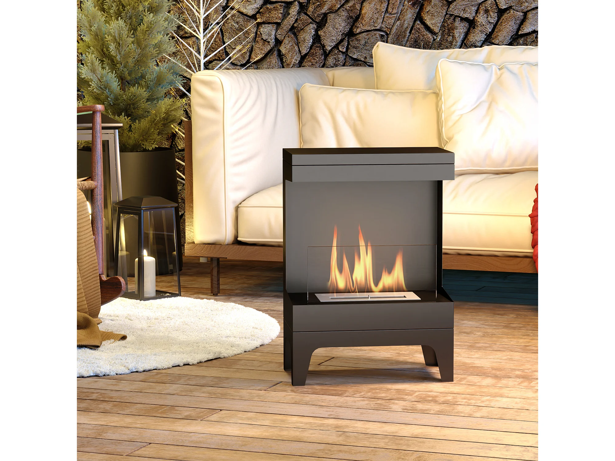 Cheminée bioéthanol sur pied - 0,9L - 38 x 22 x 54 cm - acier inox. noir verre trempé