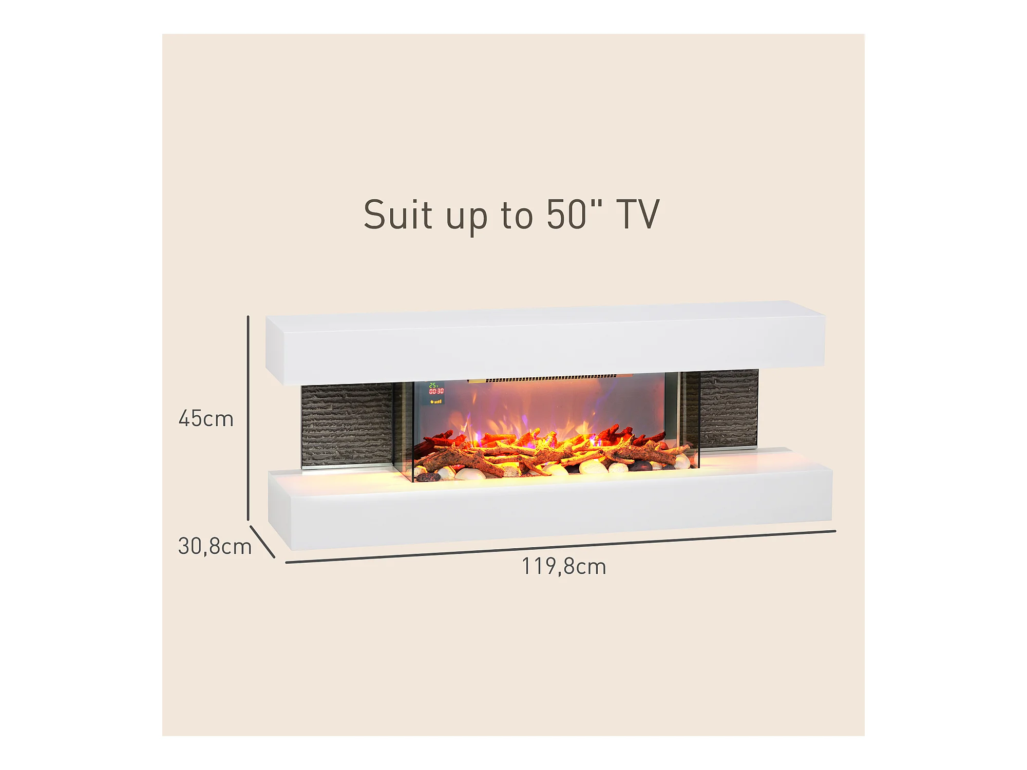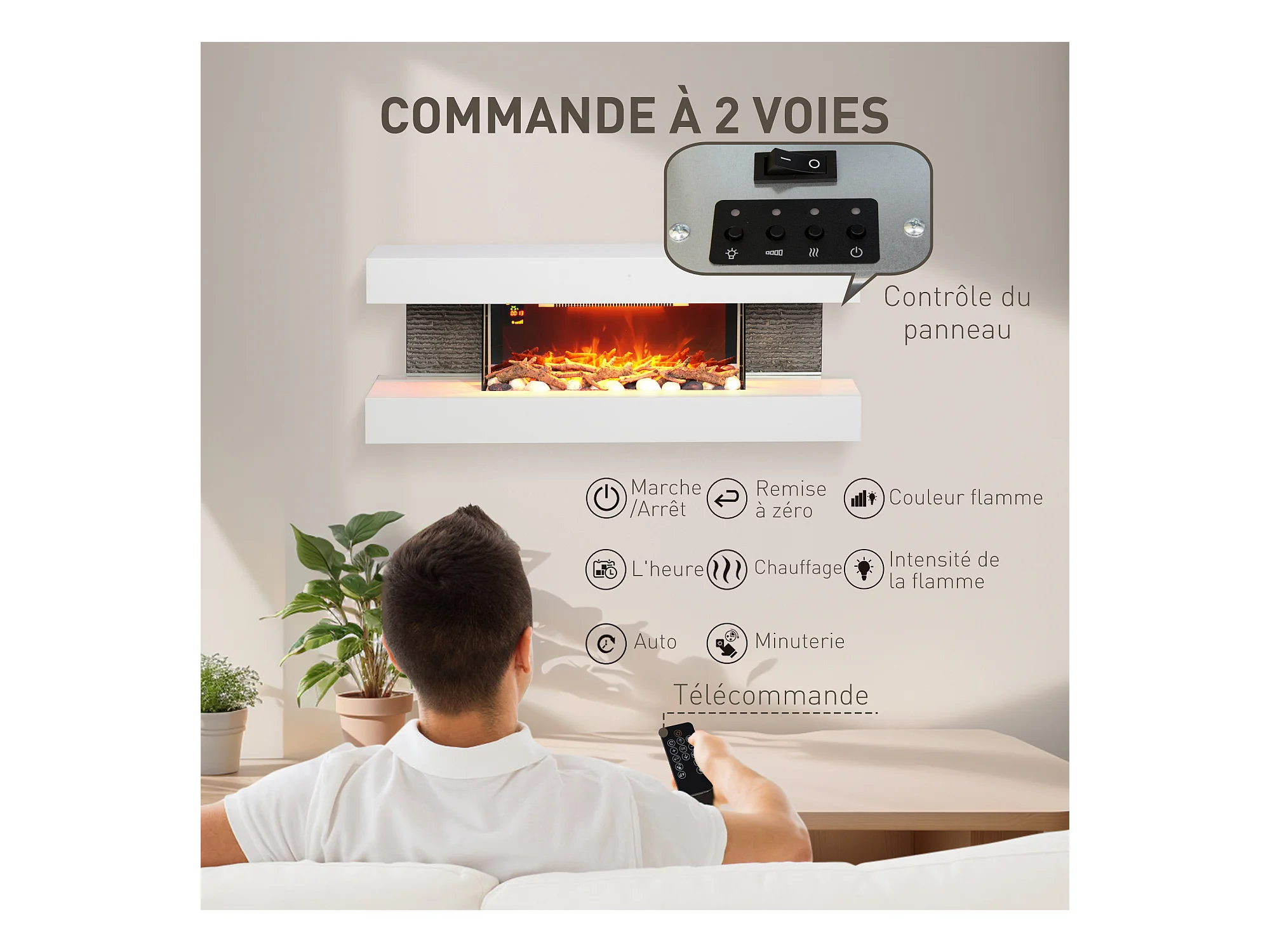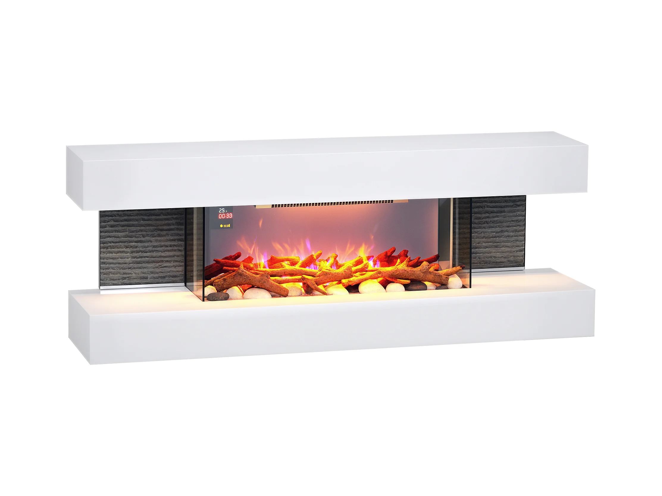 Cheminée électrique design contemporain 2000W effets flammes LED 3D dim. 119L x 30l x 45H cm éléments décoratifs télécommande inclus blanc