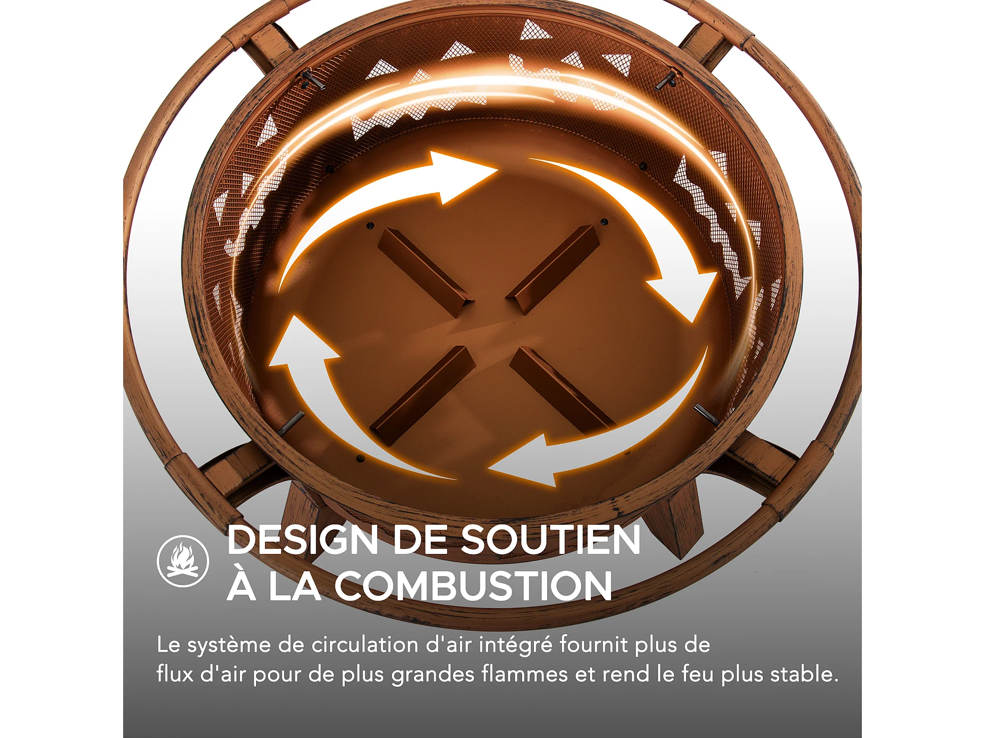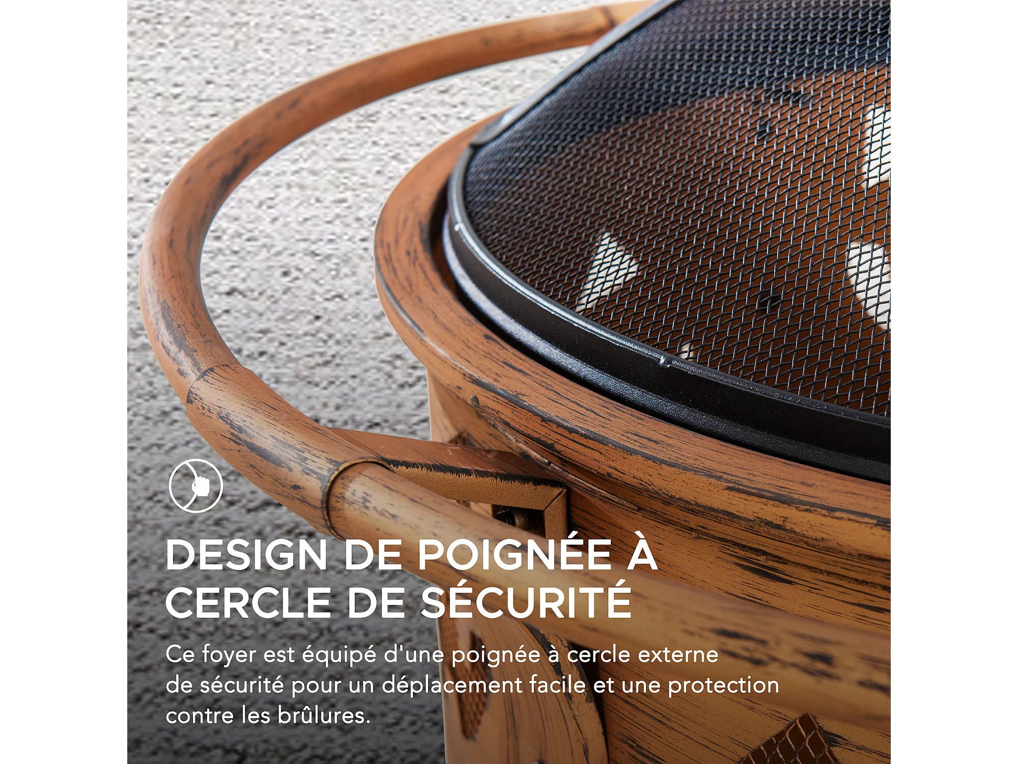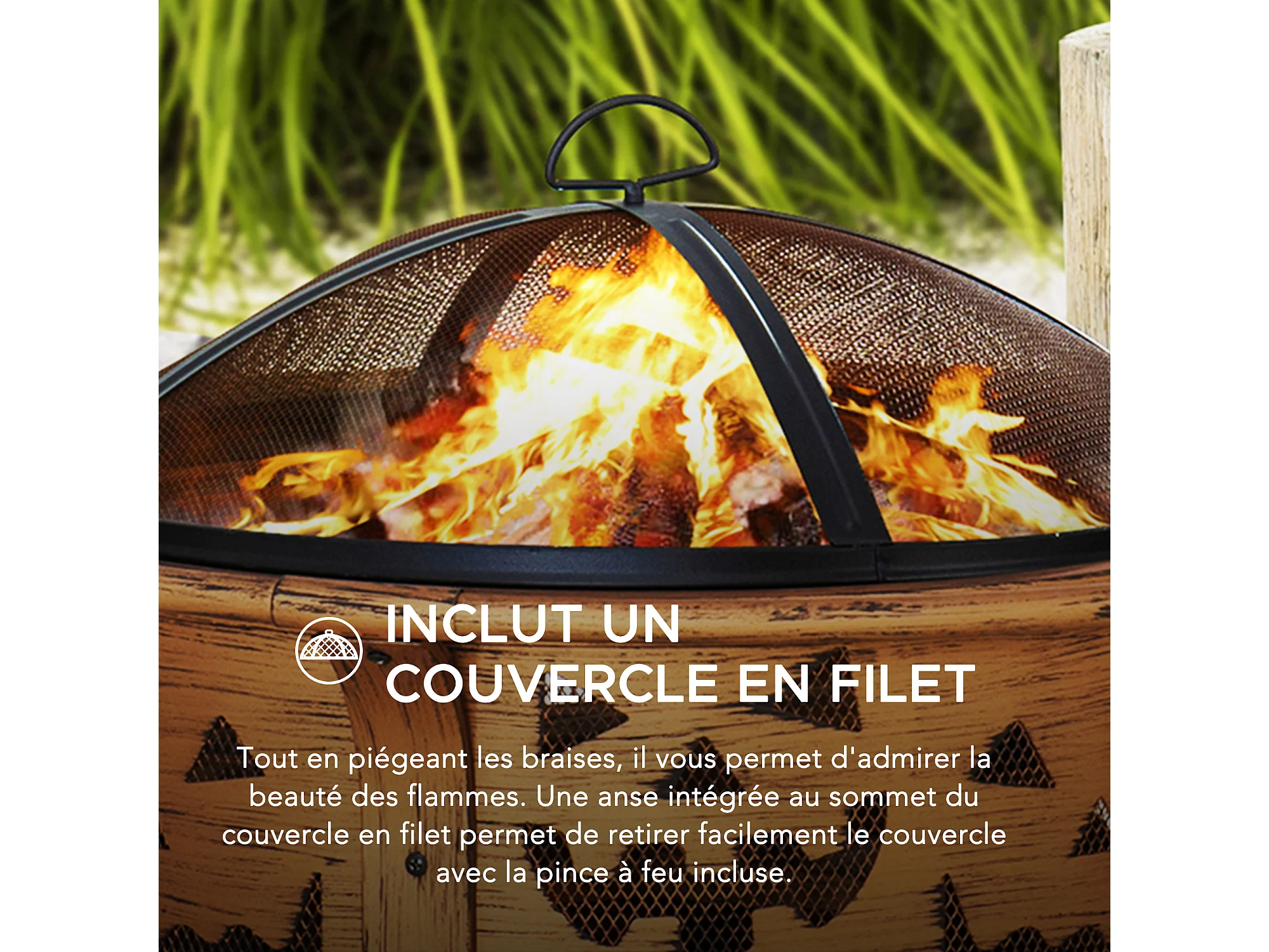 Foyer de Noël Mazama en acier cuivré de 76 cm avec pare-étincelles et tisonnier - Treillis