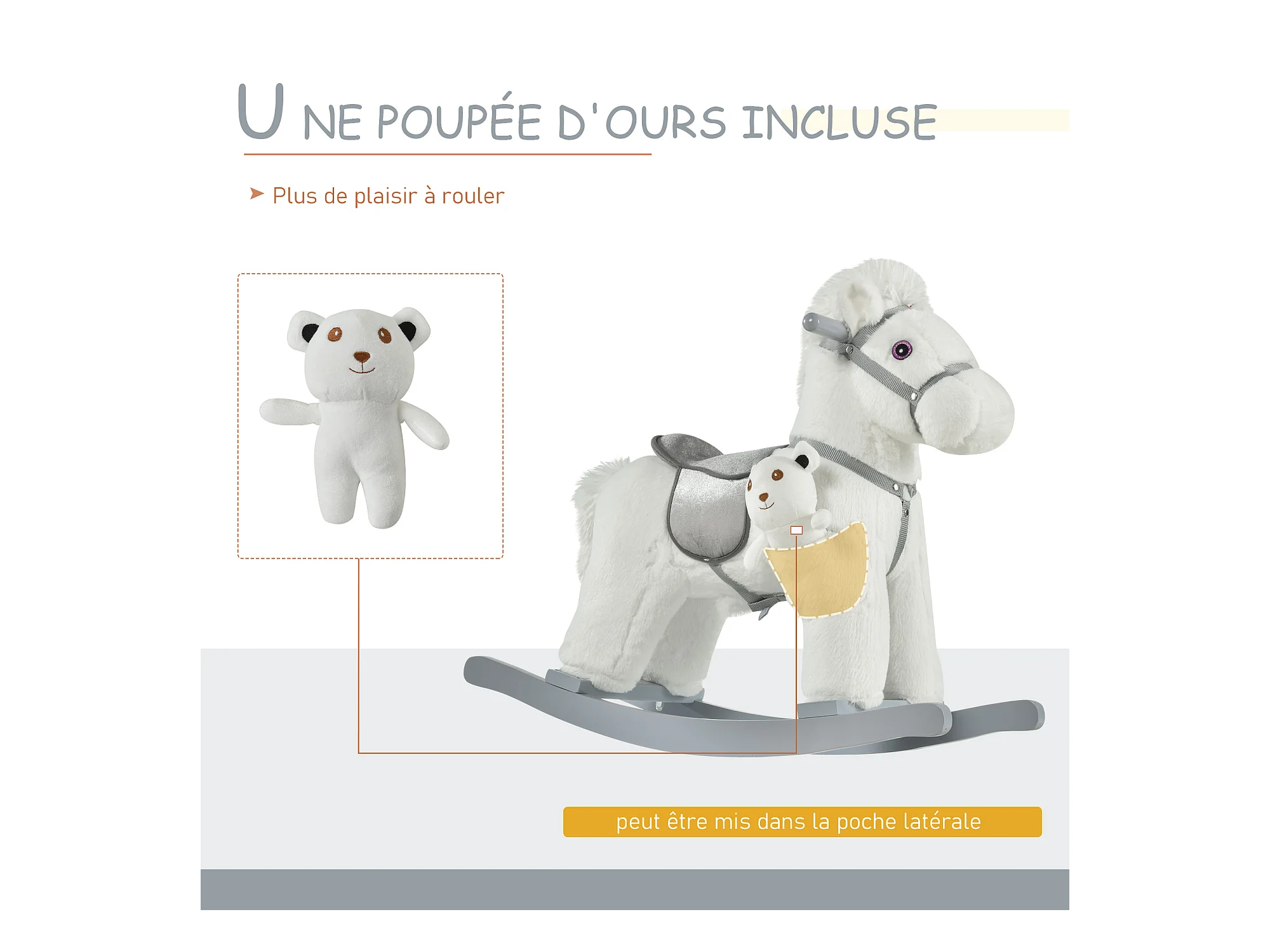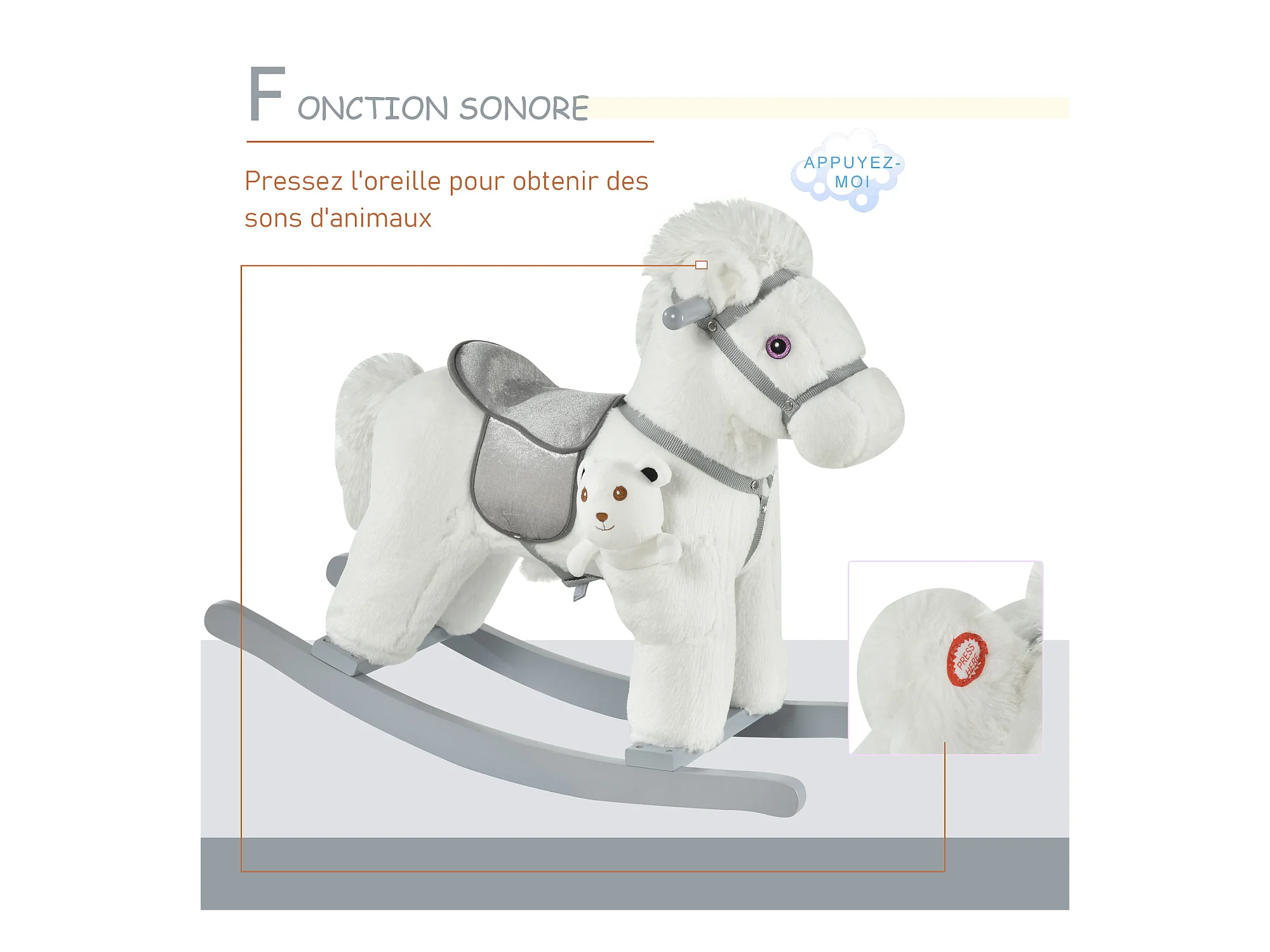 Cheval à bascule - effets sonores, peluche ourson inclus - poignées structure bois peuplier gris peluche courte douce blanc