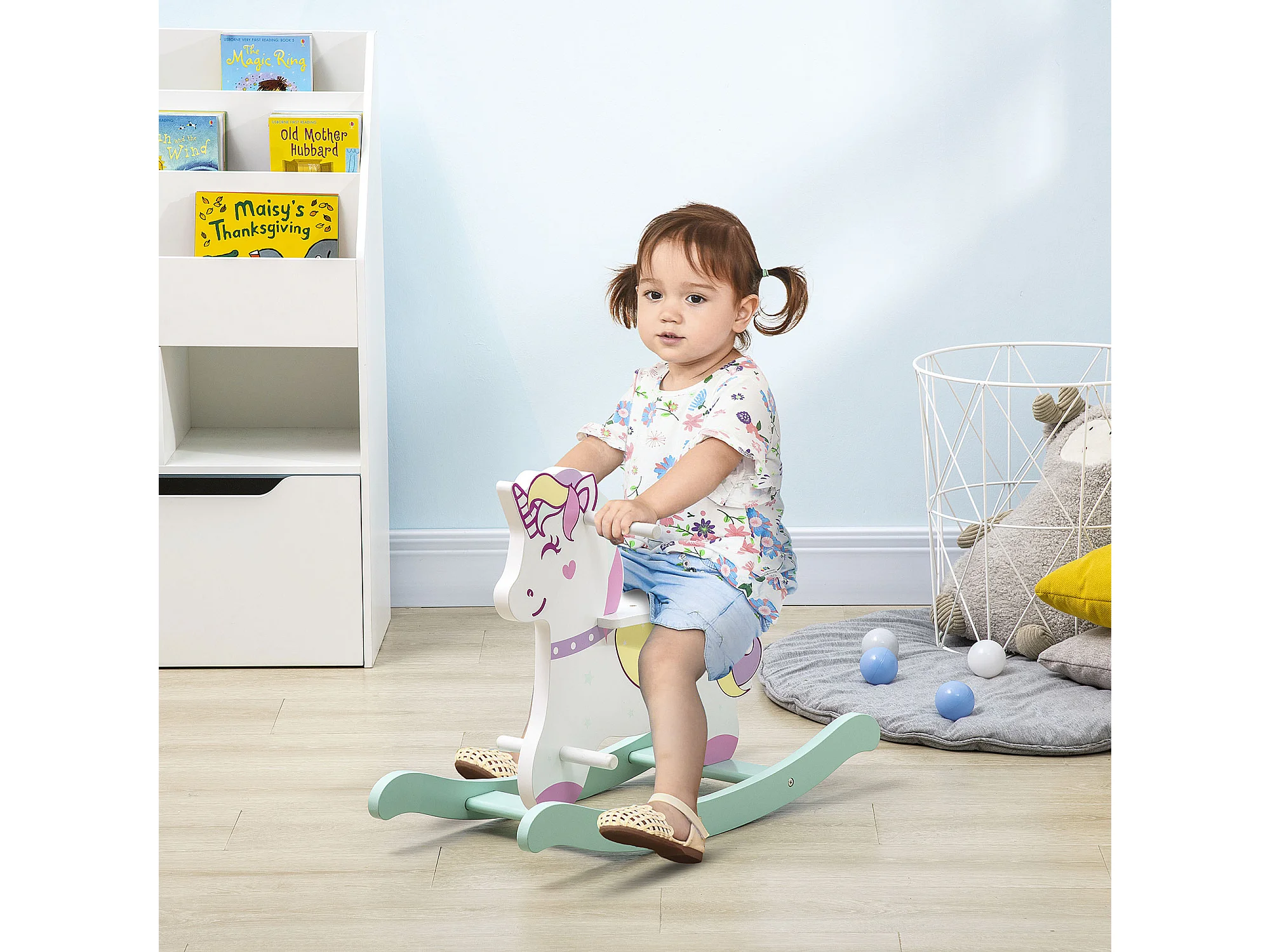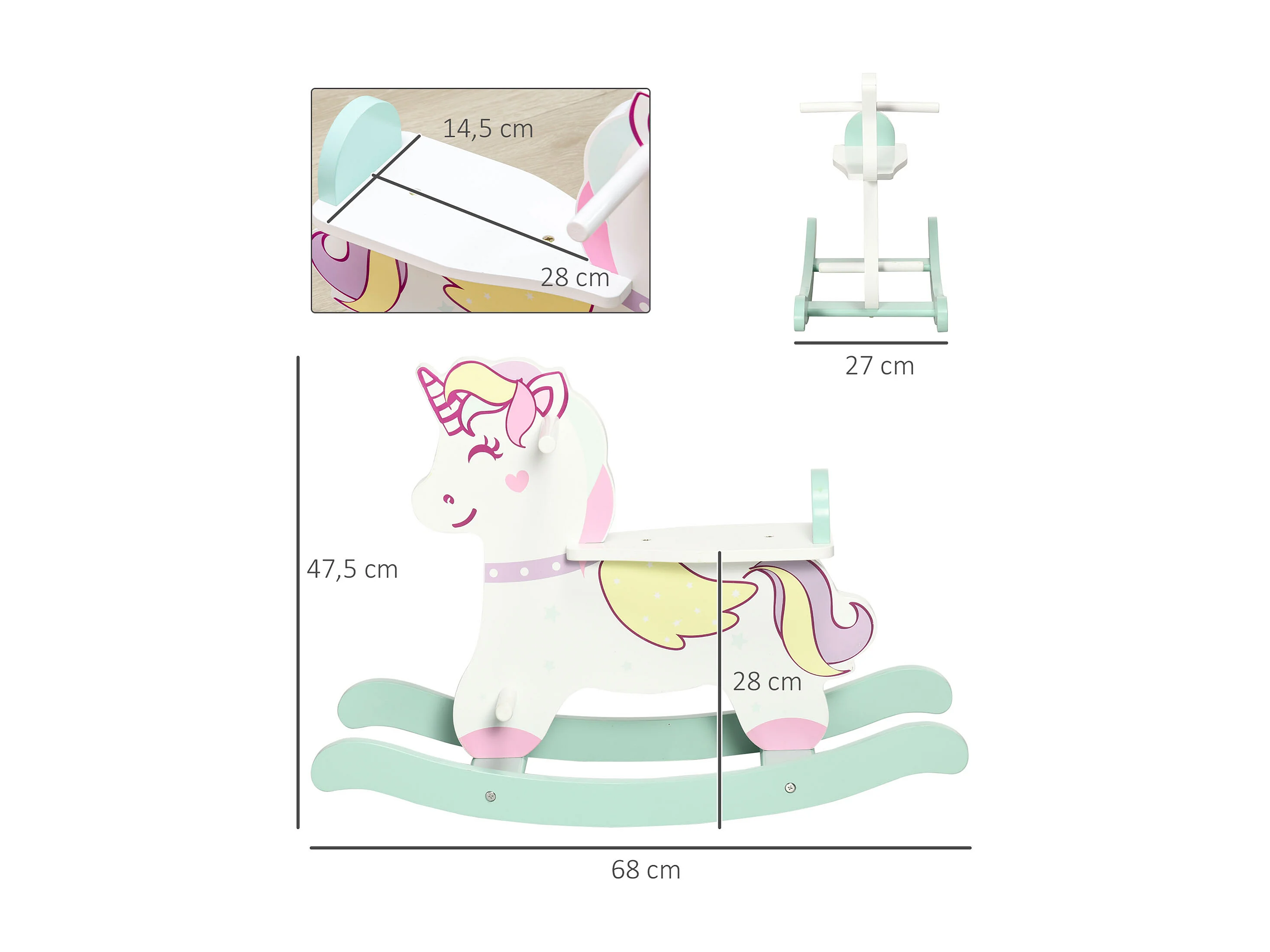 Cheval à bascule licorne en bois - jeu à bascule bois - poignées repose-pied butées - MDF blanc vert rose