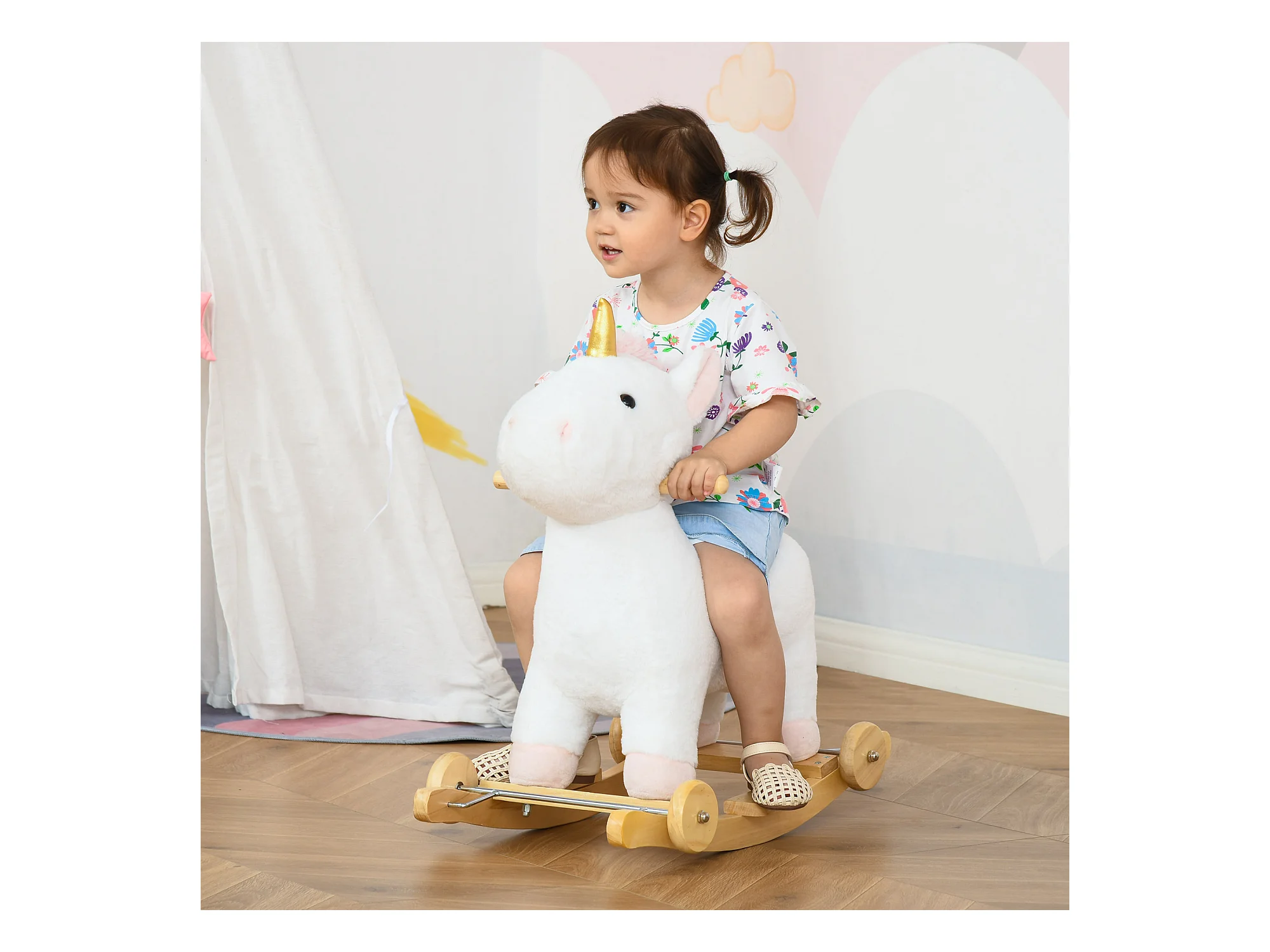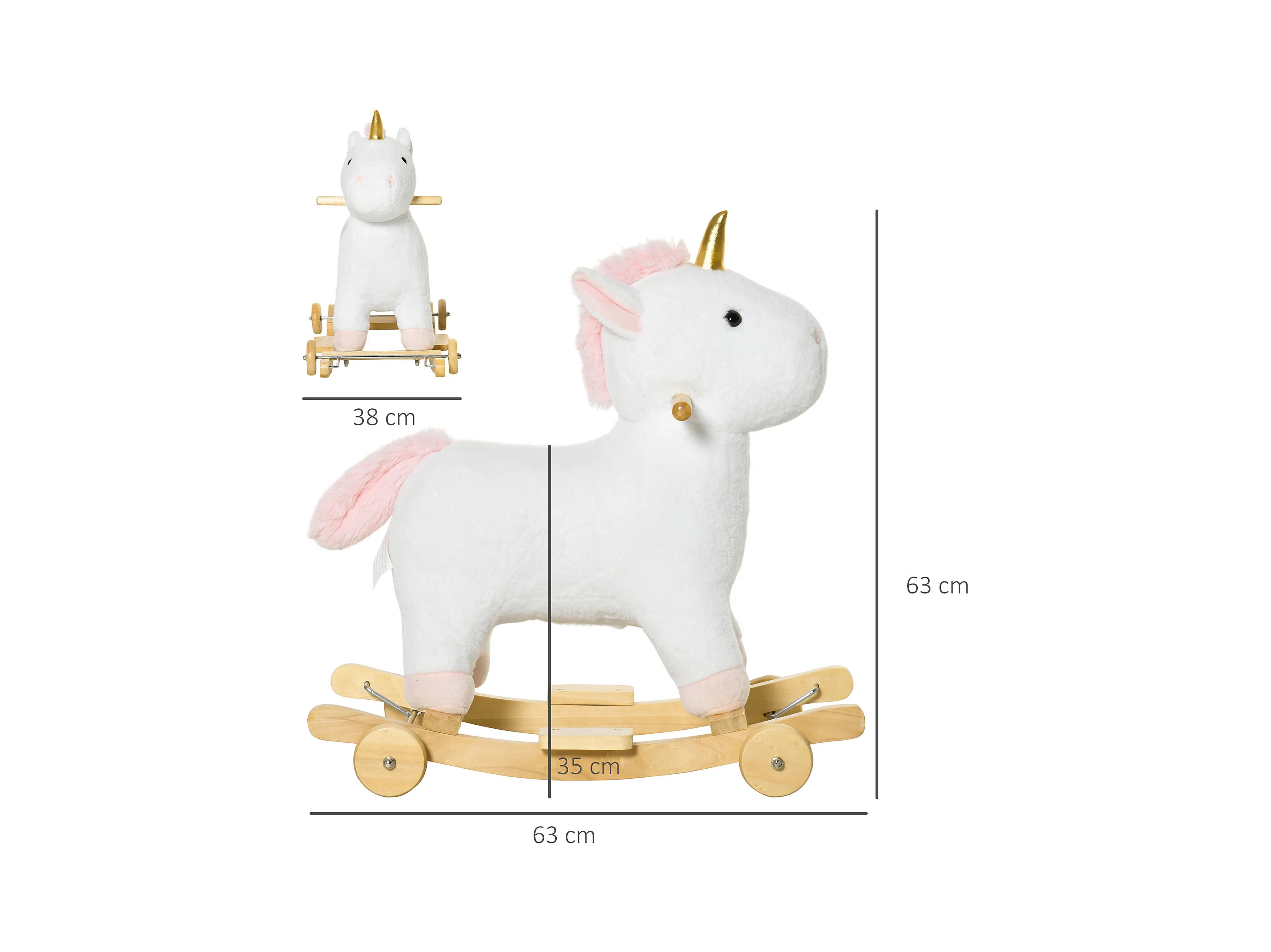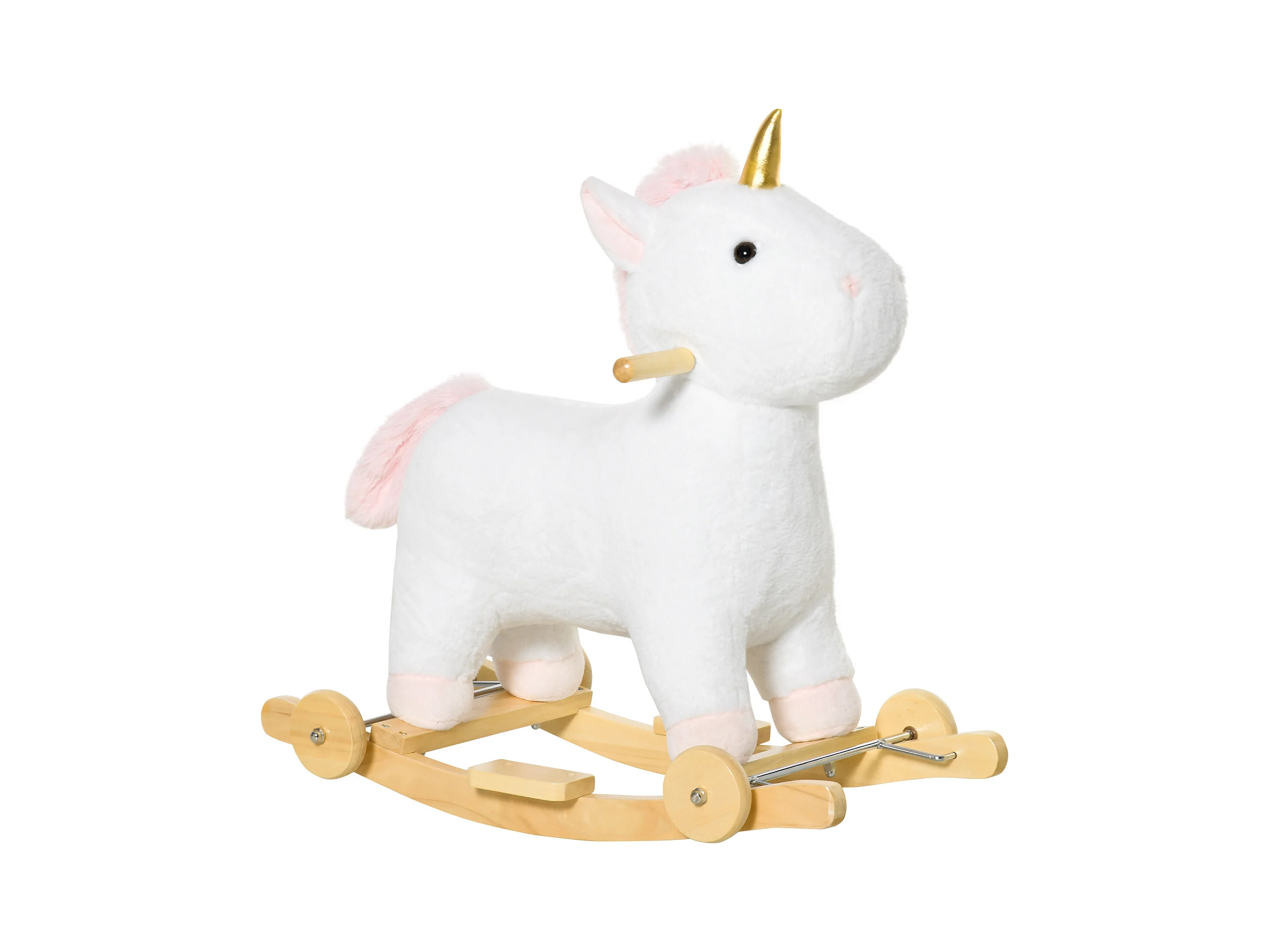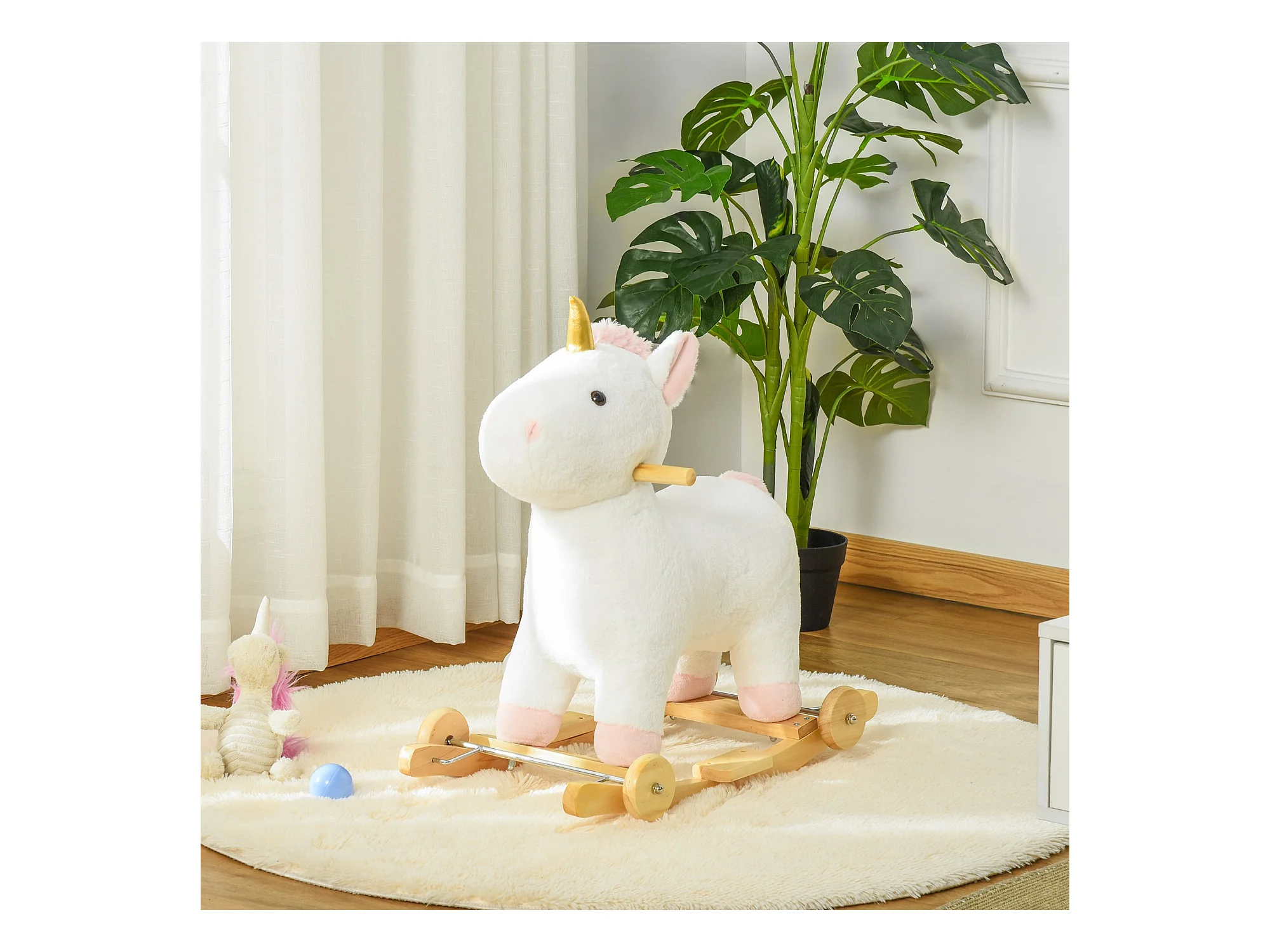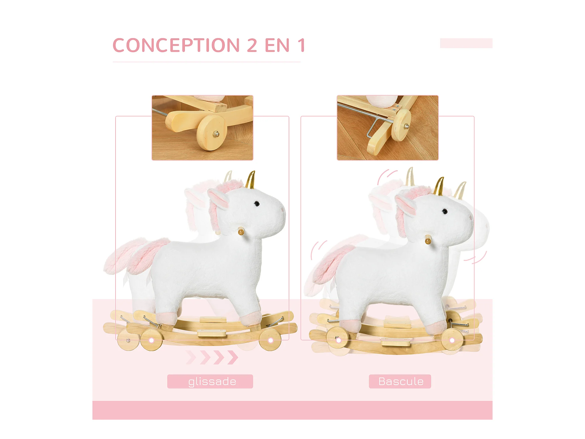Cheval à bascule licorne porteur 2 en 1 - effet sonore - poignée structure bois de peuplier peluche douce blanche