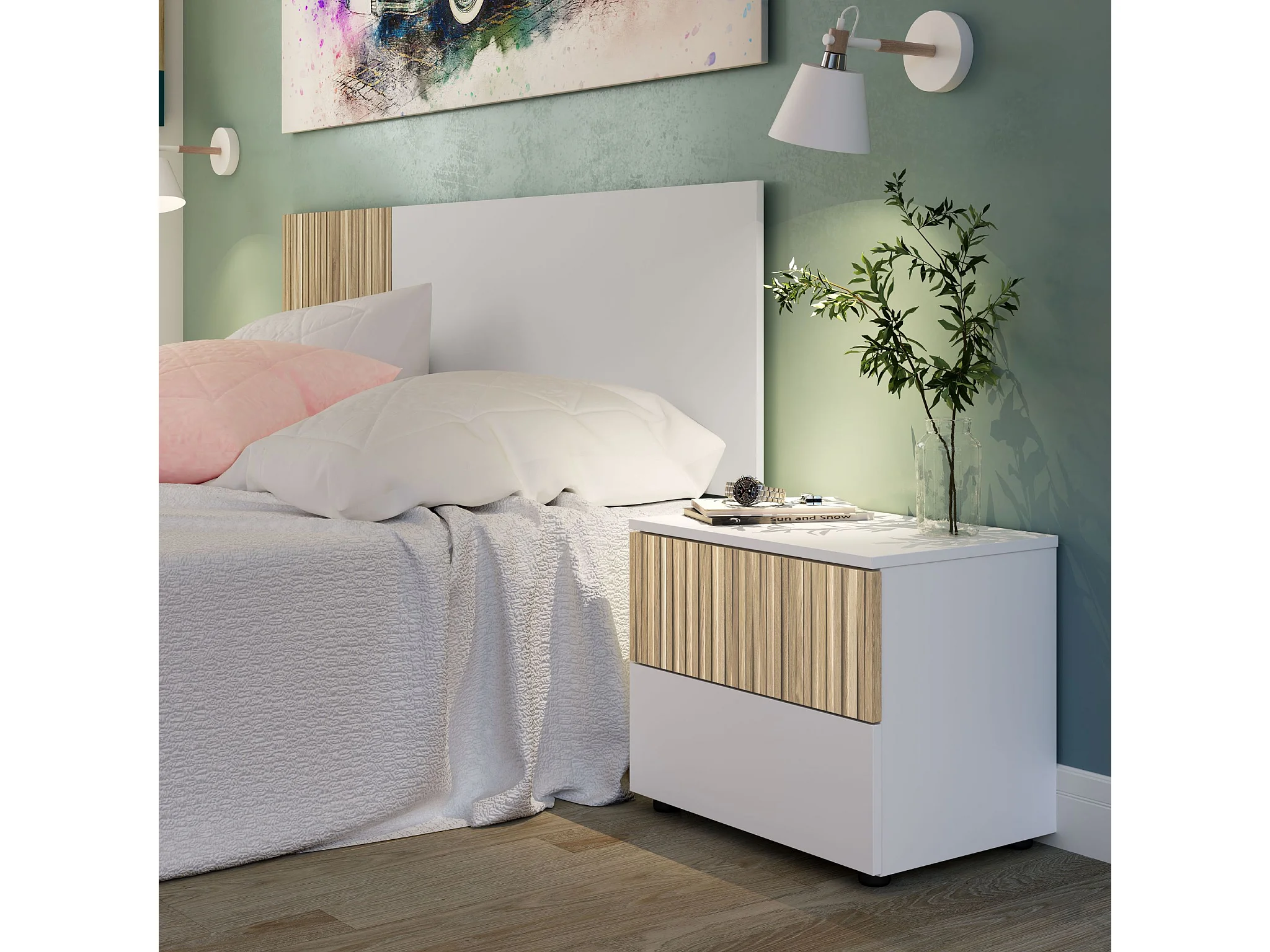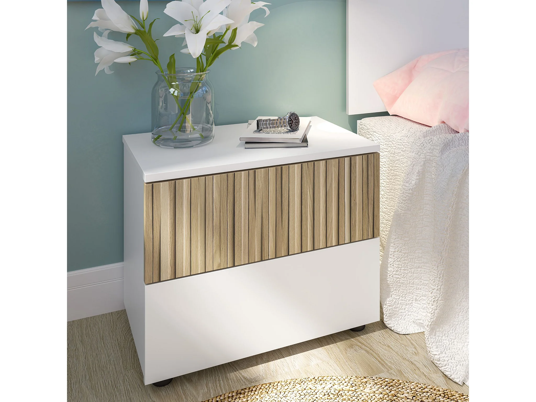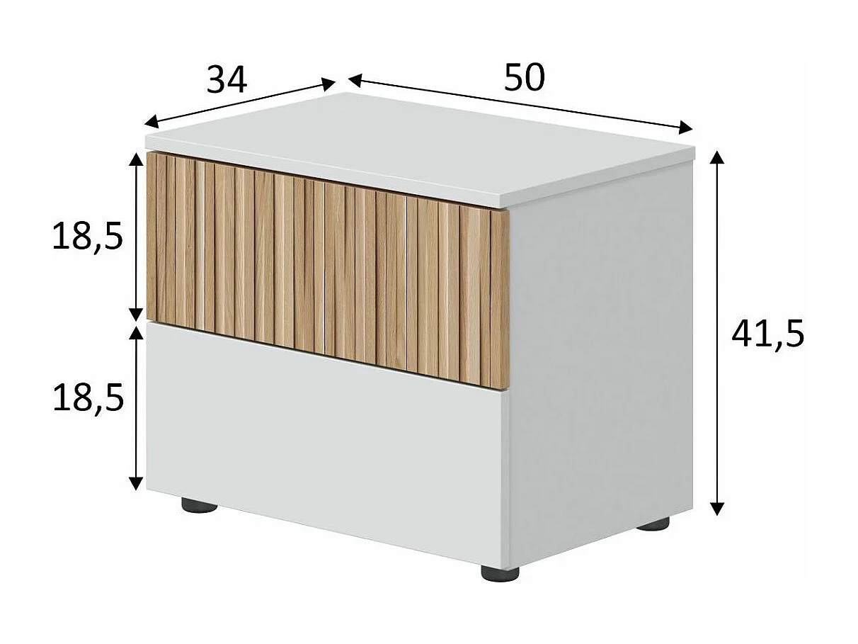 Chevet 2 tiroirs blanc et imprimé effet bois