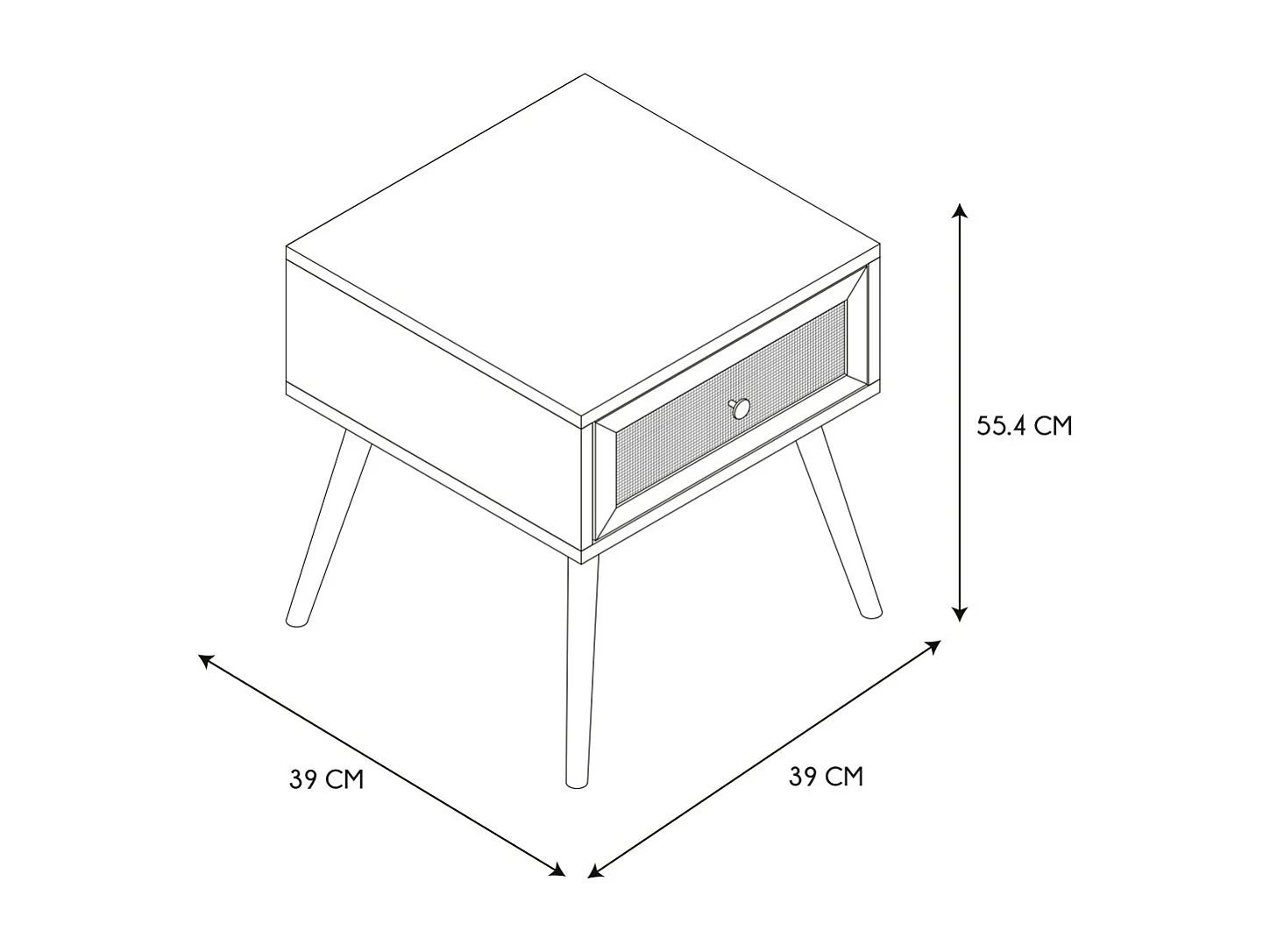 Table de chevet avec tiroirs et étagères, en rotin tressé, dimensions : 40 L x 40 l x 48 H cm, aspect bois clair naturel.