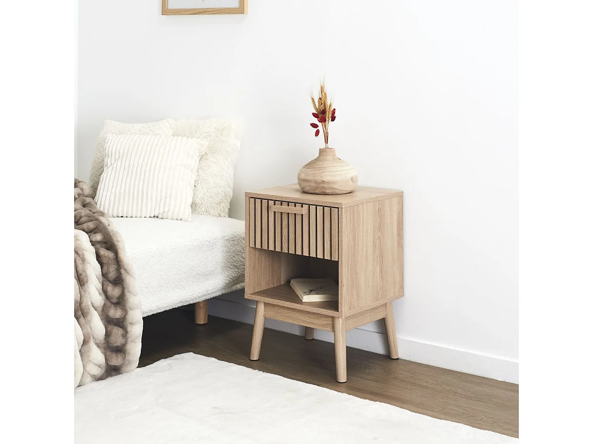 Table de chevet 1 tiroir Kana L40xH55cm Motif Planche en bois clair et Blanc