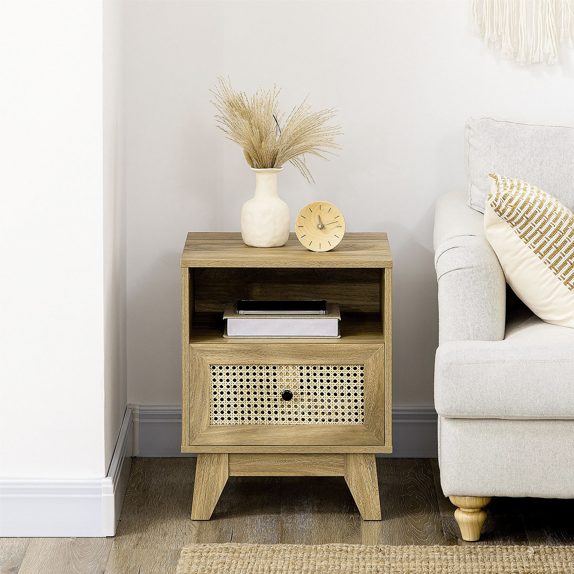 Chevet style bohème - table de nuit design - tiroir, niche - aspect bois manguier rotin