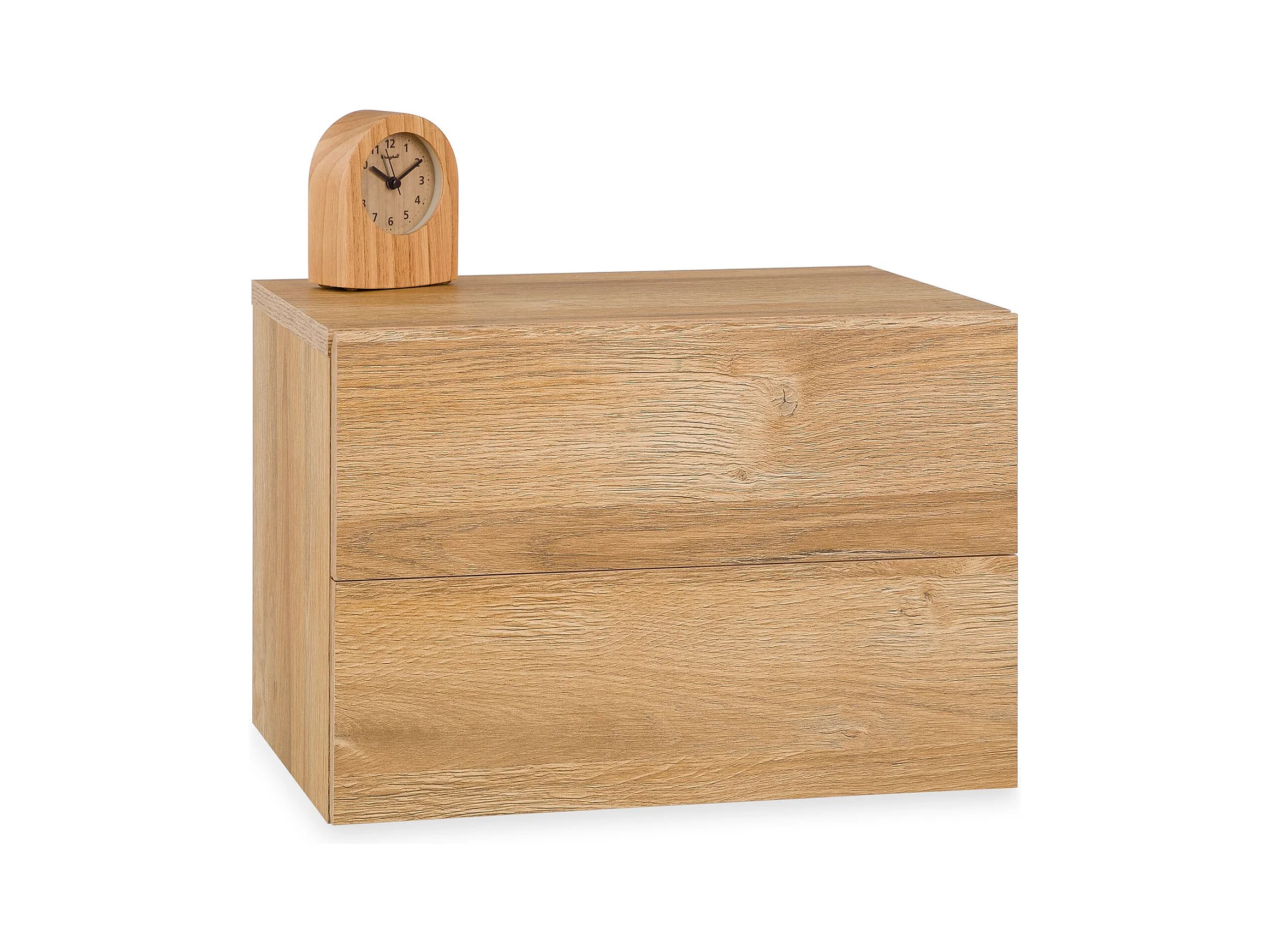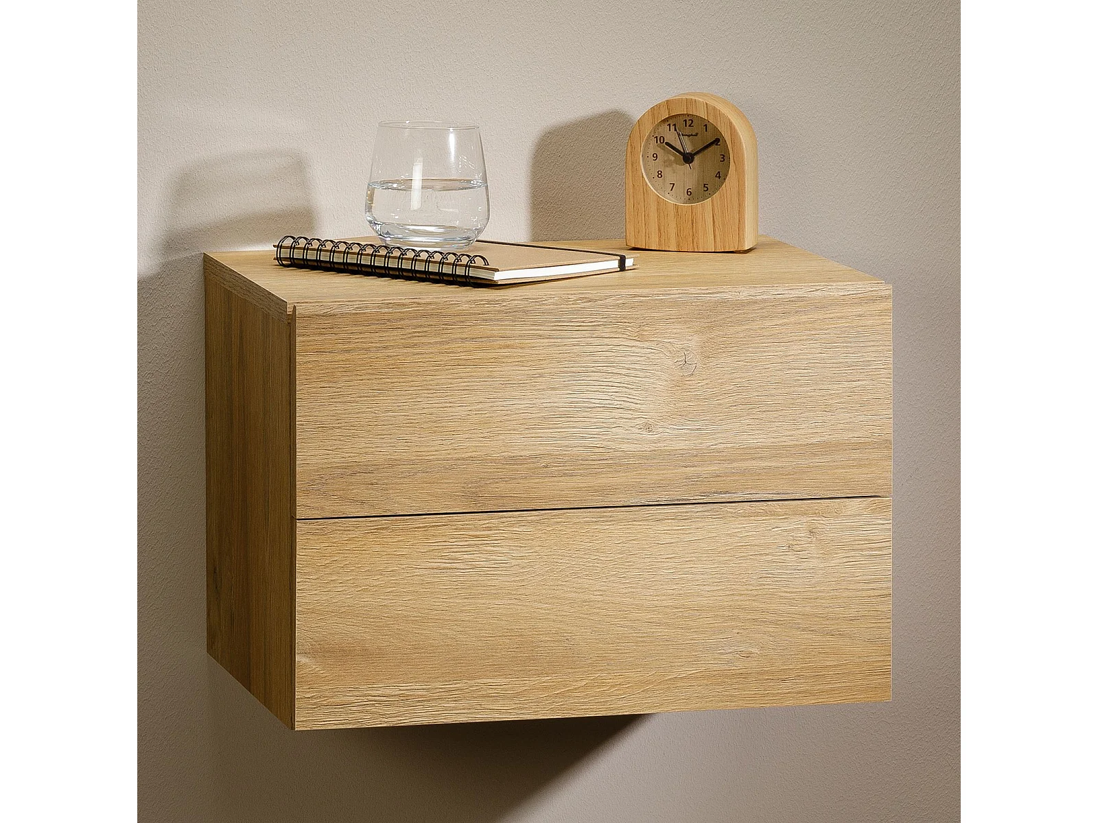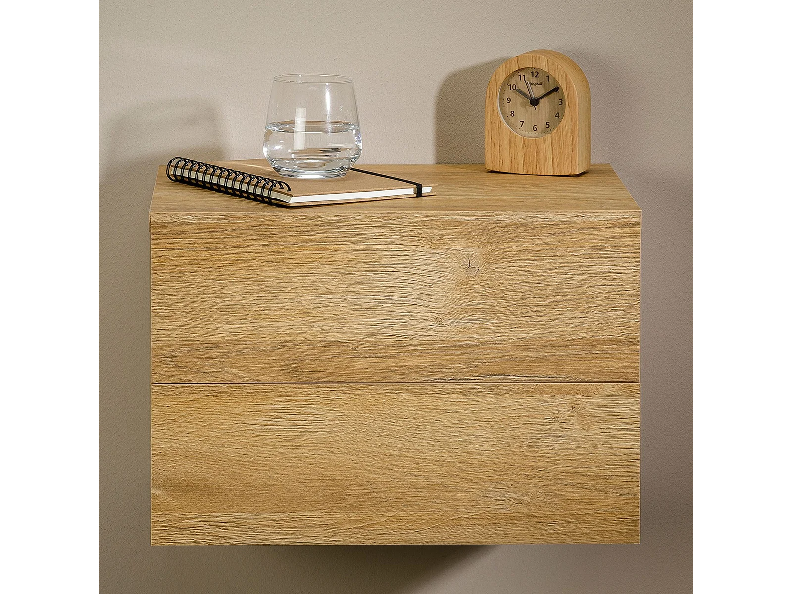 Chevet suspendu FLORENT, étagère murale avec 2 tiroirs sans poignée, en mélaminé décor chêne sauvage