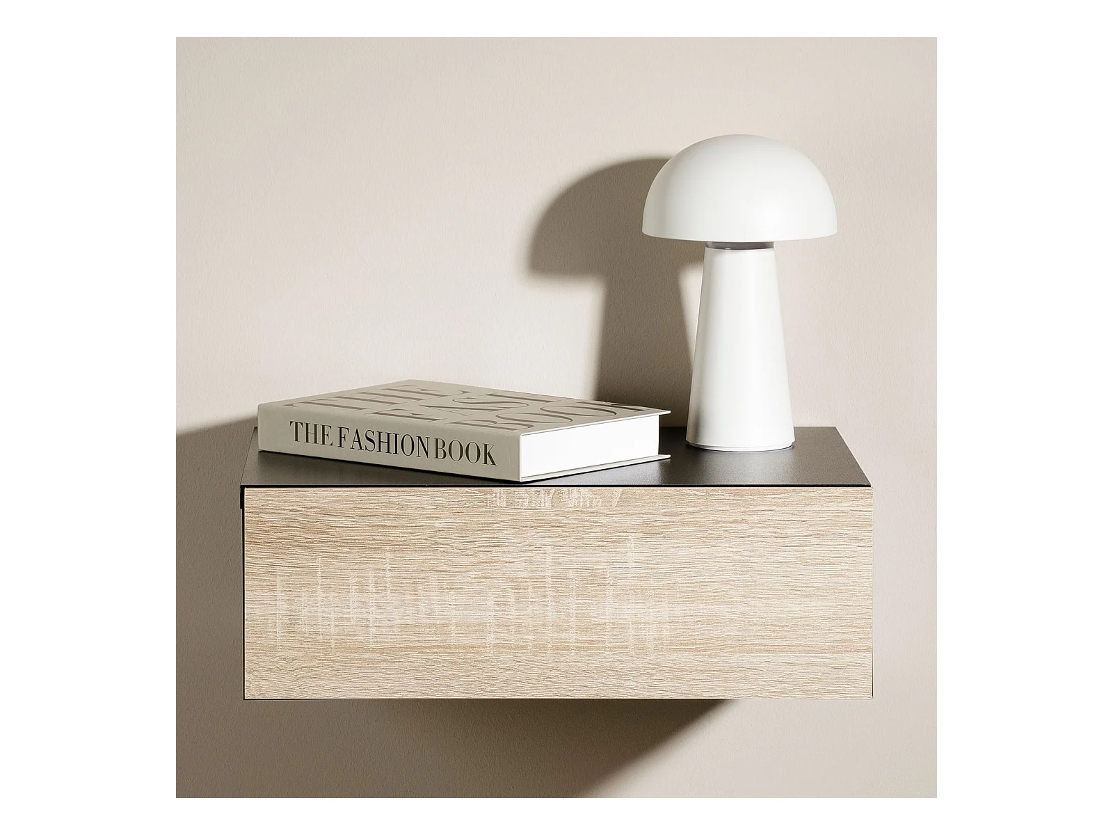 Chevet suspendu OCEANE, en bois noir et sonoma étagère murale avec 1 tiroir sans poignée