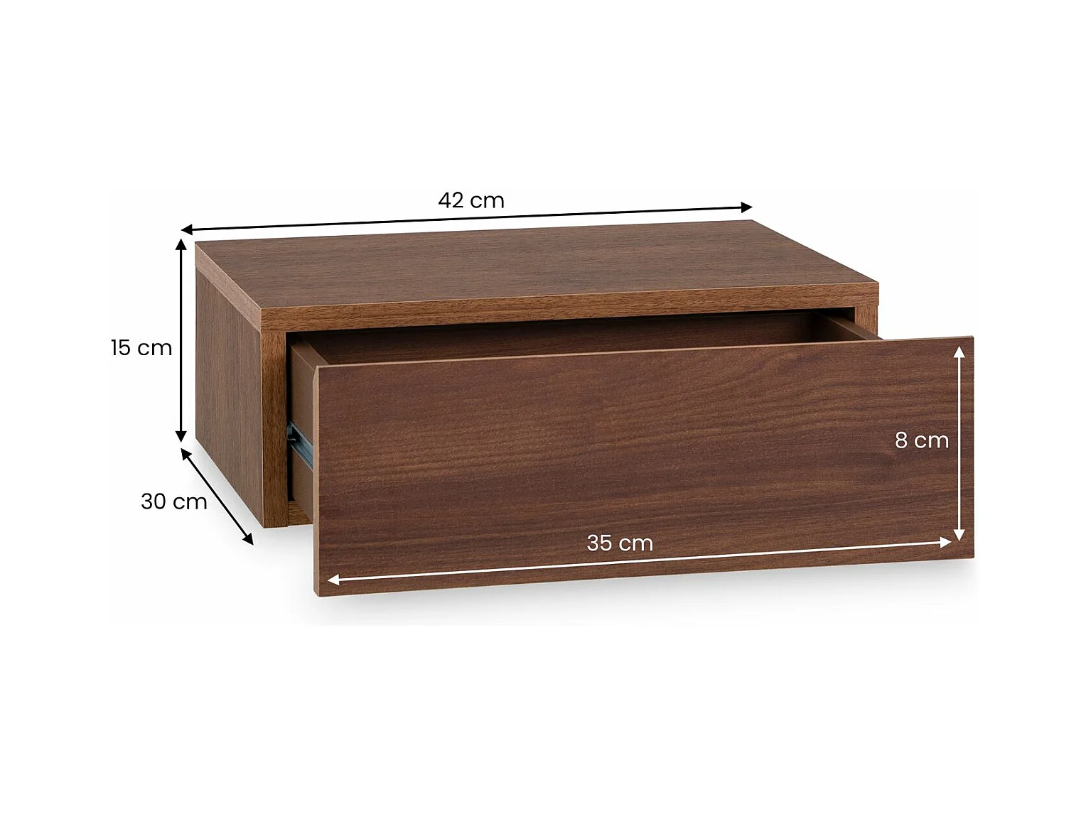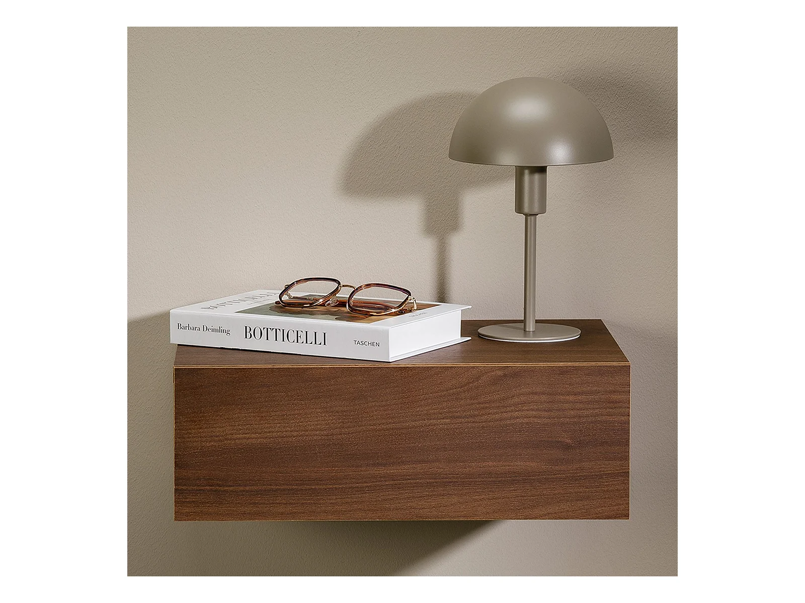 Chevet suspendu OCEANE, étagère murale avec 1 tiroir sans poignée, en bois couleur noyer