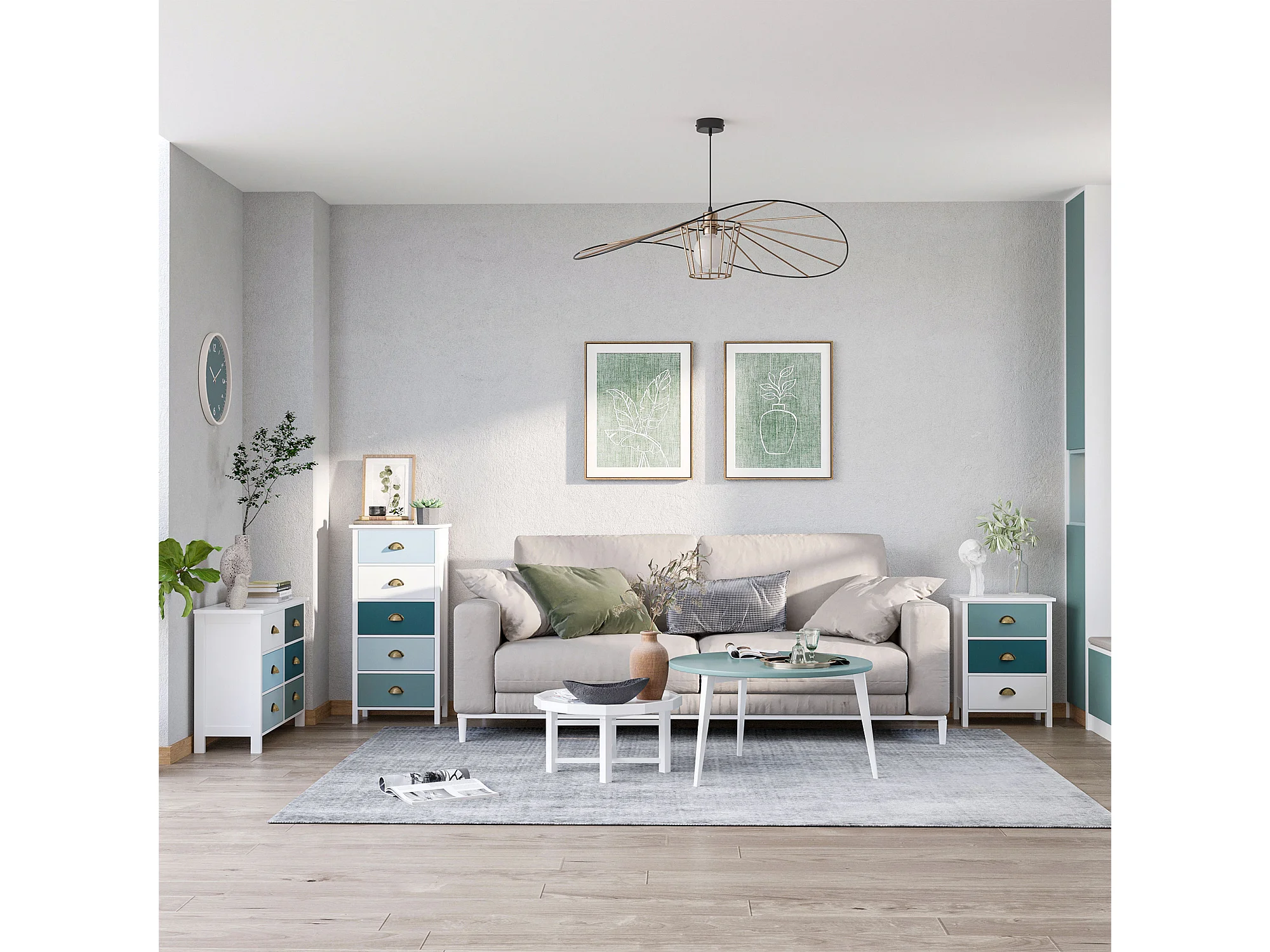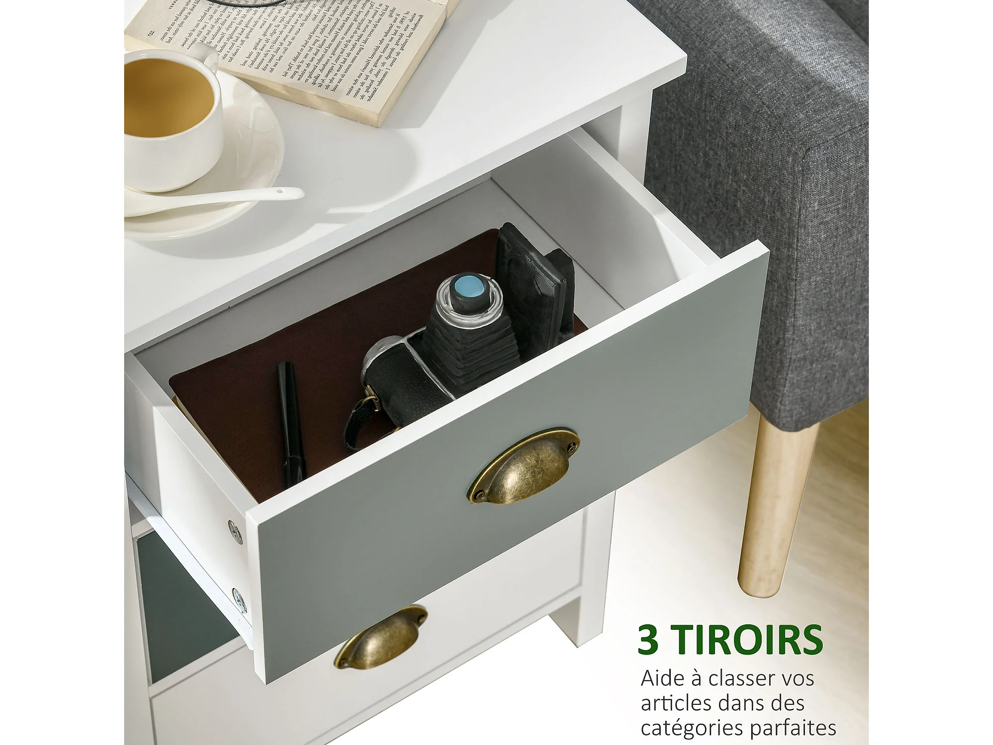 Chevet table de nuit 3 tiroirs style néo-rétro dim. 45L x 30l x 61H cm poignées coquilles MDF blanc bleu gris