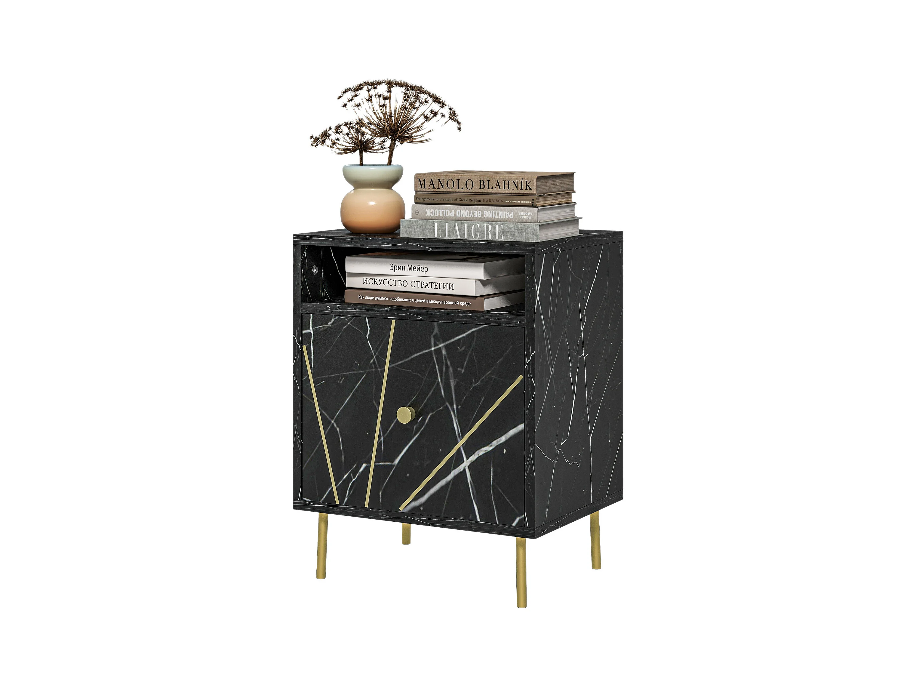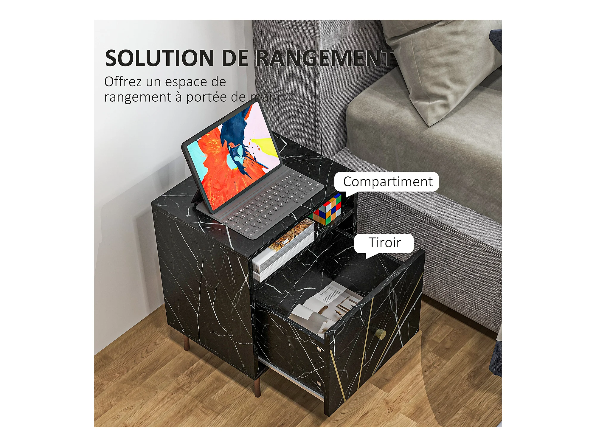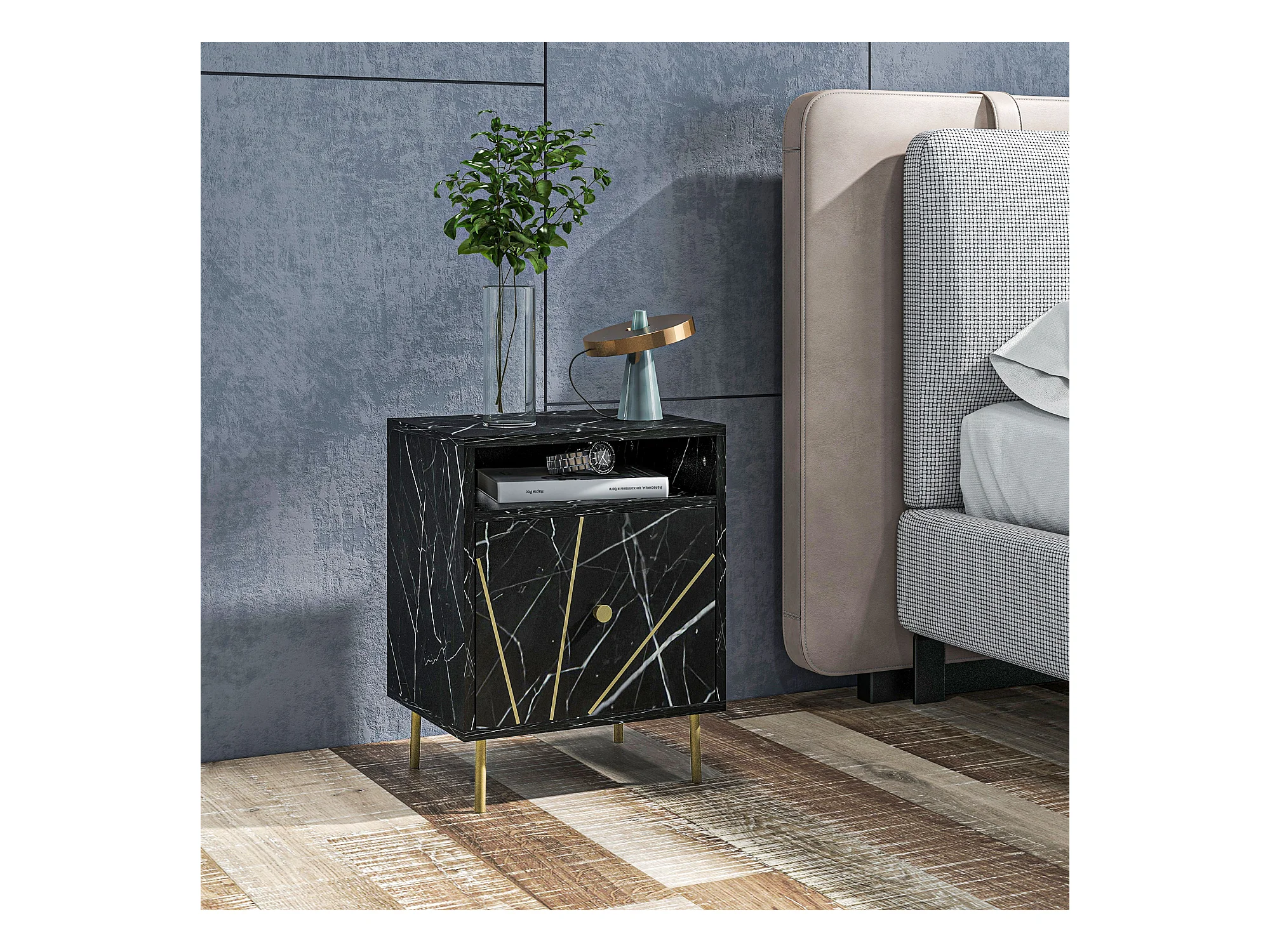 Chevet table de nuit design - tiroir, niche - doré aspect marbre noir