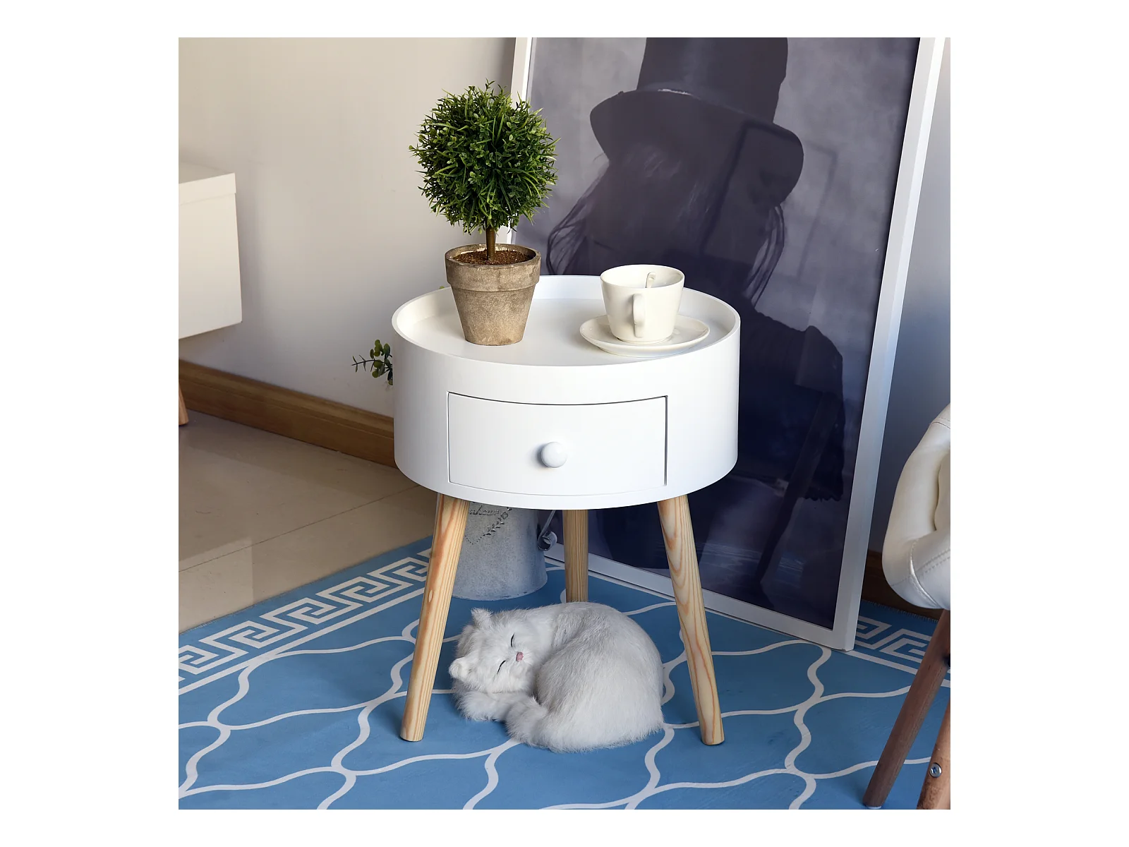 Chevet table de nuit ronde design scandinave tiroir bicolore pieds effilés inclinés bois massif chêne clair blanc