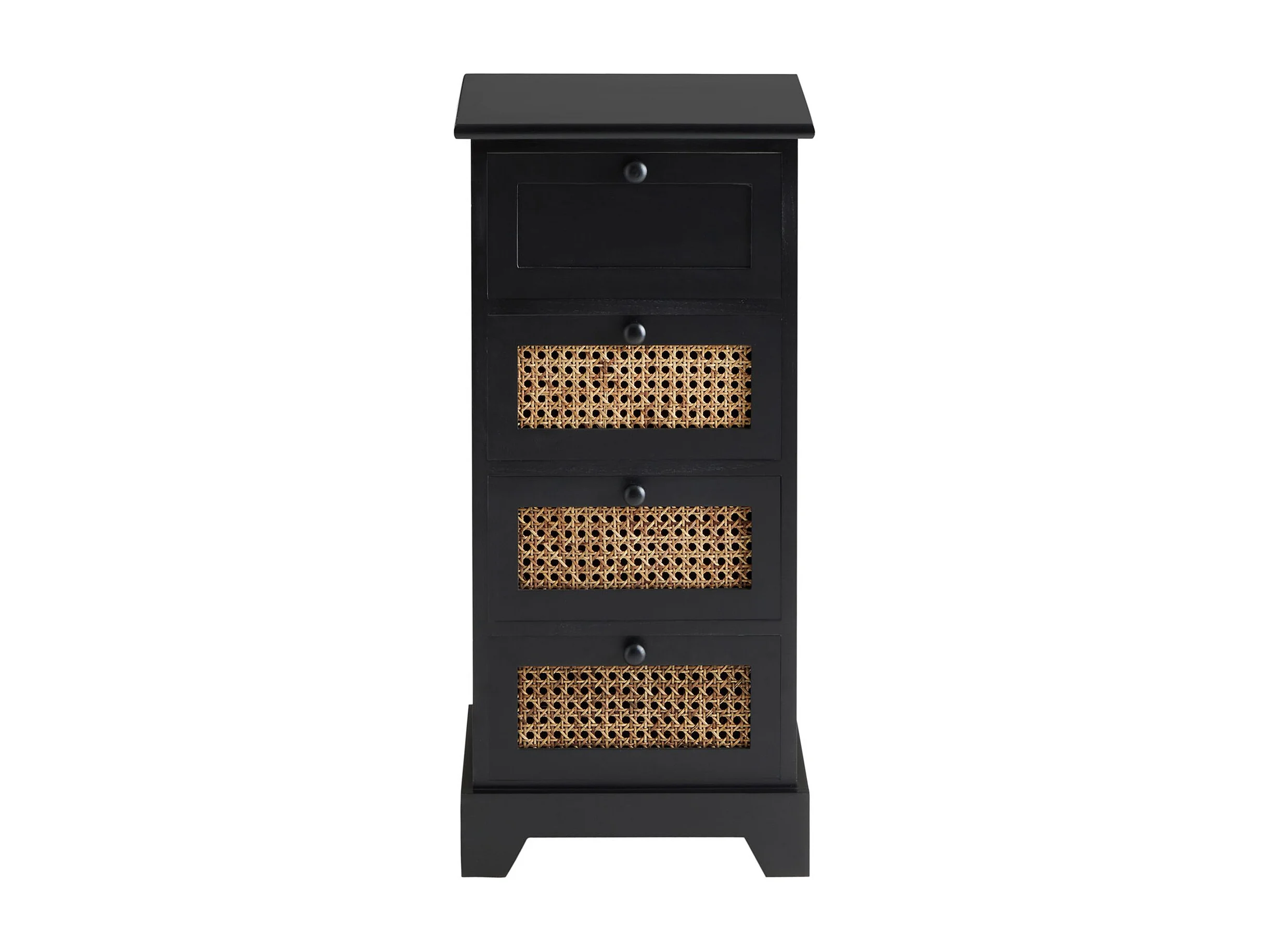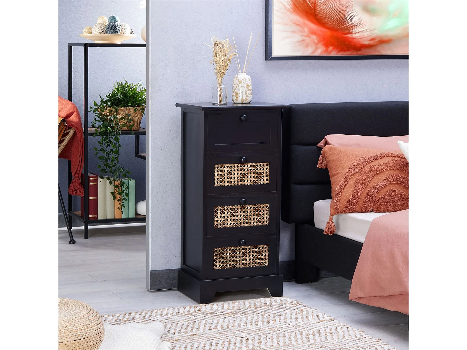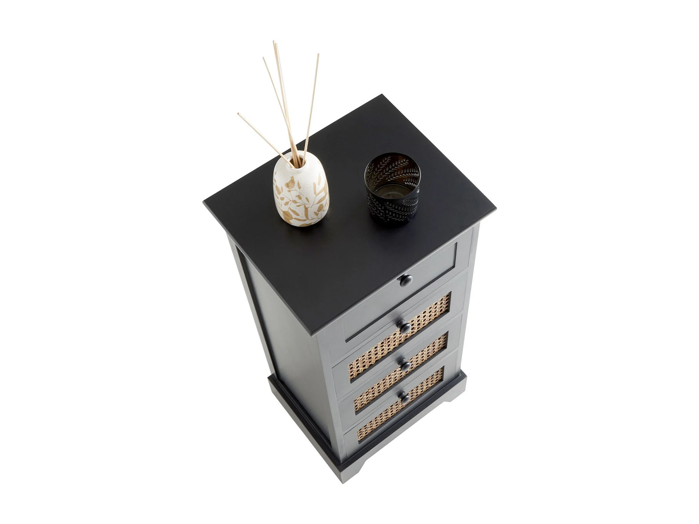 Chiffonnier JASMIN petite commode avec 4 tiroirs, style vintage bohême, en bois de paulownia lasuré noir et rotin