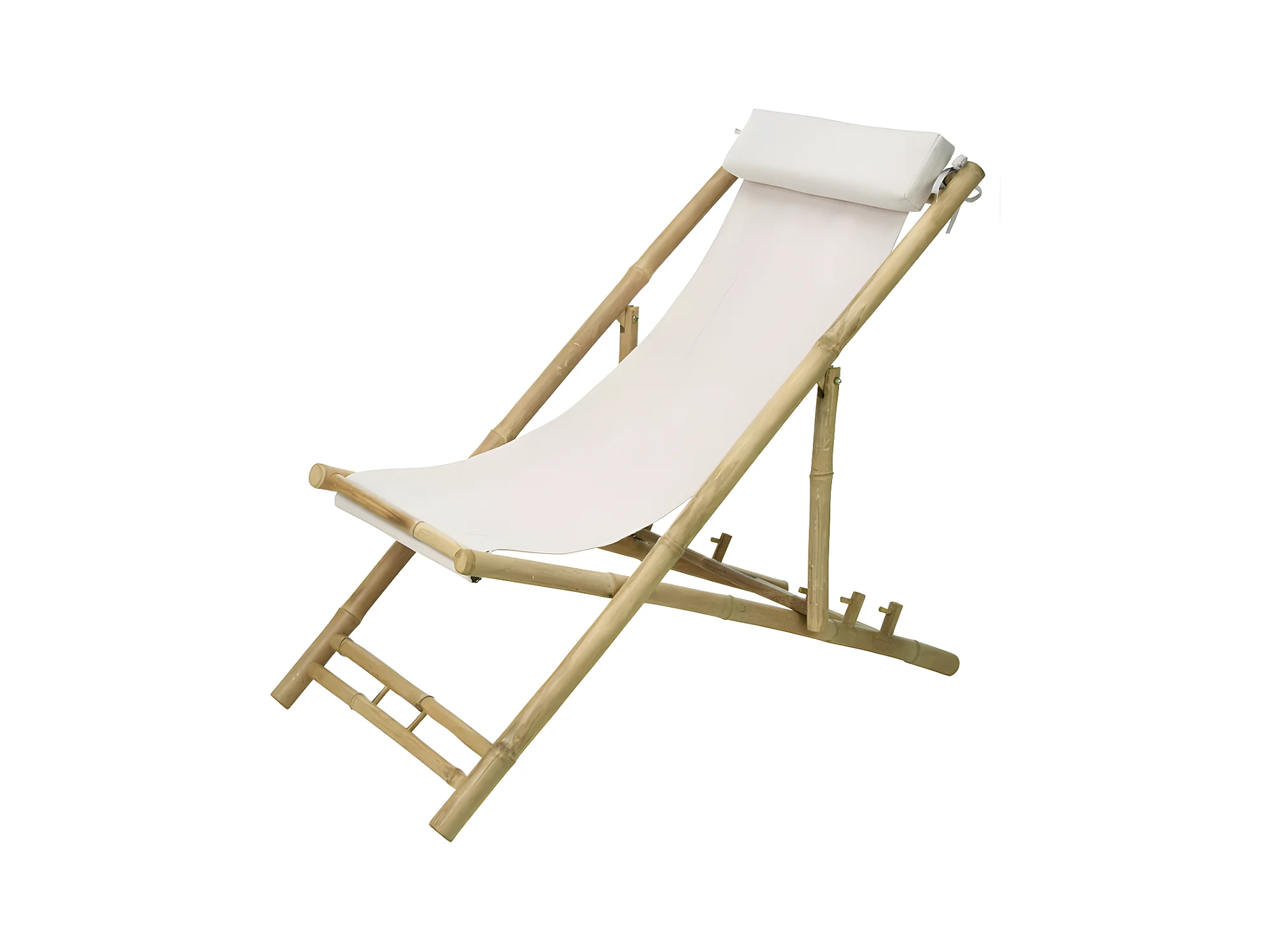 Chaise longue de jardin pliable beige en bois chilienne 3 positions de couchage jusqu'à 120 kg usage intérieur et extérieur balcon terrasse patio