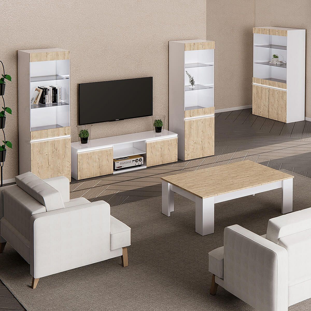 CHRIS OAK - Salon Complet avec Vitrine 2P Laqué Blanc Brillant Aspect Bois