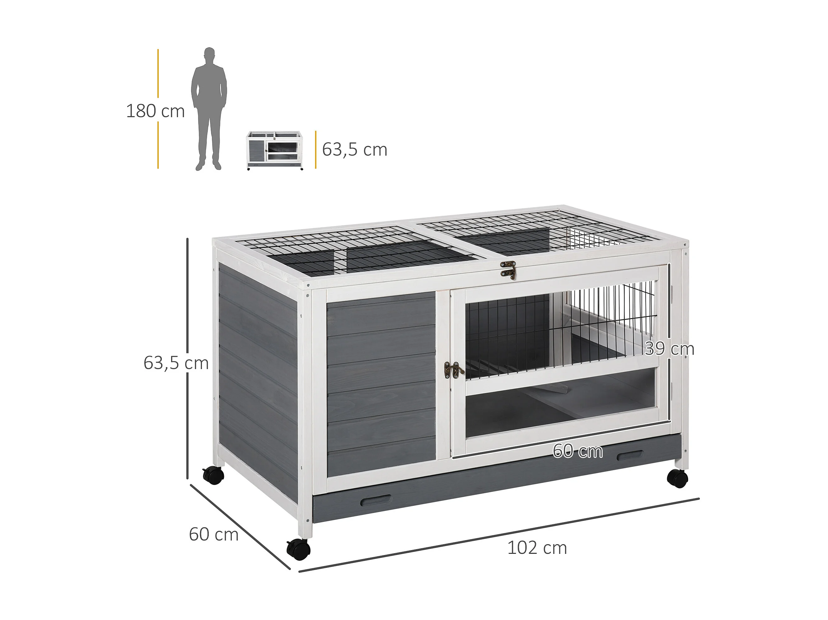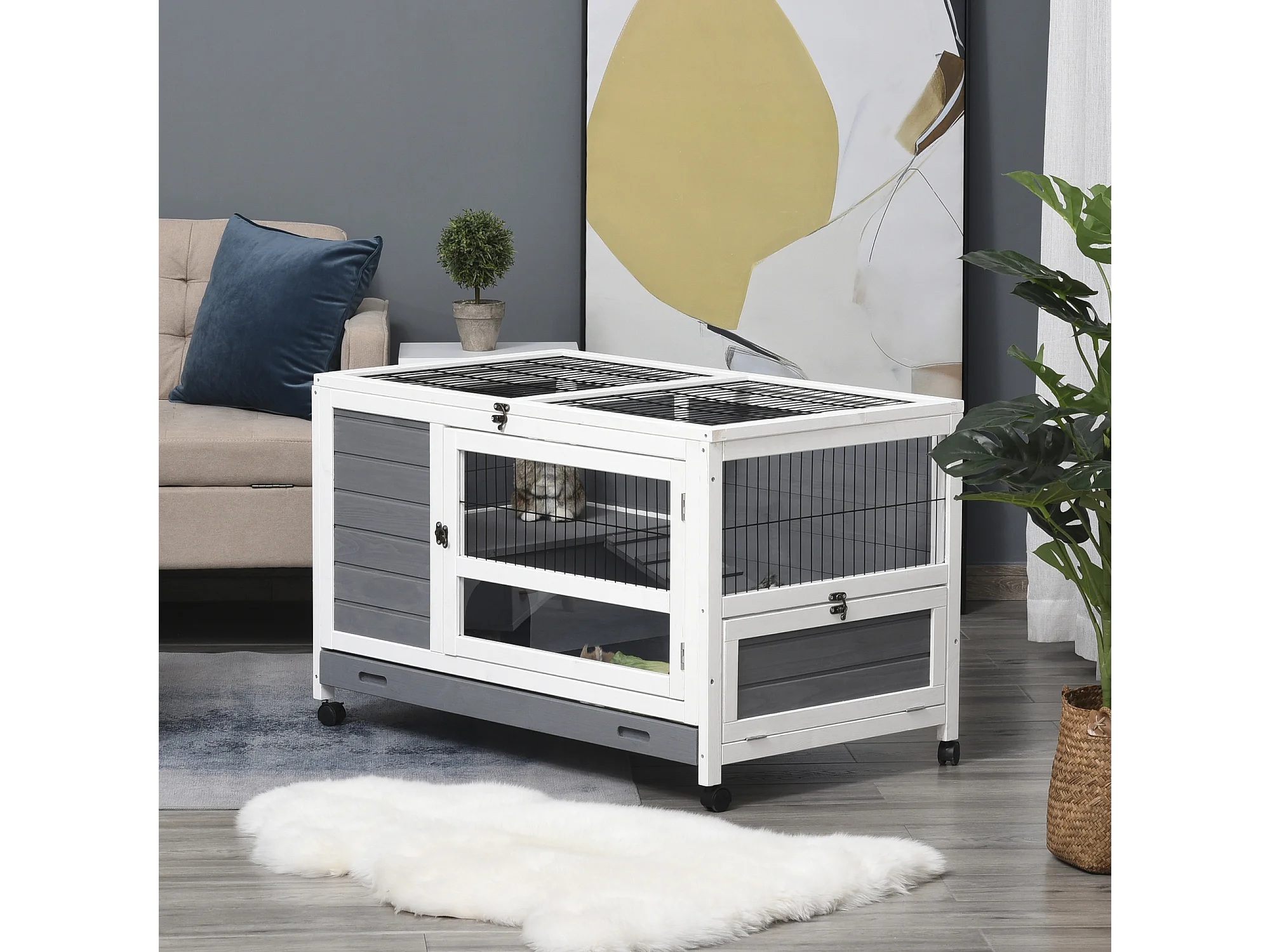 Clapier à lapin sur roulettes cage à lapin 2 niv. 2 portes verrouillables toit ouvrant plateau coulissant rampe bois gris blanc